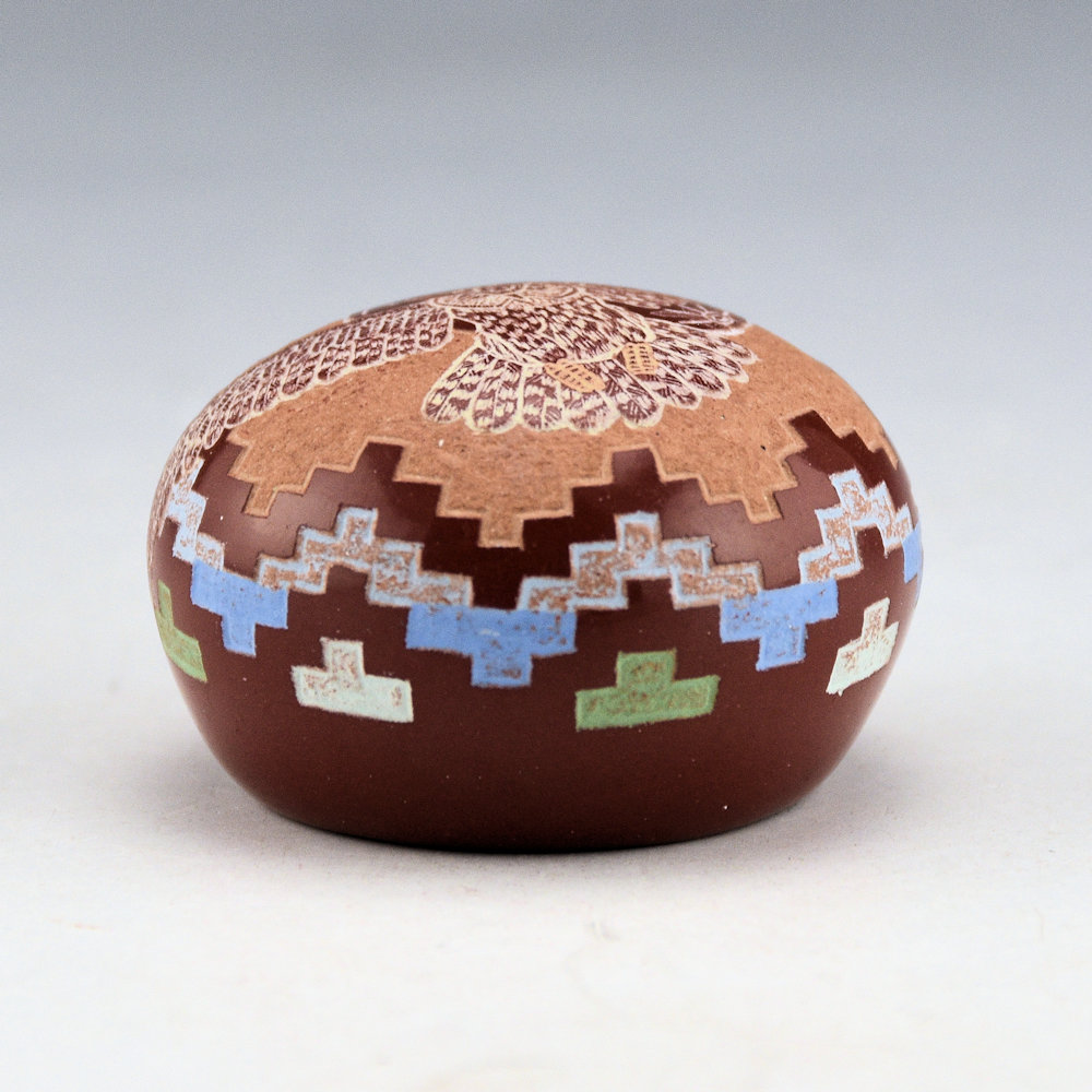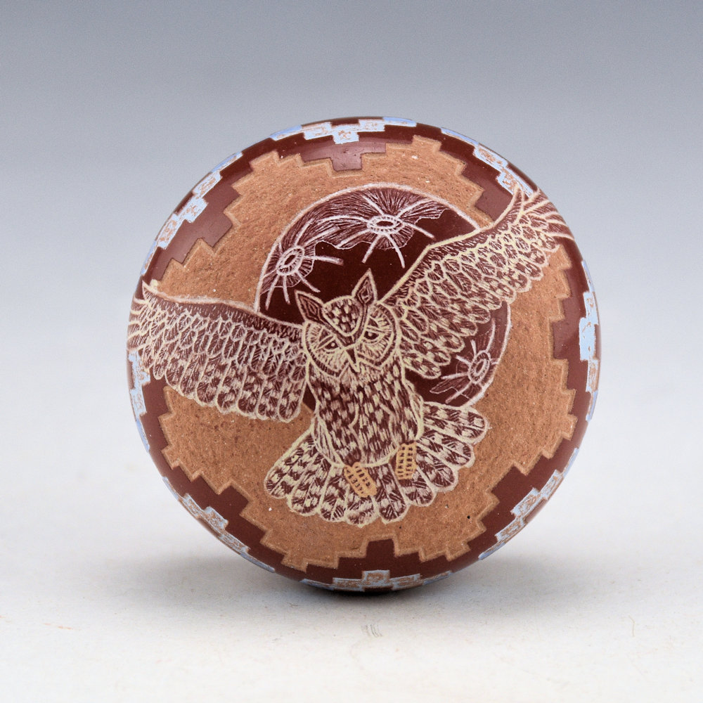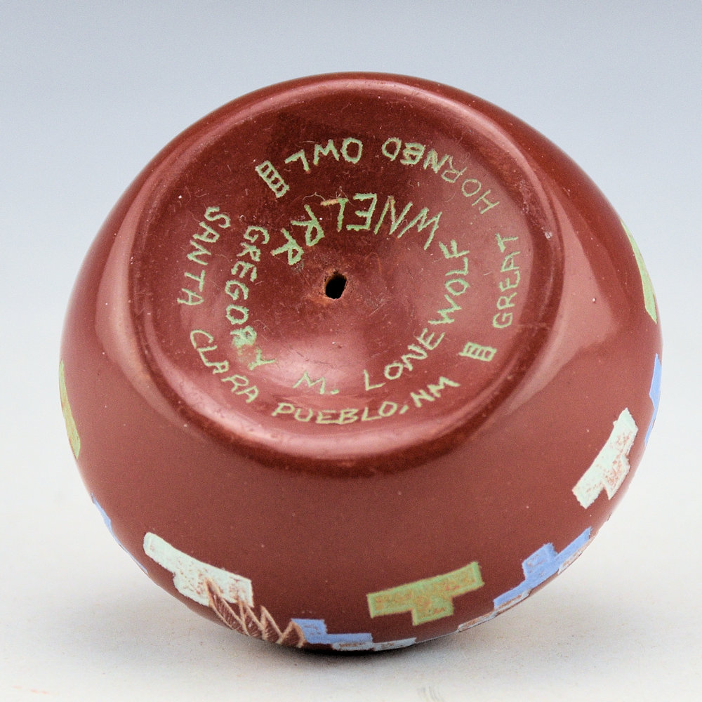 Greg Lonewolf is the son of Joseph Lonewolf and is known for his intricately incised miniatures. This seedpot is entitled, “Great Horned Owl”. The owl is flying with its wings spread in front of a full moon. The sides have a subtle night sky appearance in blues. It is signed on the bottom in the clay, “Gregory Lonewolf”. It is in excellent condition with no chips, cracks, restoration or repair.