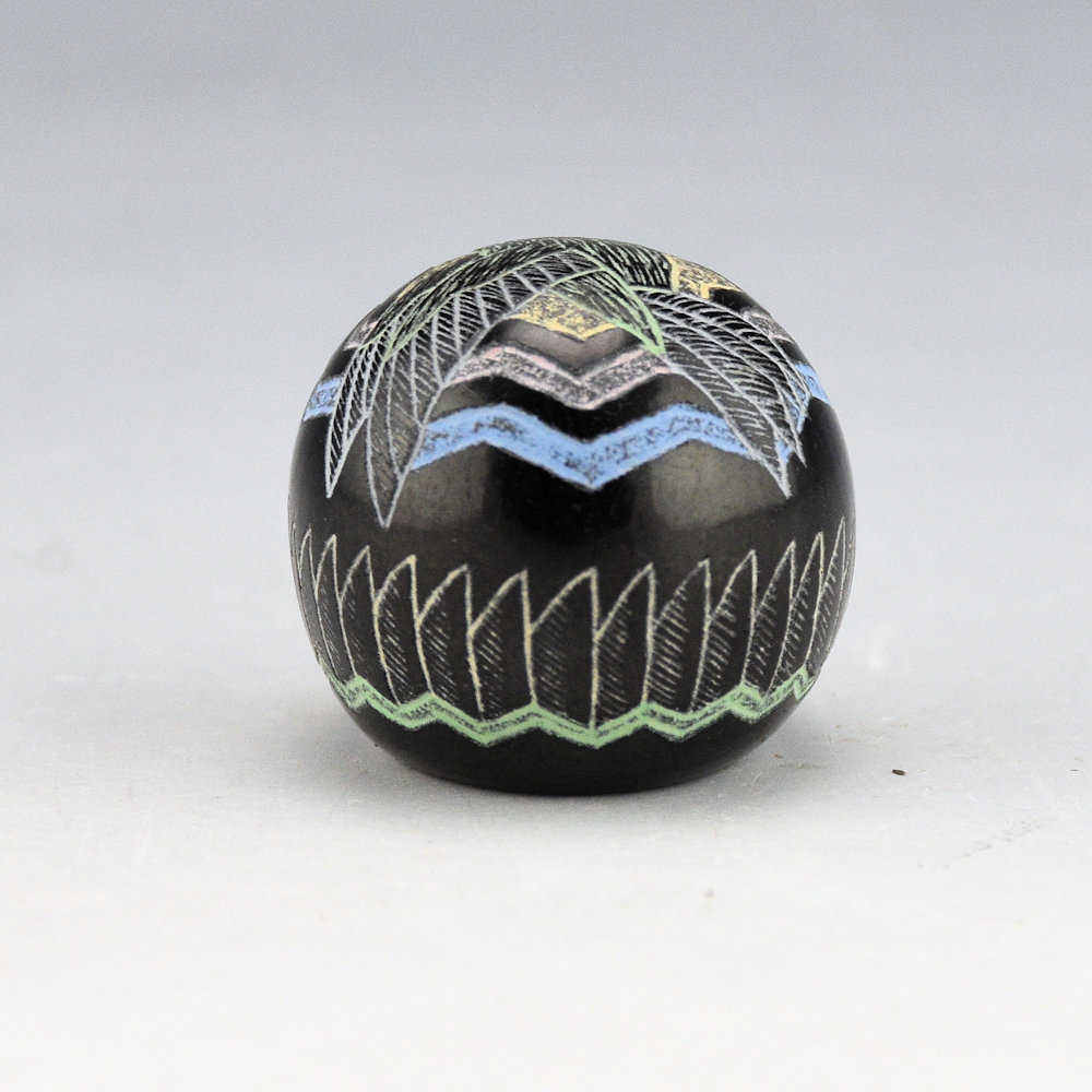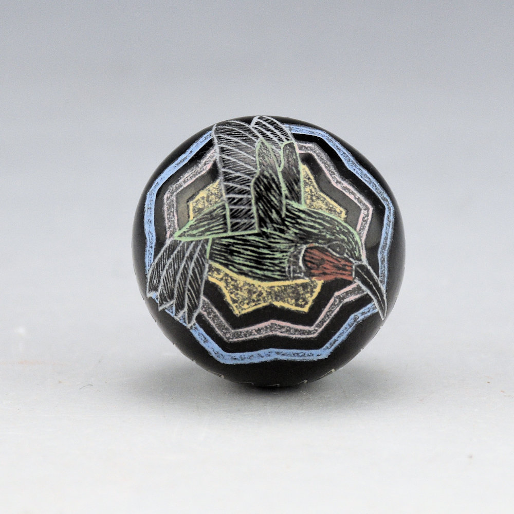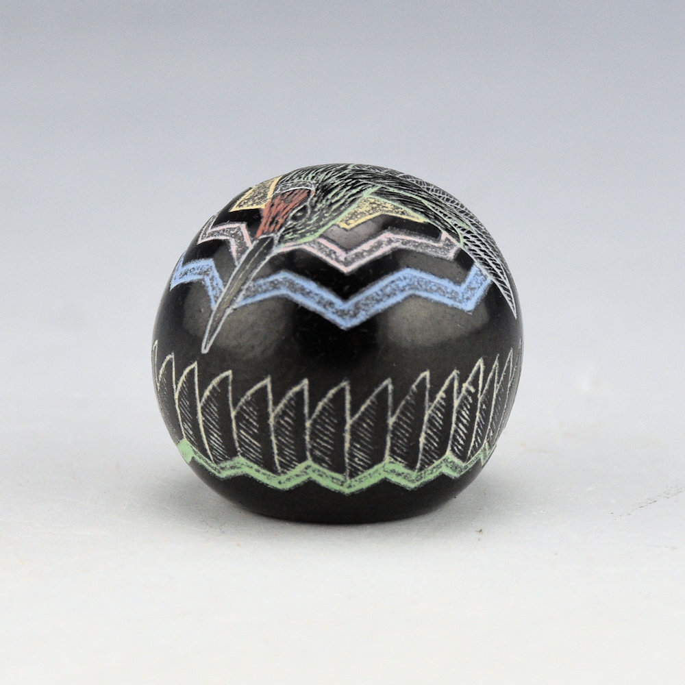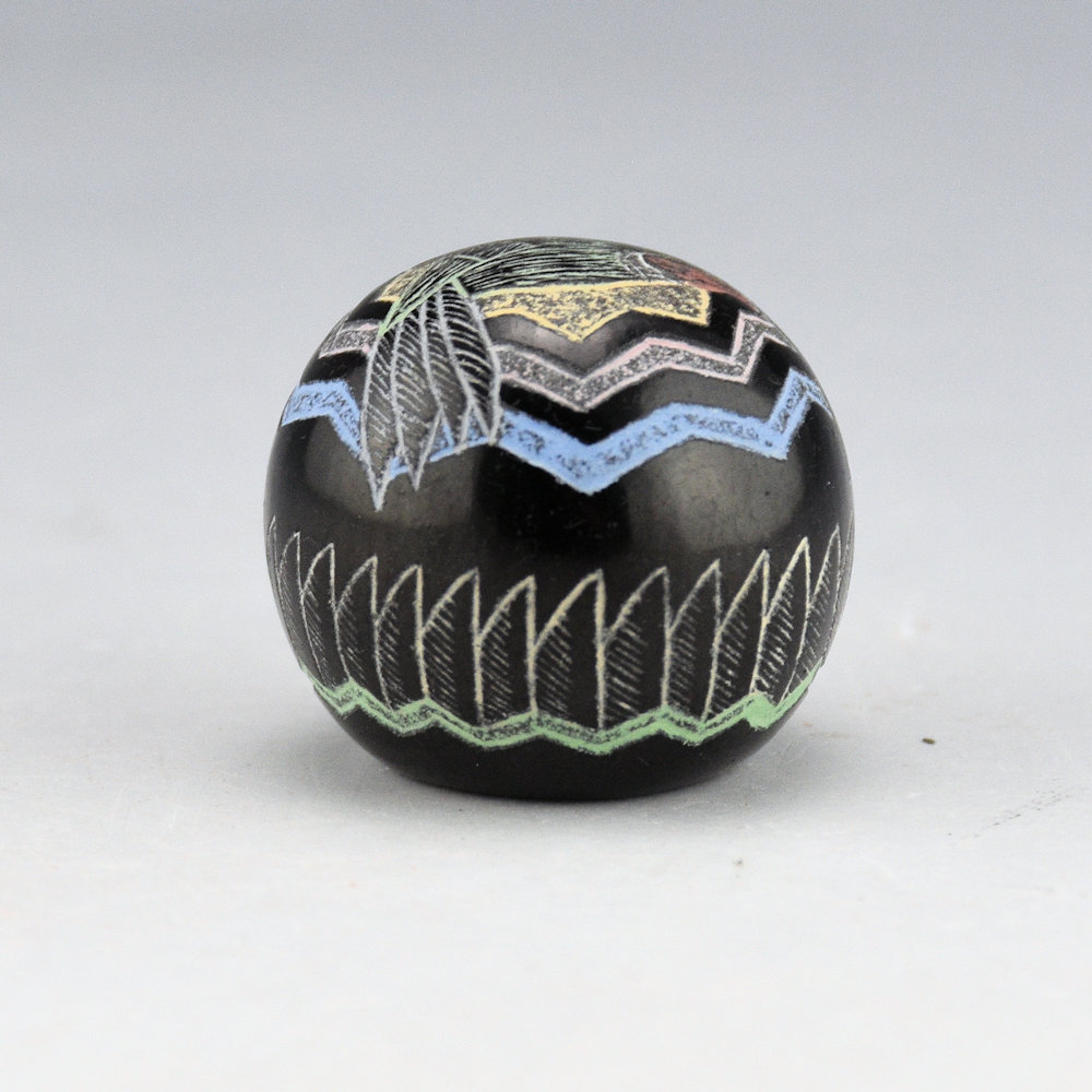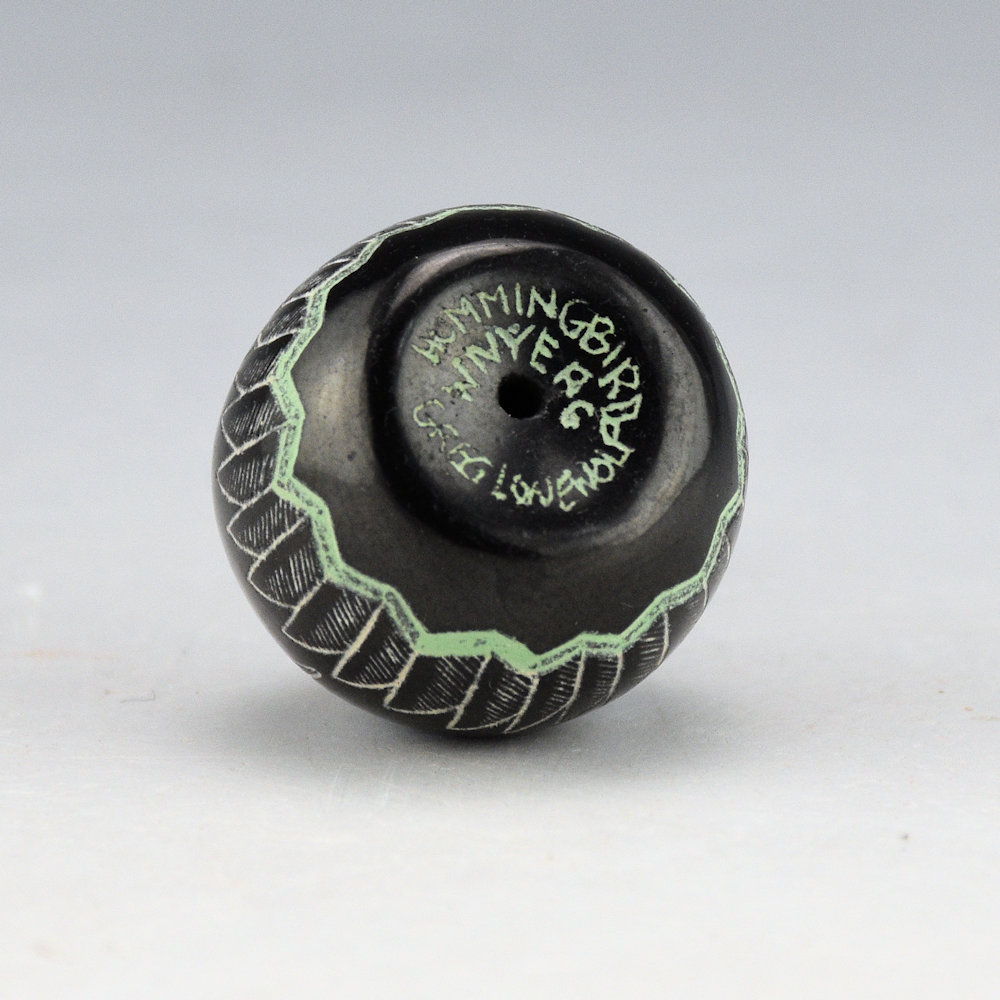 Greg Lonewolf is the son of Joseph Lonewolf and is known for his intricately incised miniatures. This seedpot is one of his few black fired pieces and also among his smallest. There is a large hummingbird on the top. Around the side is a feather pattern. All the various colors are additional clay slips. which are added after the black firing. The seedpot is entitled, “Hummingbird”. It is signed on the bottom, “Gregory Lonewolf”. It is in excellent condition with no chips, cracks, restoration or repair.
