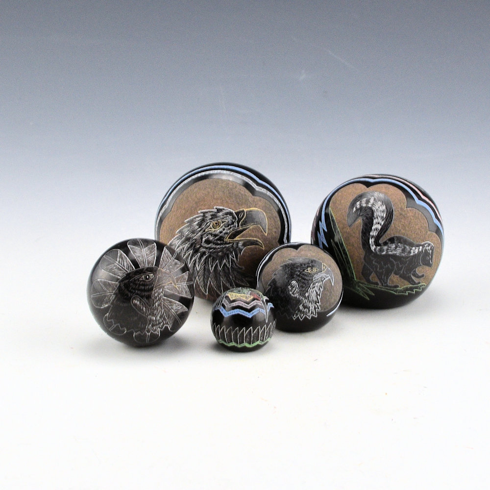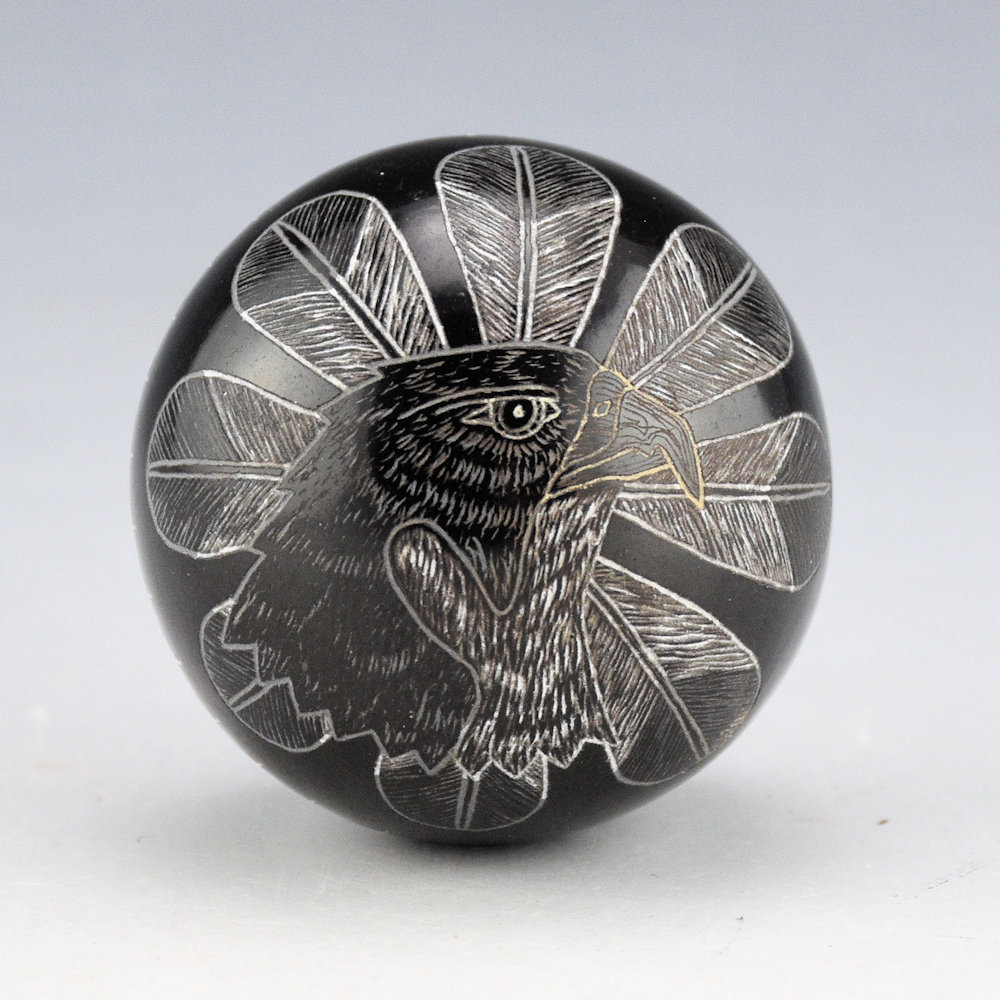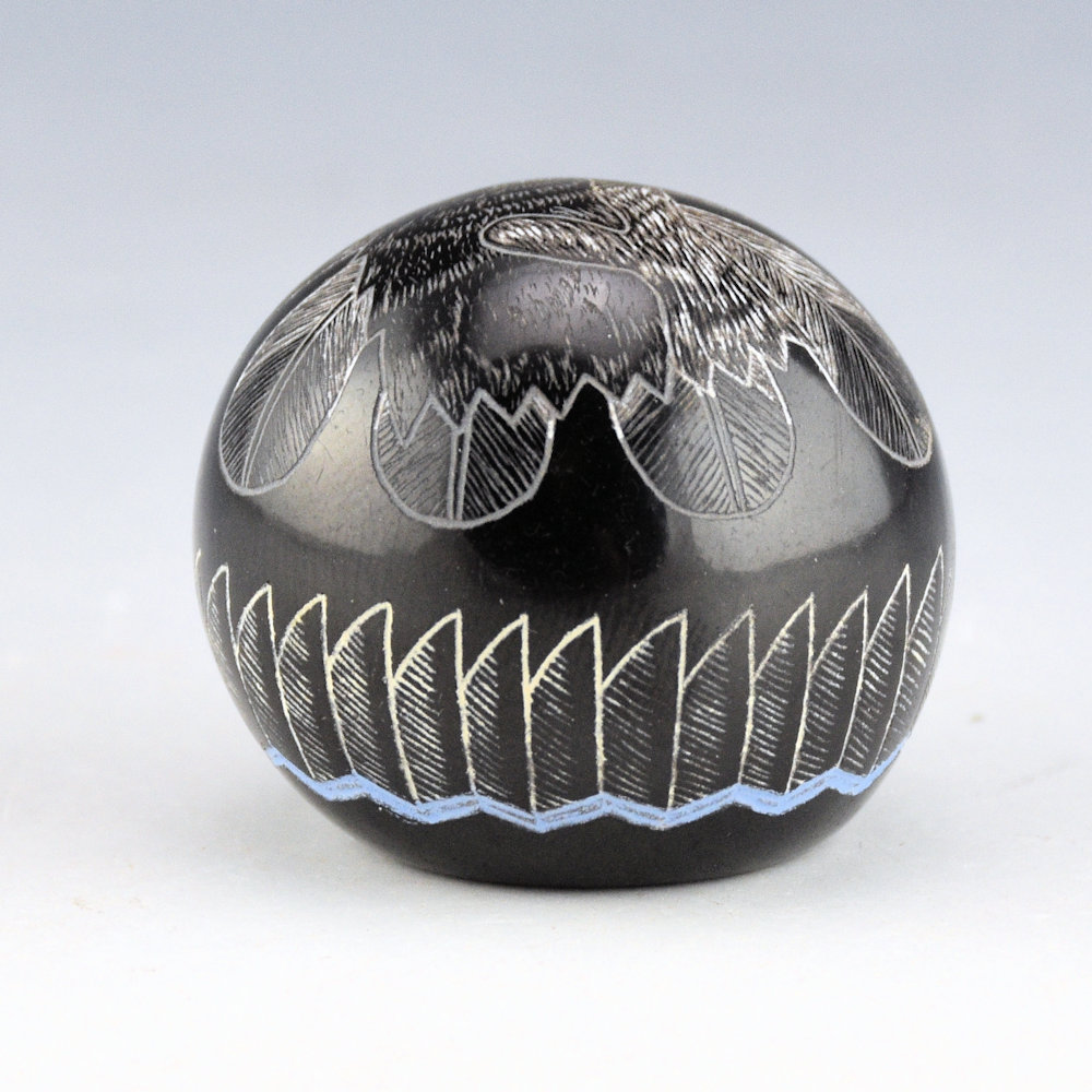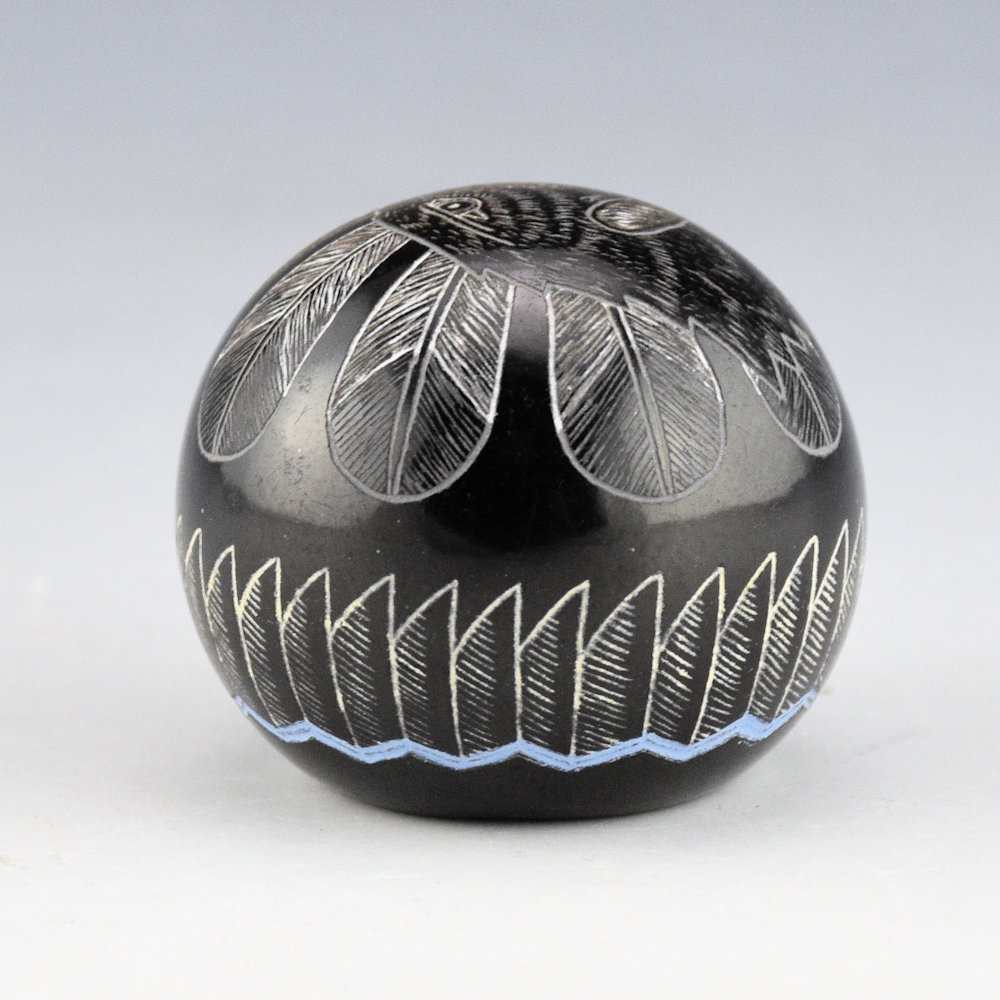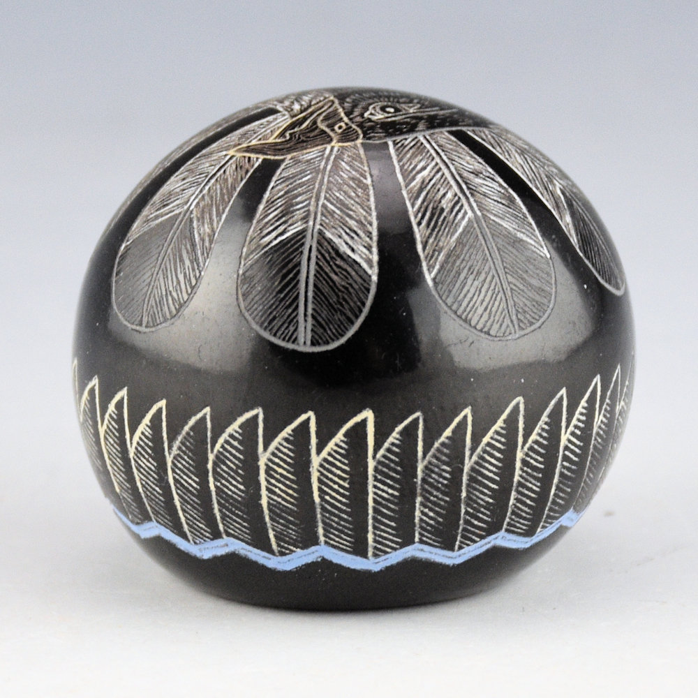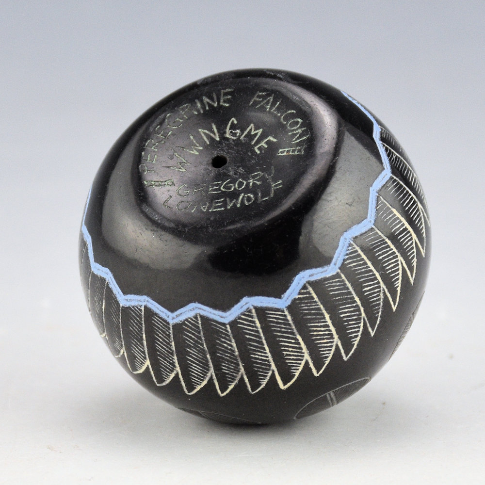 Greg Lonewolf is the son of Joseph Lonewolf and is known for his intricately incised miniatures. This seedpot is one of his few black fired pieces. The piece is entitled, “Peregrine Falcon”. There is a realistic Peregrine Falcon on the top. Behind the falcon are realistic feathers. There are additional feathers on the side. All the various colors are additional clay slips. which are added after the black firing. It is signed on the bottom, “Gregory Lonewolf”. It is in excellent condition with no chips, cracks, restoration or repair.
