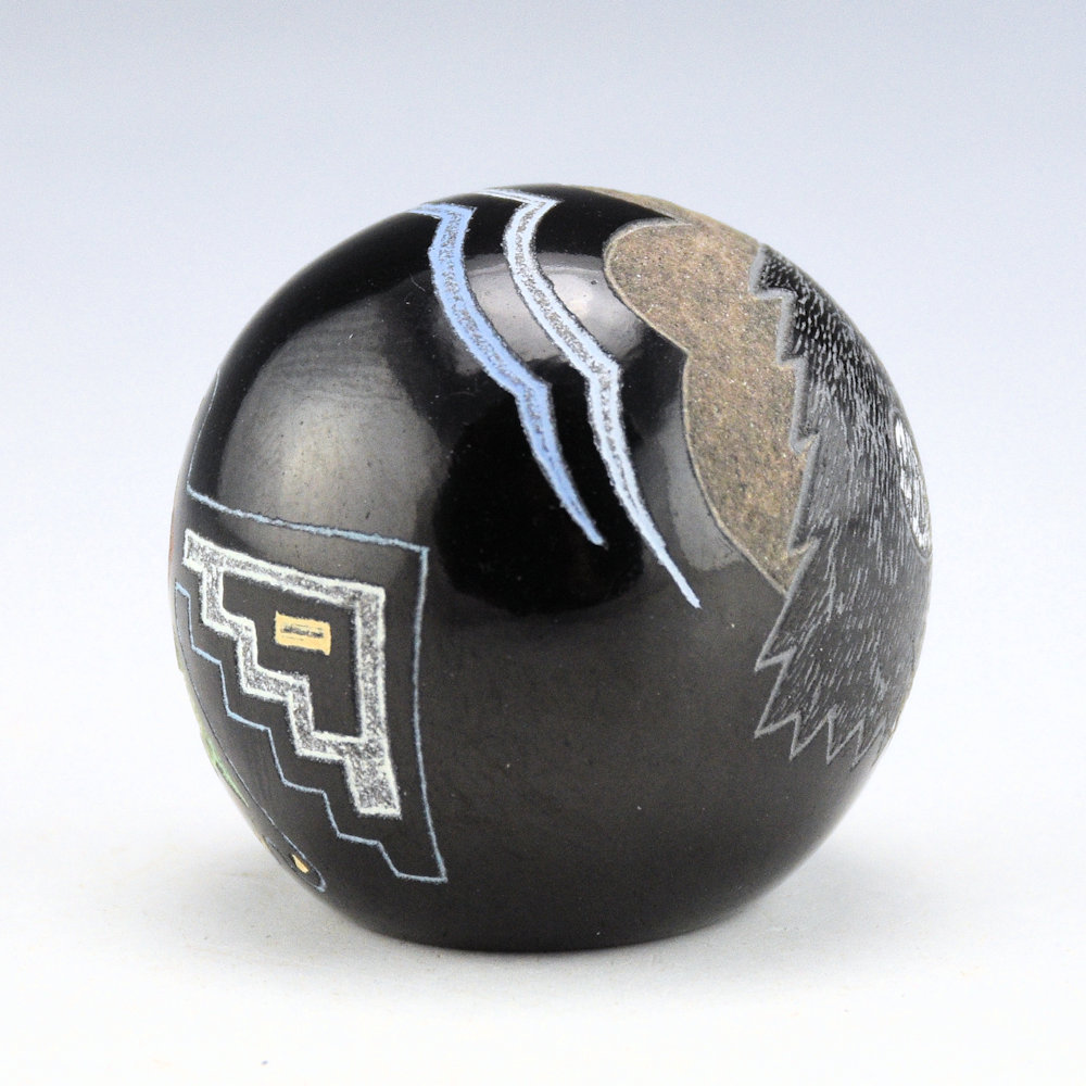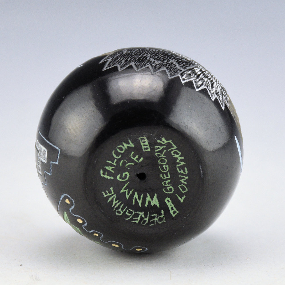 Greg Lonewolf is the son of Joseph Lonewolf and is known for his intricately incised miniatures. This seedpot is one of his few black fired pieces. The piece is entitled, “Peregrine Falcon”. There is a realistic Peregrine Falcon on one side. There is a cloud design surrounding the bird. On the back is a stylized falcon. All the various colors are additional clay slips. which are added after the black firing. It is signed on the bottom, “Gregory Lonewolf”. It is in excellent condition with no chips, cracks, restoration or repair.