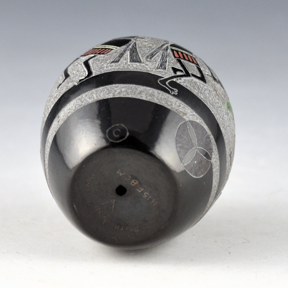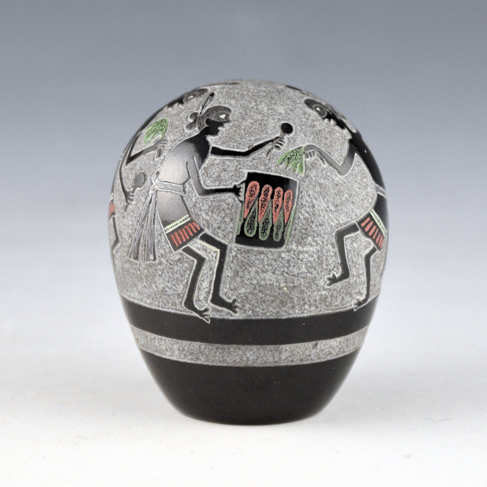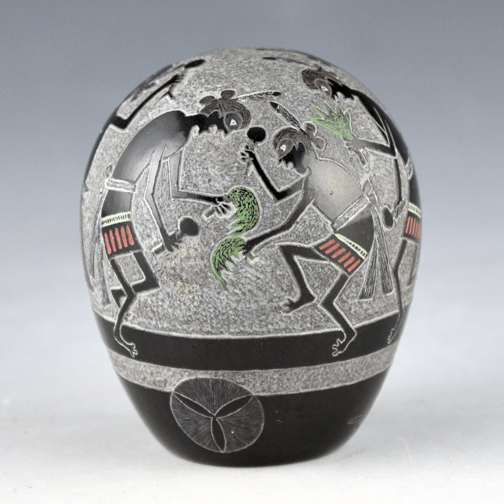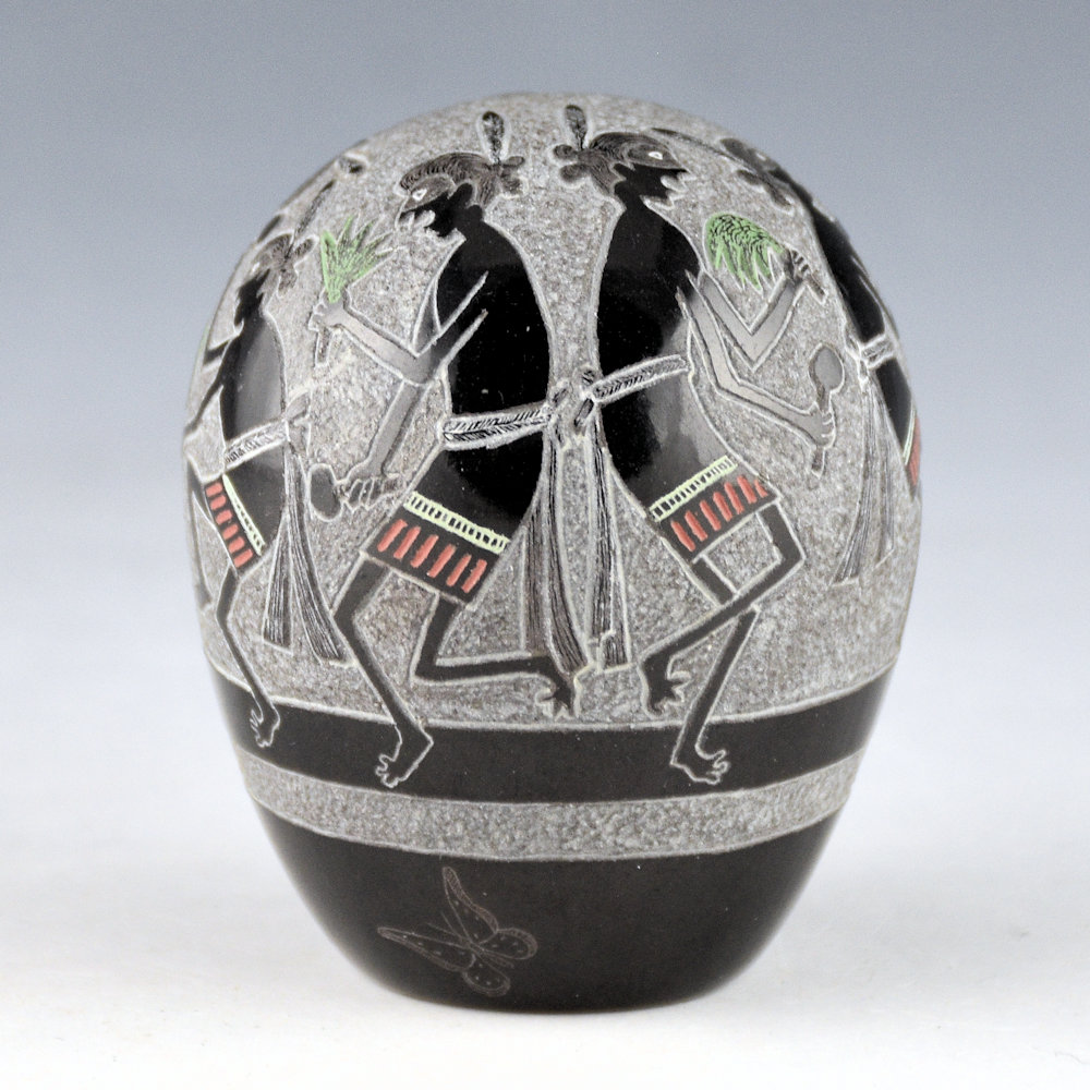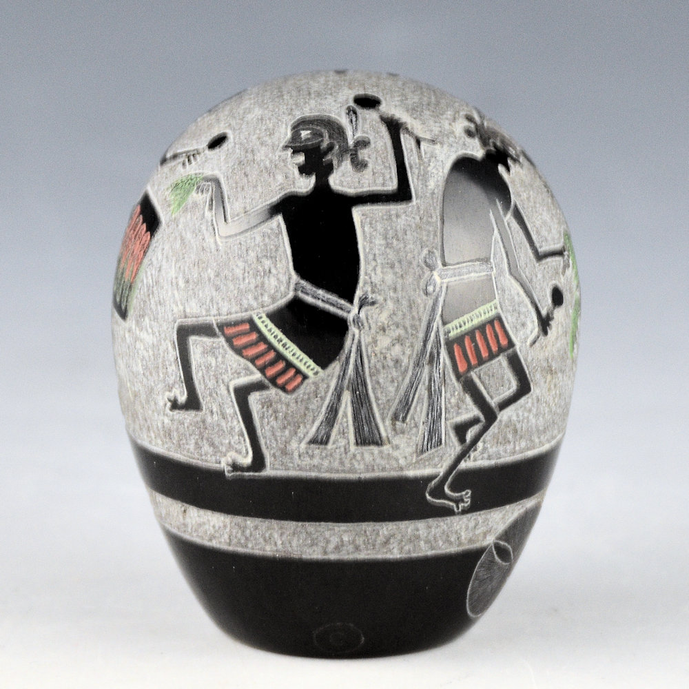 This seedpot by Joseph Lonewolf is from 1987, and it is highly polished and fired black. The design has six Mimbres figures. They are depicted in the style of Pueblo dancers with a drummer and the other men holding rattles and pine branches. Each figure is captured in a different point of motion. Note as well the background which has been more deeply incised and has a textural feel. The base of the seedpot is fully polished. There is the 1987 symbol, the Propeller of Life, along with a realistic butterfly. All the additional colorations are from natural clay slips. It is signed on the bottom, “Joseph Lonewolf”. It is in excellent condition with no chips, cracks, restoration or repair. Joseph Lonewolf said of his use of Mimbres imagery in his pottery: