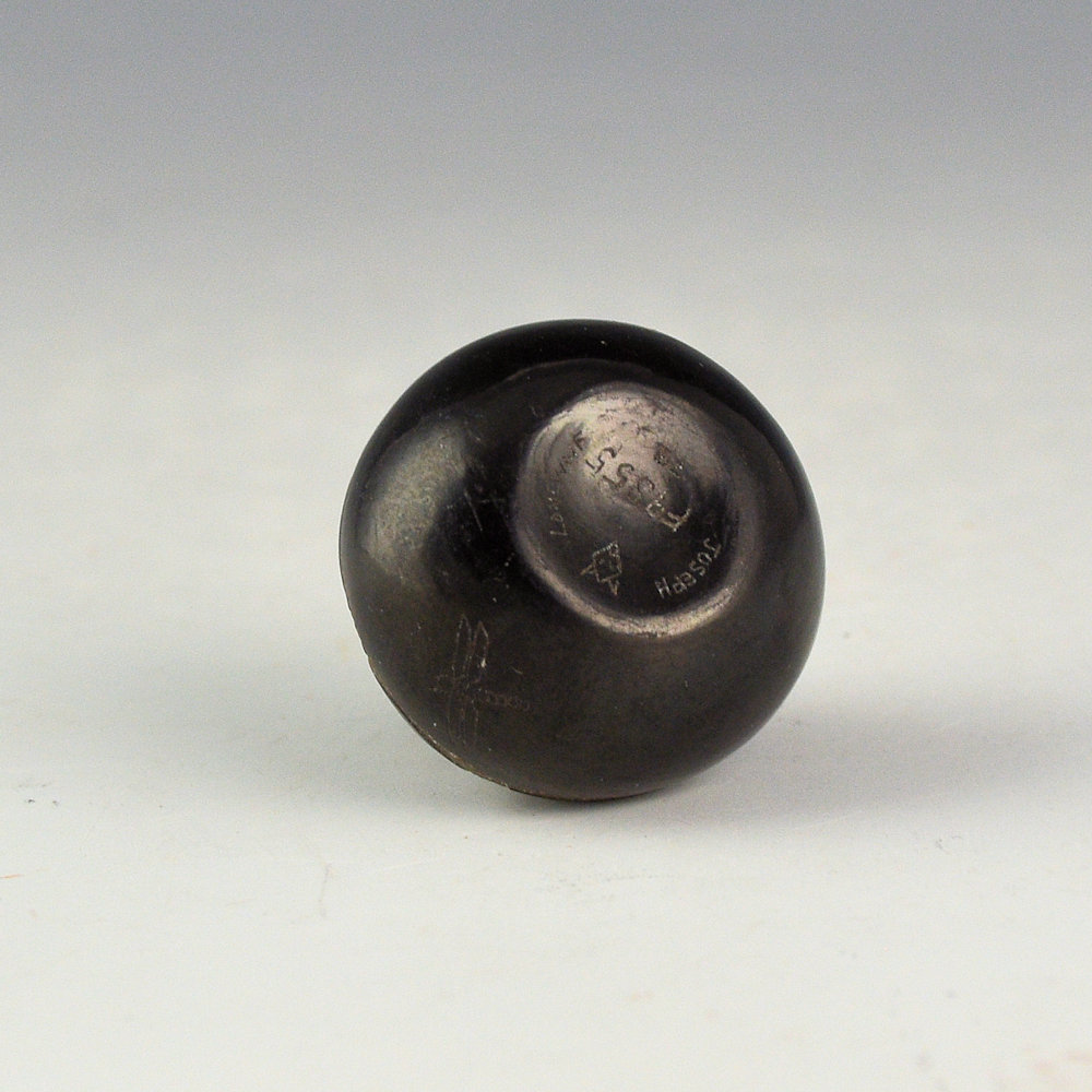 This is a small seed jar by Joseph Lonewolf. The piece is fully polished and fired black. Joseph always made fewer black pieces than he made redware. The jar is from 1979. There are two Mimbres insects etched into the clay. Do you notice something different about the background? In 1978-9, Joseph used a clay that had mica in it, and it created the “sparkle” in the area that was etched away. From what I have seen, he only used it on smaller pieces, and specifically those fired black. It may well have been a way to create more focus on the design on black pieces without adding more color. The jar is signed on the bottom in the clay, “Joseph Lonewolf”. It is in excellent condition with no chips, cracks, restoration, or repair.