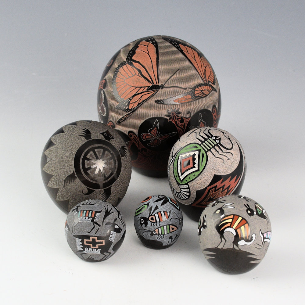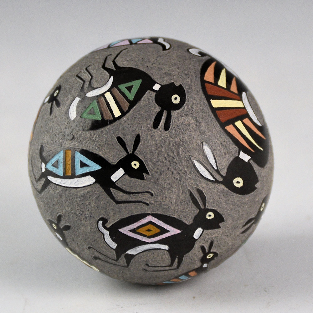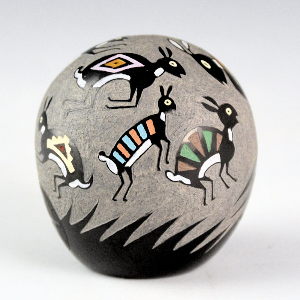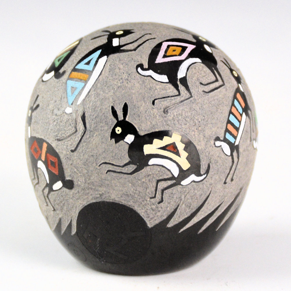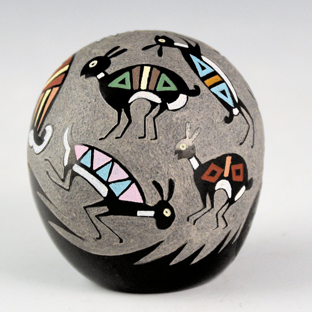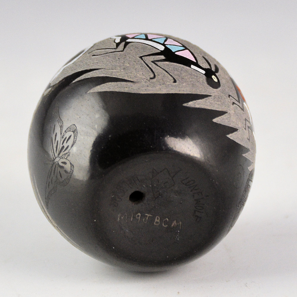 This is an intricately designed seedpot by Joseph Lonewolf. This piece was fully polished and then etched with the design before firing. There are nine Mimbres rabbits as the design. There is one larger rabbit and eight bunnies! Each rabbit has a different design on its back. The seedpot was fired black and the rabbits are highlighted with blue, white, green, purple, orange, red, and pink clay slips! There is a realistic butterfly near the base as well as the 1992 yearly symbol. It is one of his few black pieces and wonderfully complex in Mimbres designs! It is signed on the bottom, “Joseph Lonewolf”. It is in excellent condition with no chips, cracks, restoration, or repair.