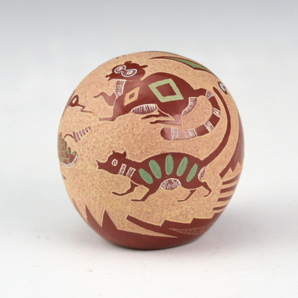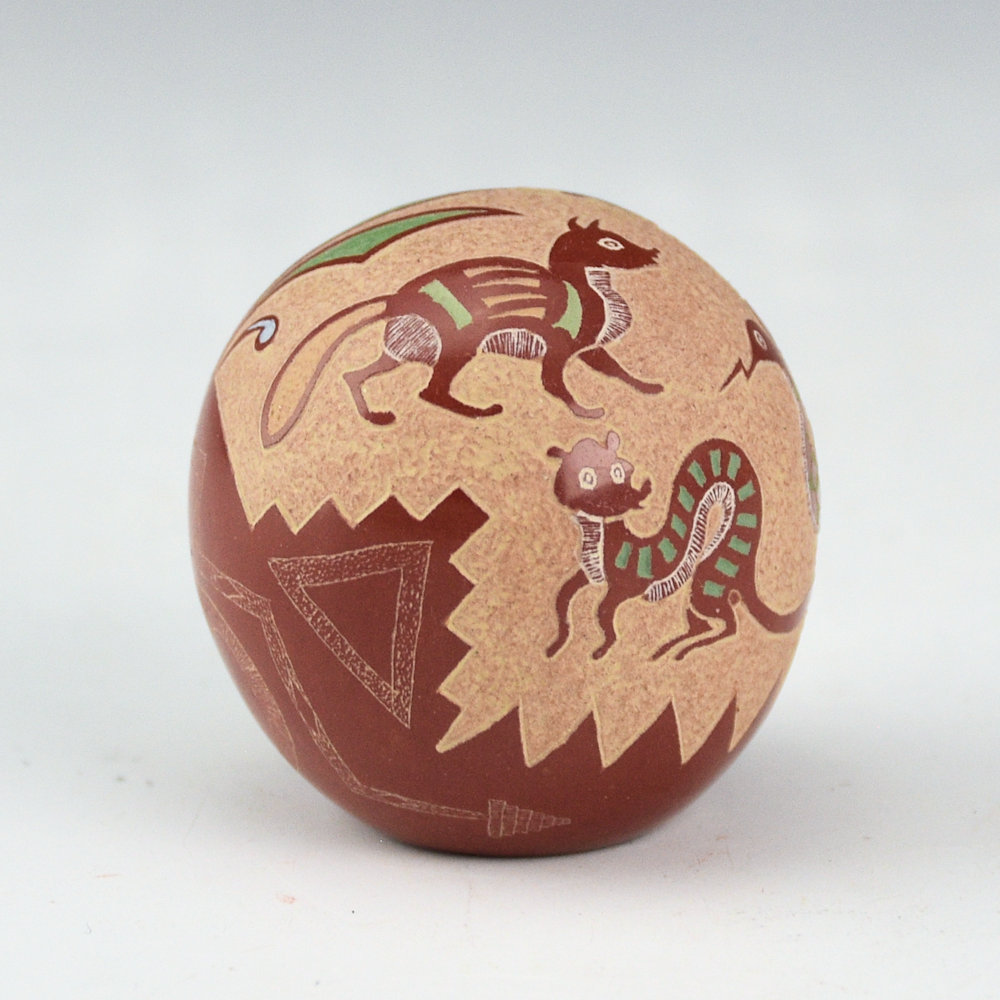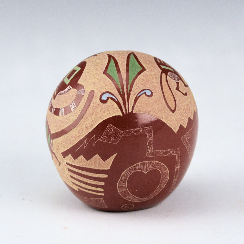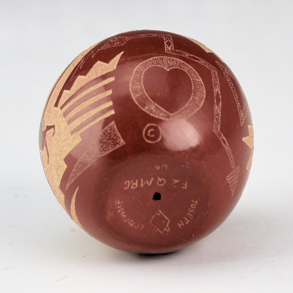 Beginning in the early 1970’s, Joseph Lonewolf revolutionized the world of Santa Clara pottery by incorporating his sgraffito (lightly etching the surface of the clay) and incised (more deeply cut into the clay) designs. This seedpot is from 1986. Let me start out, that there is something that just makes me smile at this piece. I’ve been looking at the designs, and I think it’s the eyes of the weasels! The double headed snake is has a lot of detail, and I like how it’s looking at all four of the weasels. It’s their big, round eyes and elongated bodies, that make them look a bit cartoonish, but also Mimbres. They are also etched with various designs. The back has a plant design. Below in the red is a lightly etched snake, along with a butterfly, and the yearly symbol. The piece has additional white, green, blue, and pink clays. The yearly symbol for 1986 is a heart. It is such a charming piece in person! The precision of the designs and the shine of the polished surface create a perfect balance. This piece is in perfect condition with no chips, cracks, restoration or repair. It is signed on the bottom, “Joseph Lonewolf”