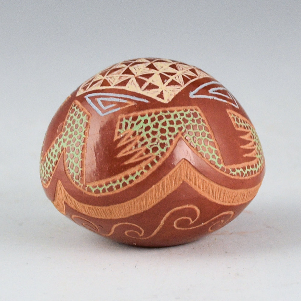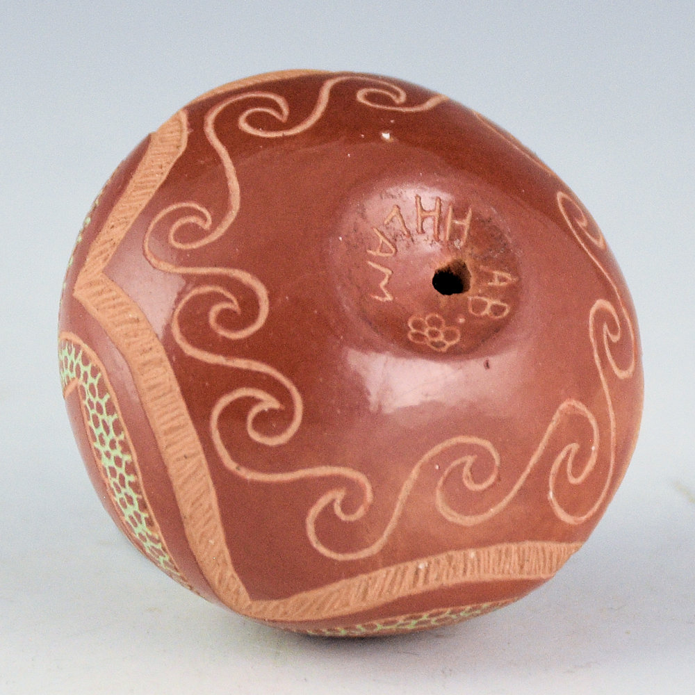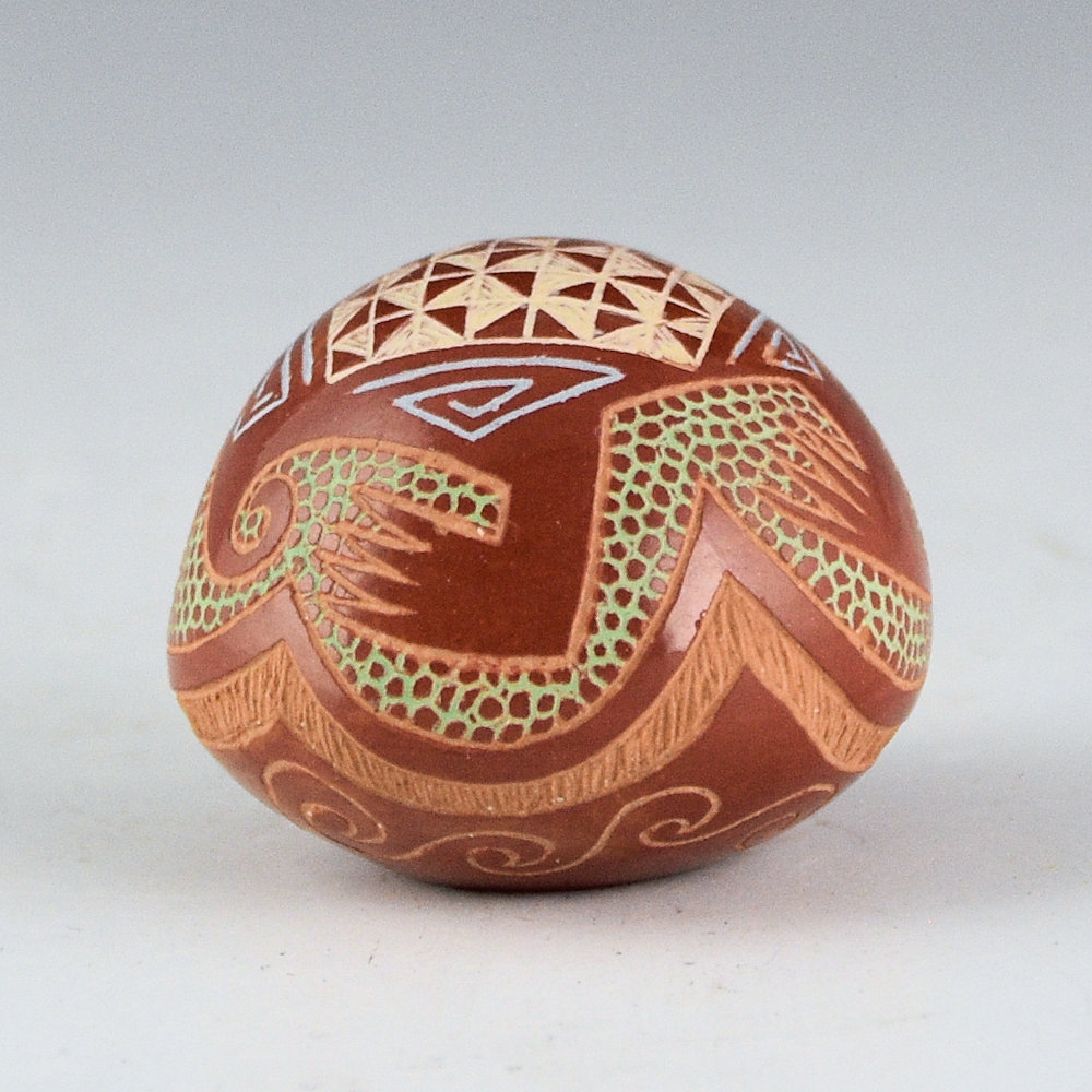 This is a classic multi-color seedpot by Rosemary Lonewolf. She learned to make pottery from her father, Joseph Lonewolf. This piece is fully polished and it has a sharp point at the top. There is a turtle on the top. Check out the detailed checkerboard pattern for the top of the shell! Note in the background area how there are lots of tiny circles. Rosemary said that it was very time consuming to make all the little circles! Near the base are waves. All the various colors are different clay slips. which are added after the firing. The seedpot is in excellent condition with no chips, cracks, restoration or repair. It is signed on the bottom in the clay, “AB”. While Rosemary no longer makes many traditional-style pieces of pottery, her miniatures remain a classic!