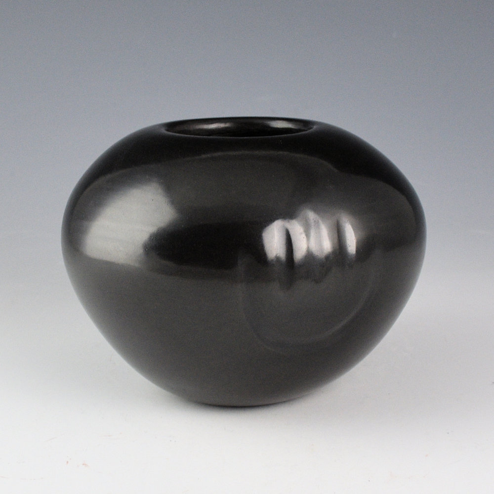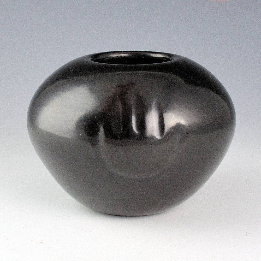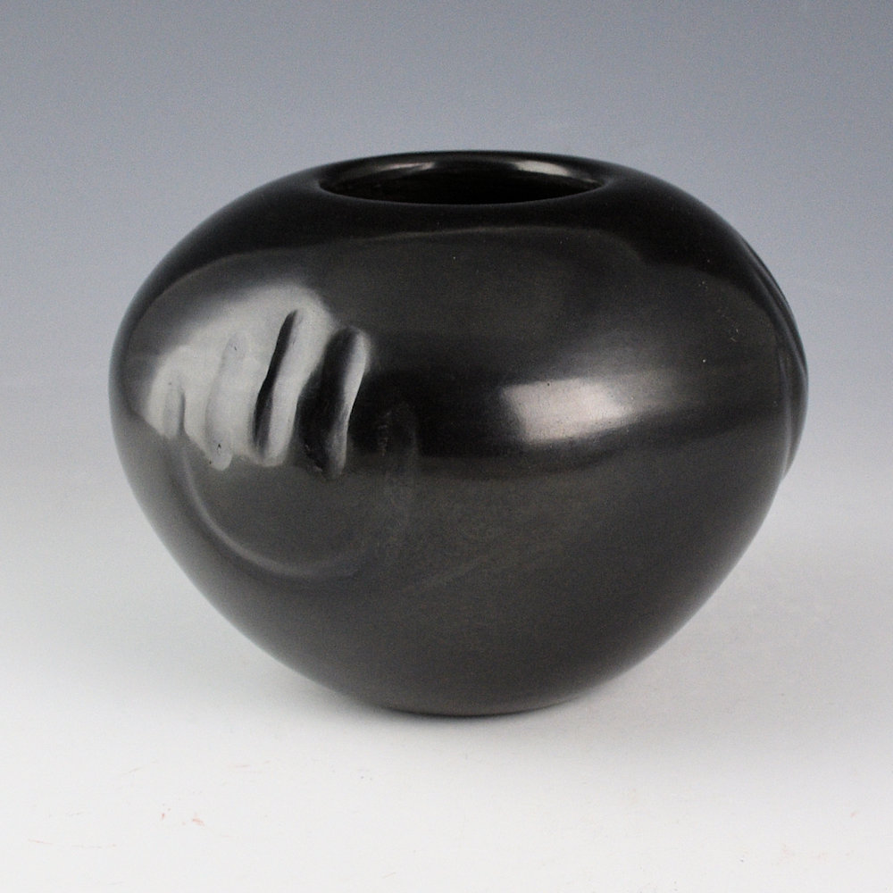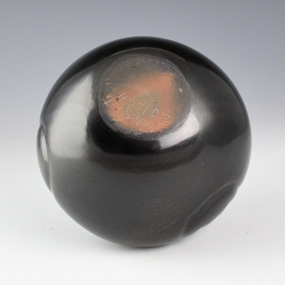 Leon Lovato (d. 2020), was a son of Tina Garcia. This bowl is coil-built and fully polished. There are three bear paws impressed into the clay before it was polished. The bowl was fired a glassy black. This is the only piece we have had by Leon. It is signed, “Leon Lovato” and it is in excellent condition with no chips, cracks, restoration, or repair.