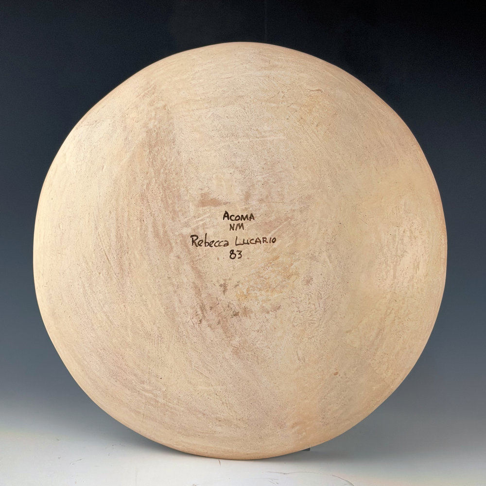 Rebecca Lucario is known for her delicate and intricately painted pottery. This plate is highly detailed with VERY thin lines. The plate has a Mimbres grasshopper, a ladybug, a bee, and a beetle. They are surrounded by a variety of thin-lines to create a secondary design. The piece is painted with bee-weed (black). Note the incredible precision of the painting. Simply visually dynamic. It is signed on the back, “R. Lucario”. It is in excellent condition with no chips, cracks, restoraiton, or repair.