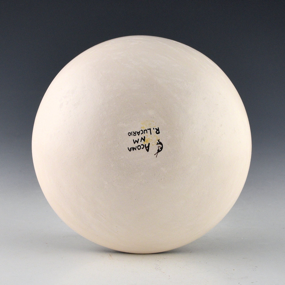 This is a very intricately painted wide seedpot by Rebecca Lucario. She is known for her delicate and very finely painted pottery. This seedpot is fully painted on the top with bee-weed (black) and colorful clay slips. There are two Mimbres Lizards. There is a cloud design with her VERY thin lines. The edge of the seedpot has a feather pattern. The piece is signed on the bottom, “R Lucario”.