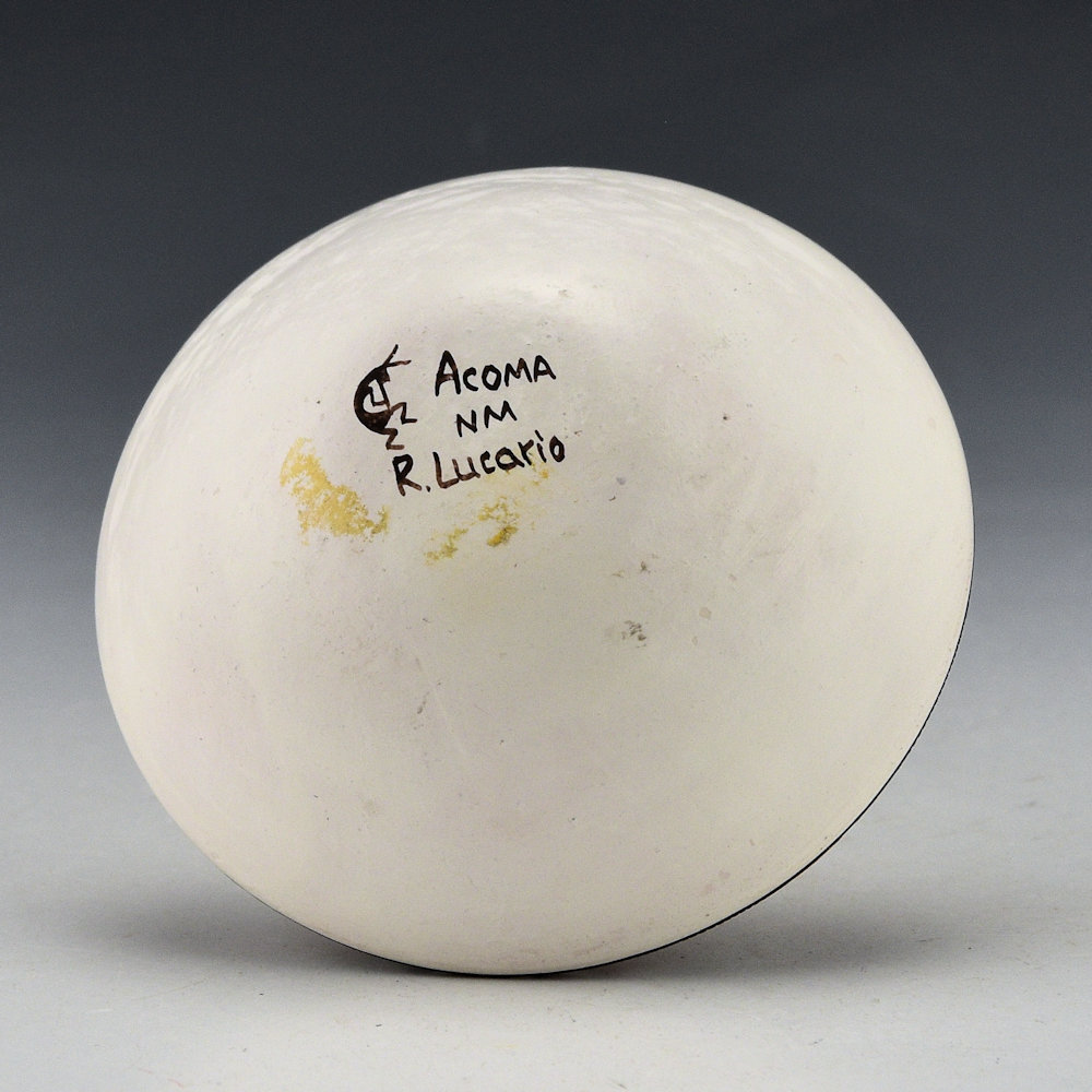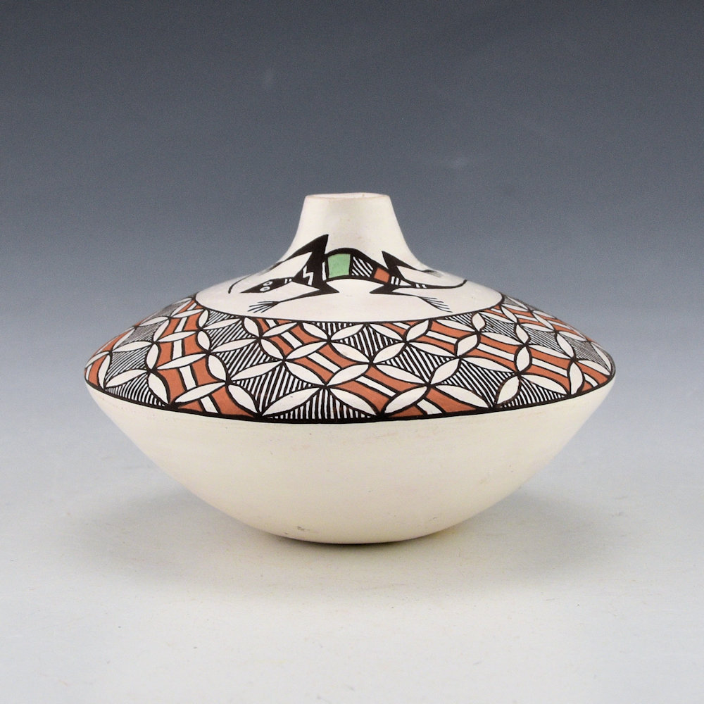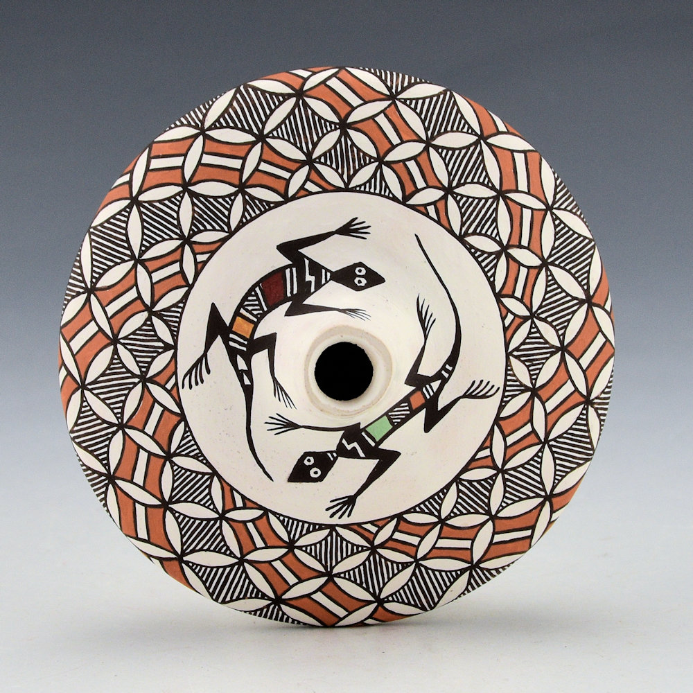 This is a very intricately painted jar by Rebecca Lucario. She is known for her delicate and very finely painted pottery. This jar has a wide shoulder and a short neck. The top has two Mimbres lizards along with a swirling butterfly patterns around the top of the shoulder. It is very tightly painted. The piece is signed on the bottom, “R Lucario”.