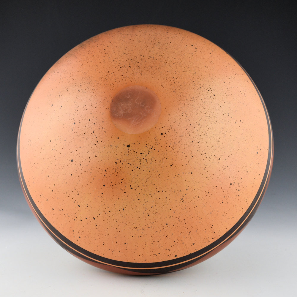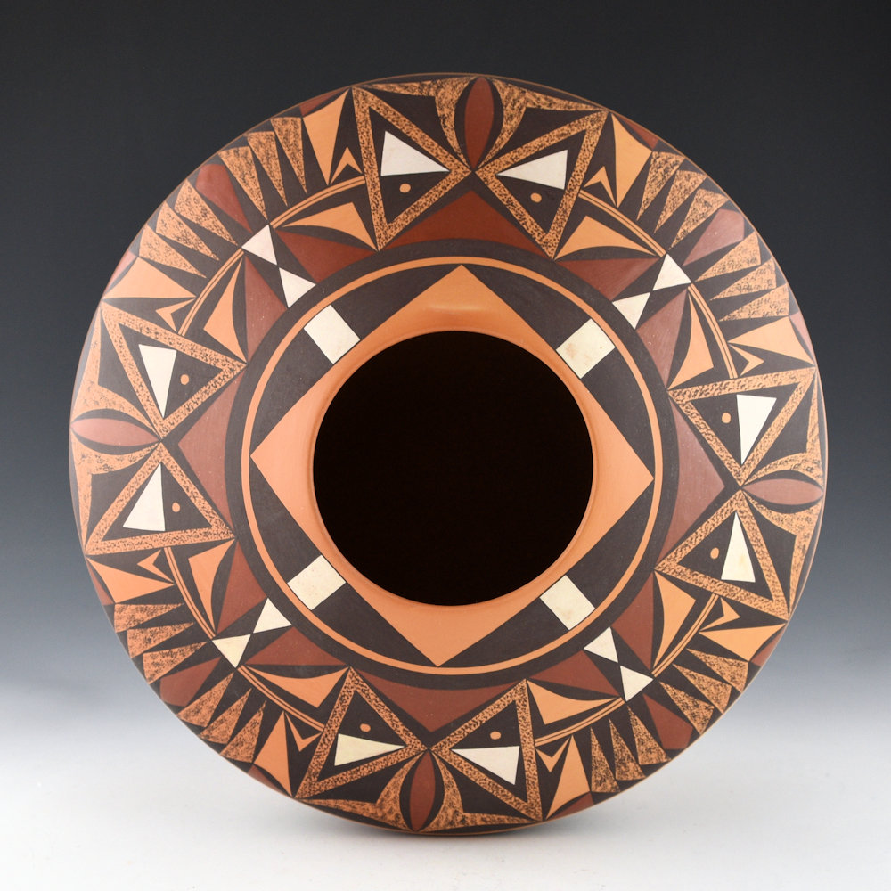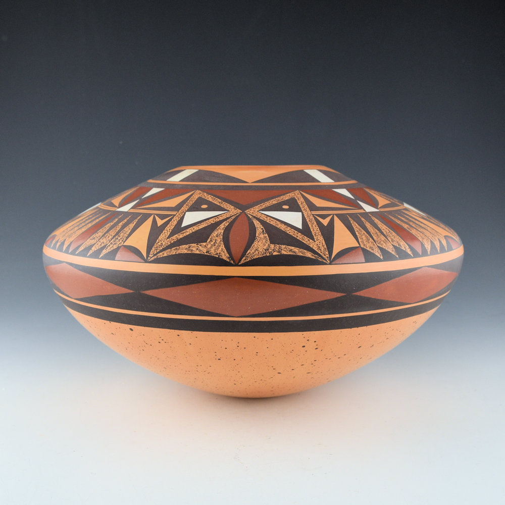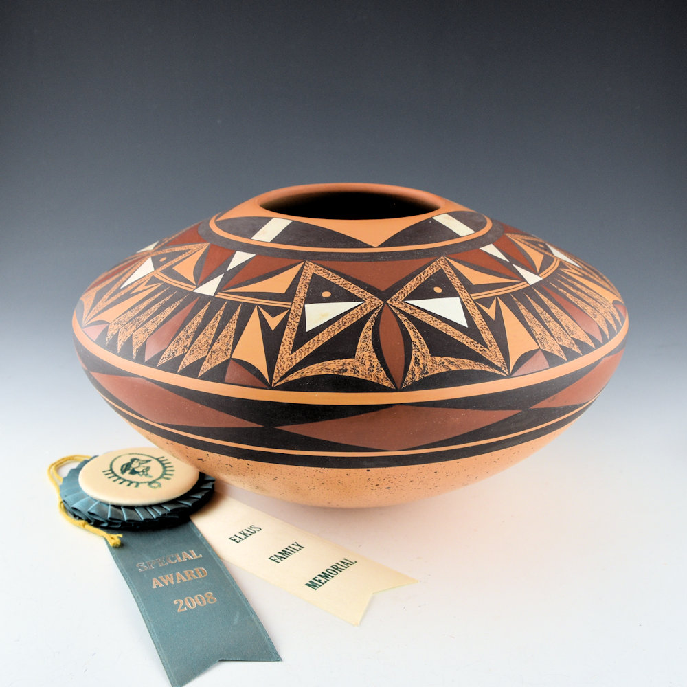 This is a creative large jar by Steve Lucas. He is one of the leading Hopi-Tewa potters working today. Each piece is coil-built, stone-polished, painted with native clay slips and bee-weed (black), and traditionally fired. This jar has a wide shoulder and sloping top. The top of the jar has four butterflies, which are separated by four butterfly wing designs. Below the shoulder are large diamond shapes. The imagery combines white and deep clay colors with the black bee-weed. The jar was traditionally fired to create the blushes on the surface. It is signed on the bottom in the clay, “S. Lucas” and a mudhead (koyemsi) and an ear of corn (corn clan). The jar is in excellent condition with no chips, cracks, restoration, or repair. It has a ribbon from the 2008 Gallup Ceremonials.