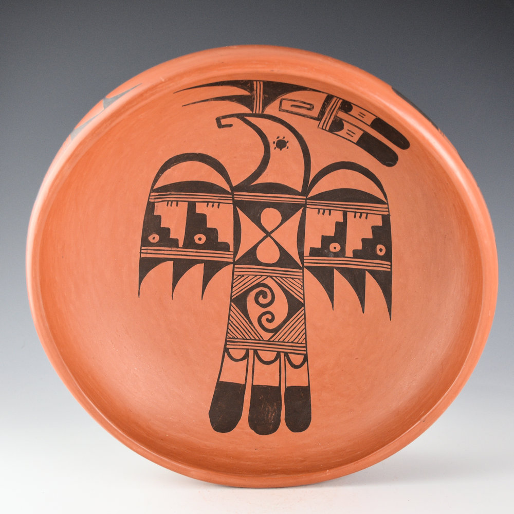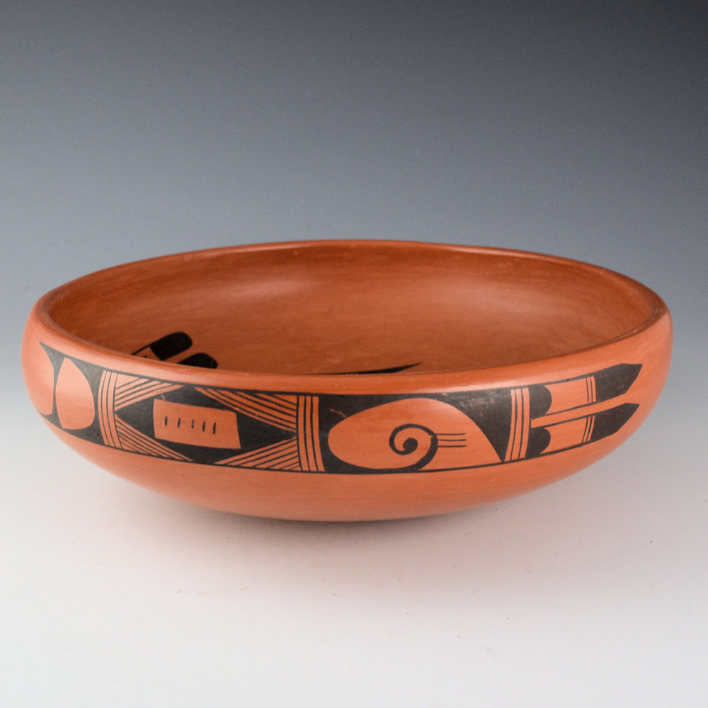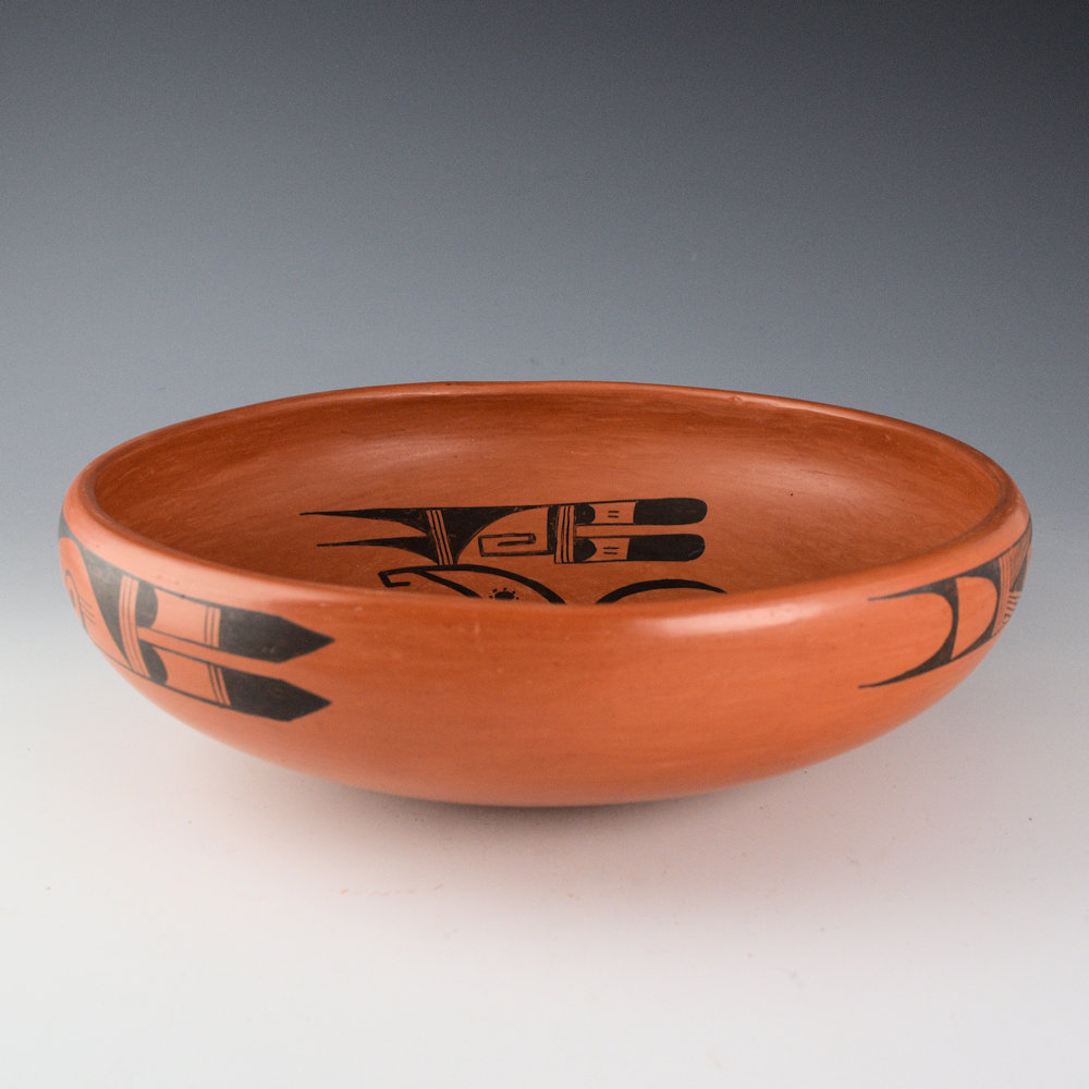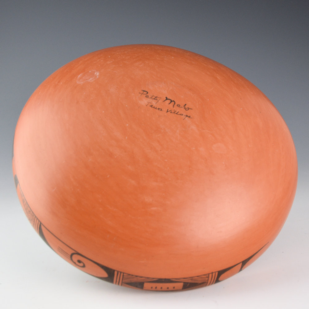 Patty Maho (1903-1993) was a sister of Mamie Nahoodyce, a niece of Paqua Naha, and a cousin of Sadie Adams, Lena Charlie, and Joy Navasie. Interestingly, she never learned to speak English and spoke only Tewa and some Hopi. While she learned to make pottery, she had difficulty painting designs. Her sister would often paint her pottery for her, until she was able to master the painting techniques. She stopped making pottery after her sister passed away in 1980. This large open bowl has a hummingbird painted in the center (it is probably a Hummingbird moth, not a hummingbird). The sides had geometric rain, cloud, and wind design that are tightly painted. It is signed, “Patty Maho”. It is in excellent condition with no chips, cracks, restoration or repair.
