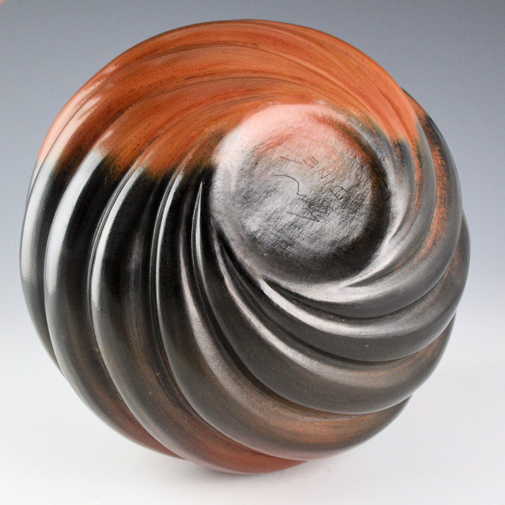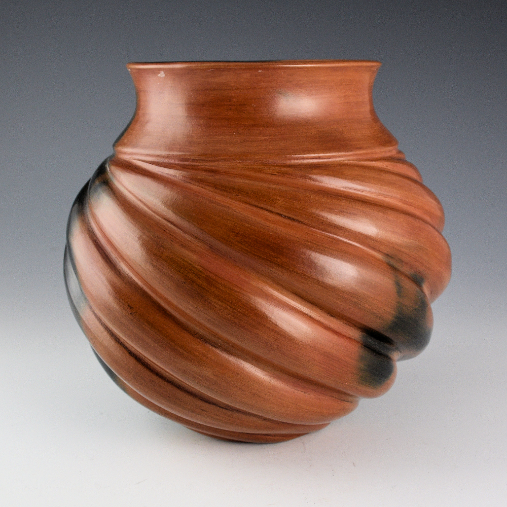 This is a striking water jar by Samuel Manymules. It is coil-built and slipped with red clay and then traditionally fired. The jar has a stone-polished neck and a sharp edge separating the neck from the swirls. The area below the shoulder has nine rounded melon ribs. The ribs are pushed out from the inside creating an elegant flow. The coloration of the jar is intense from the firing with red and deep black areas. The color is created by traditional outdoor firing. After the firing, the jar is covered with pinon pitch in the traditional way expected of Navajo pottery. It is signed, “SM”. It is extraordinary vessels like this that keep Samuel among the top Navajo potters working today.