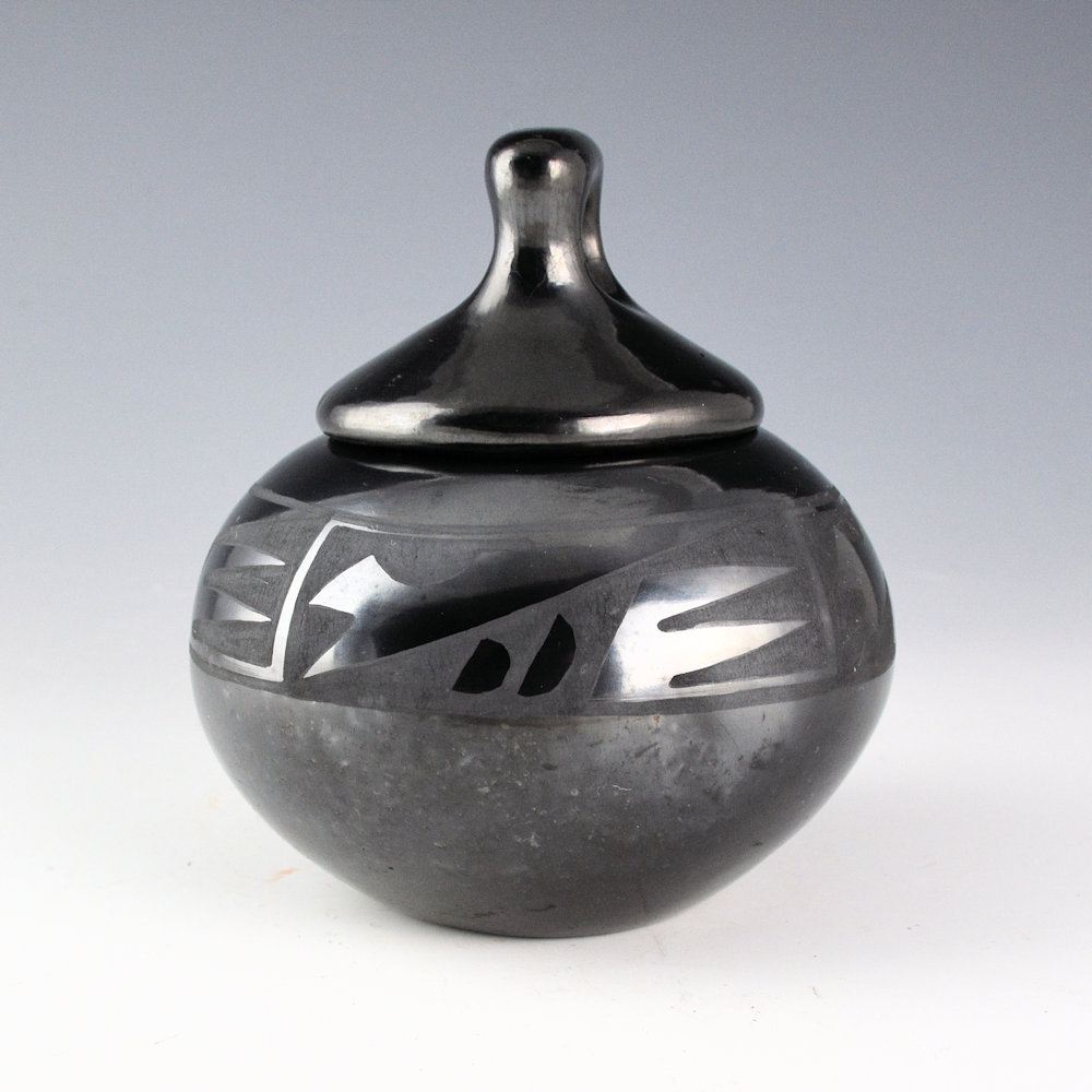 Anita Martinez was a granddaughter of Maria Martinez and a daughter of Santana & Adam Martinez. She was the mother of noted potter Barbara Gonzales and grandmother of Cavan Gonzales. This is an unusual piece of her pottery which is lidded. The bowl is fully polished and painted with a rain and cloud design. The lid is also fully polished. The entire piece is fired a silvery black. Both pieces are signed on the bottom in the clay “Anita Martinez”. It is in excellent condition with no chips, cracks, restoration or repair.