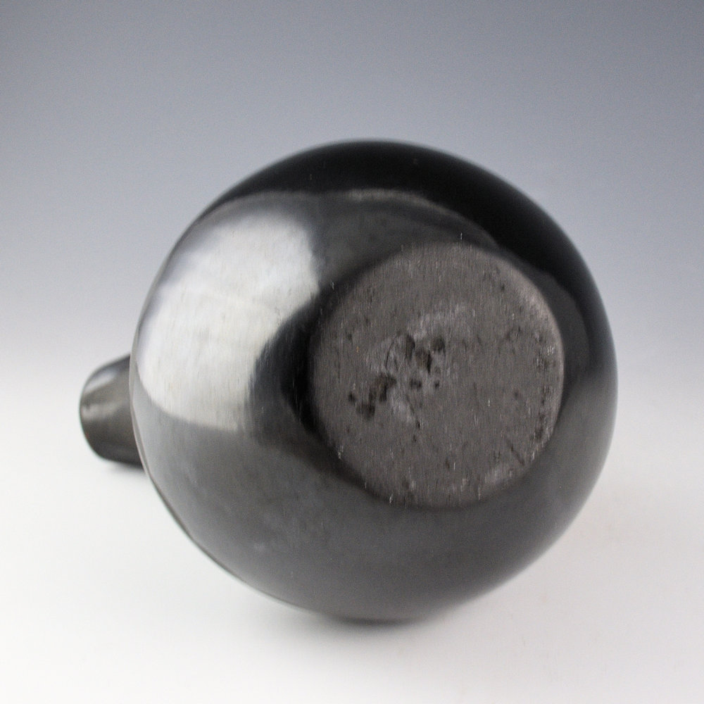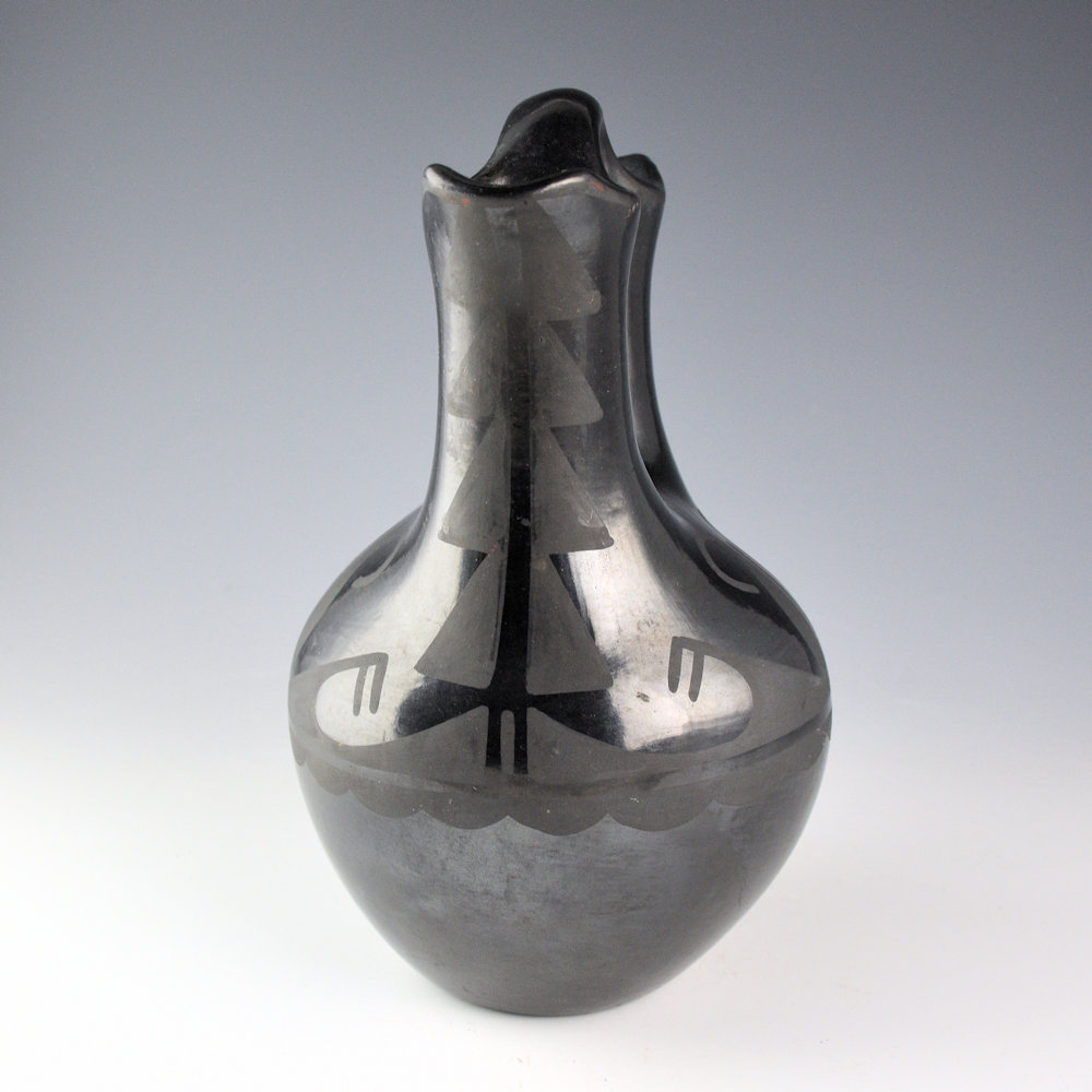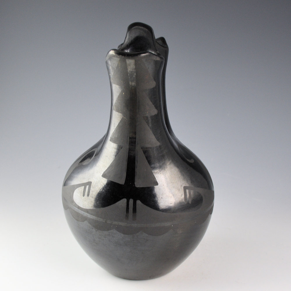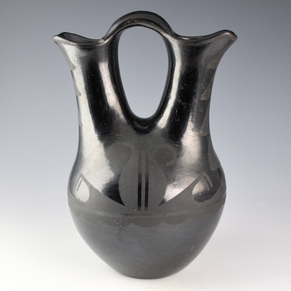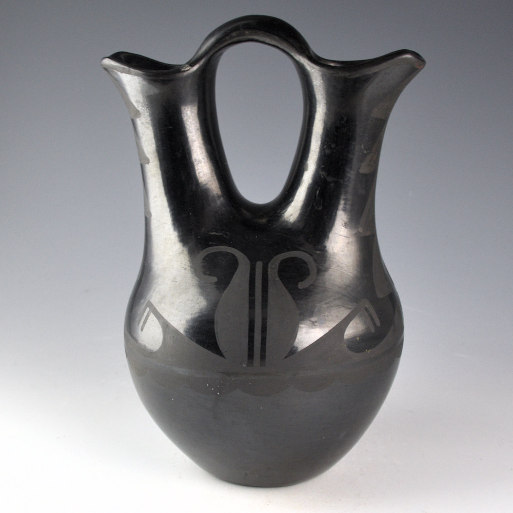 This is an exceptional wedding vase by Maximiliana “Anna” Martinez. She was a sister of Maria Martinez. It is coil-built and stone polished, then painted. The wedding vase is thin walled and beautifully constructed with a round body and elongated, but proportional spouts. The entire surface is polished. The front and back have large seed seed designs with extended leaves. The sides have clouds, rain and mountain patterns. It is tightly painted with designs that match and accentuate the form. It was fired to a glassy black. It is signed on the bottom in the clay, “Anna”. It is in very good condition with no chips, cracks, restoration, or repair.