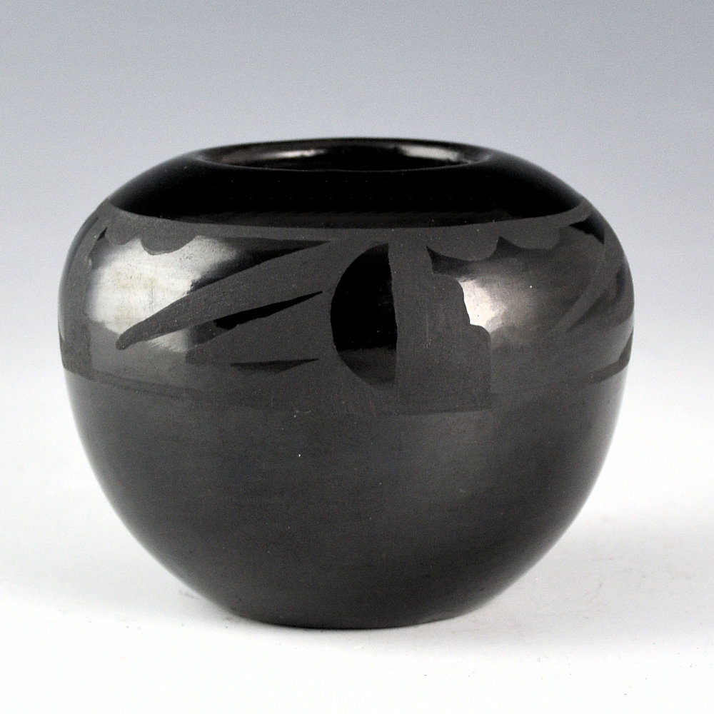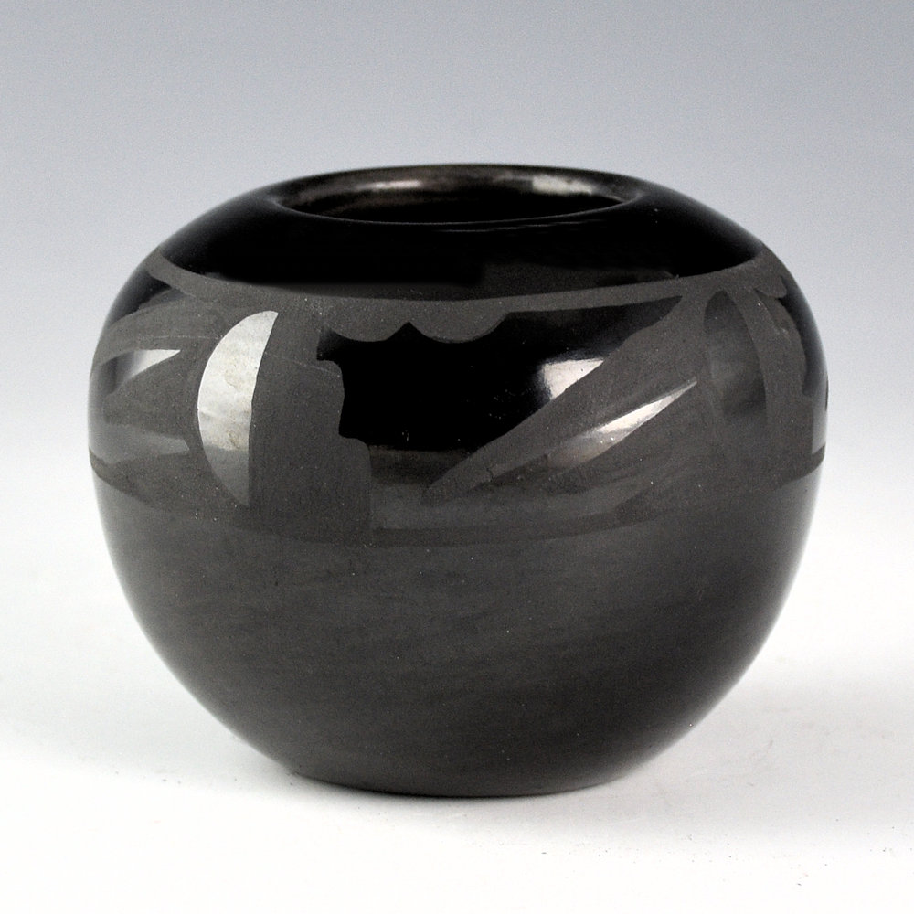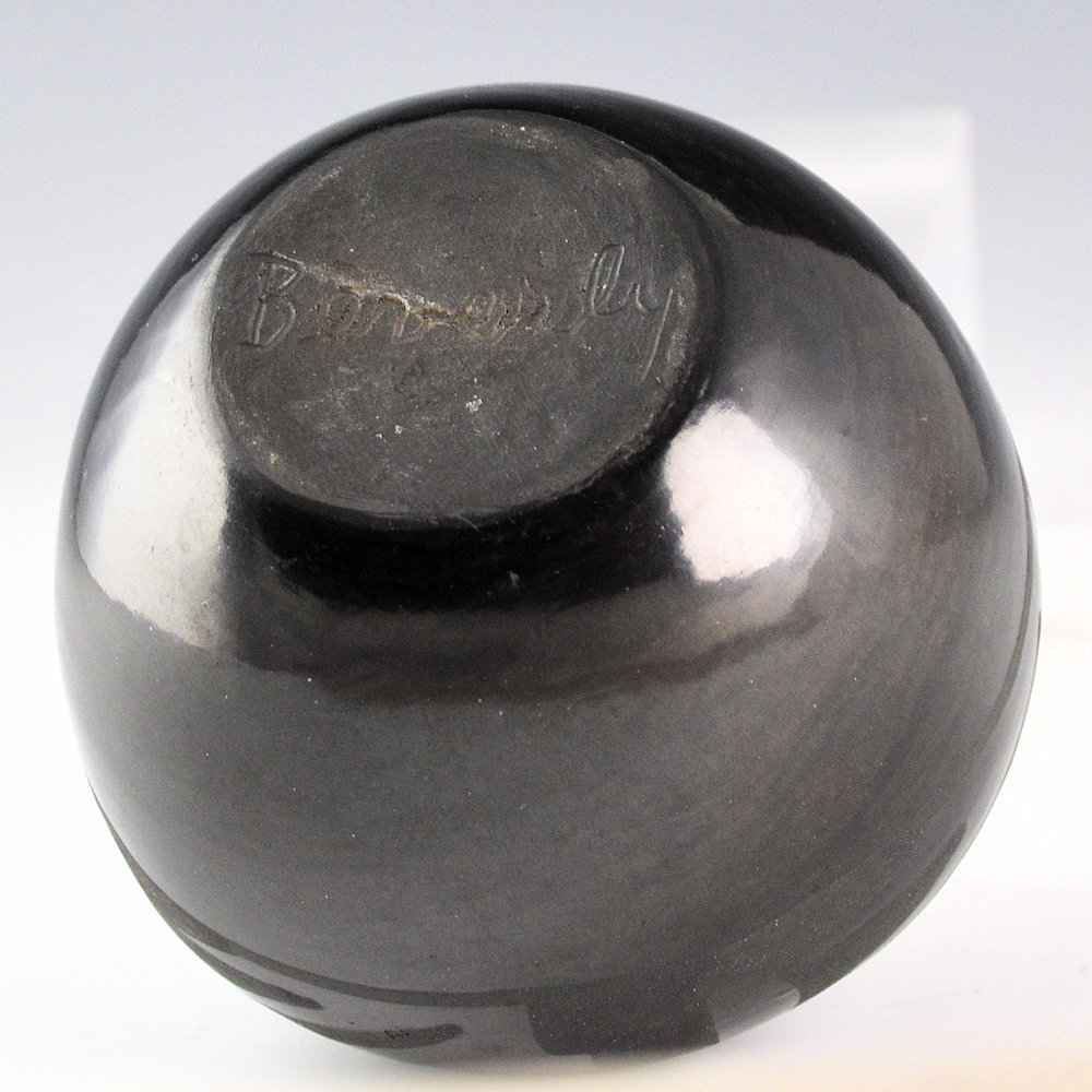 Beverly Martinez (1960-91) was a granddaughter of Santana & Adam Martinez and a great-granddaughter of Maria Martinez. She was a sister of Marvin Martinez and Johnny Cruz. Her pottery was beautifully polished and painted and she was featured in the 1974 “7 Families in Pueblo Pottery” exhibition. This bowl is round in shape and highly polished. It has a traditional cloud and wind design. It is in excellent condition with no chips, cracks, restoration or repair. It is signed on the bottom in the clay, “Beverly”.