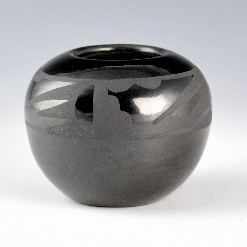 Beverly Martinez (1960-91) was a granddaughter of Santana & Adam Martinez and a great-granddaughter of Maria Martinez. She was a sister of Marvin Martinez and Johnny Cruz. Her pottery was beautifully polished and painted and she was featured in the 1974 “7 Families in Pueblo Pottery” exhibition. This jar has a sharp shoulder and elongated neck. It is fully polished and painted with a classic feather design. It is in excellent condition with no chips, cracks, restoration or repair. It is signed on the bottom in the clay, “Beverly”.