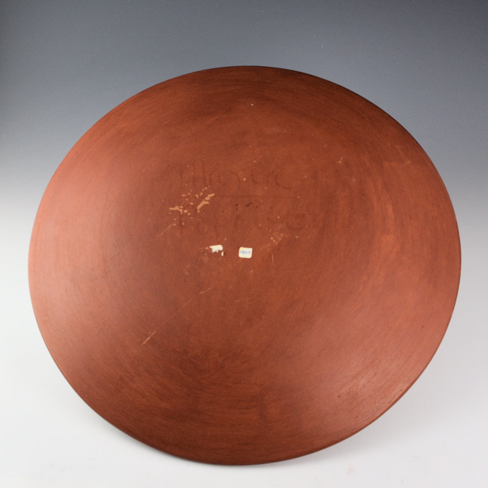 This is a spectacular large red plate by Maria Martinez and her son, Popovi Da (1923-1971). Maria made and polished the plate, and it was painted by Popovi. Popovi focused on both the painted surfaces of the pottery and the firings. The piece is painted with 48 painted feathers. It is one of the largest redware plates we have had by Maria. It is always difficult to find plates over 12″, as they cracked in the drying and firing. Firing them red is more difficult than firing them black, as there is less time to get them to just the right coloration and not have it over-fire. This plate is fired a deep red coloration. The plate is signed on the back in the clay, “Maria / Popovi”. This indicates it was made before the use of firing dates, so from 1956-9. It is in very good condition with no chips, cracks, restoration or repair. Pieces this size and coloration are always scarce and a great addition to any collection!