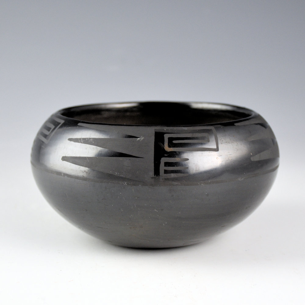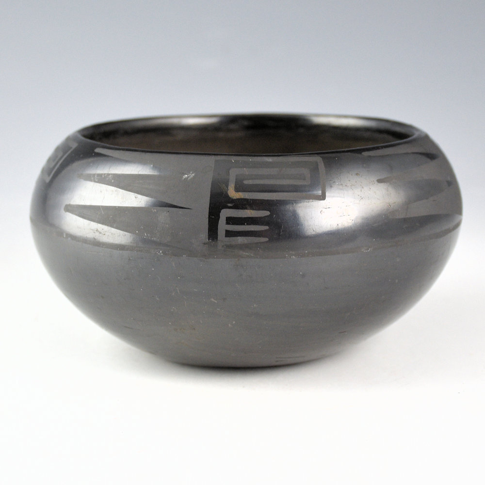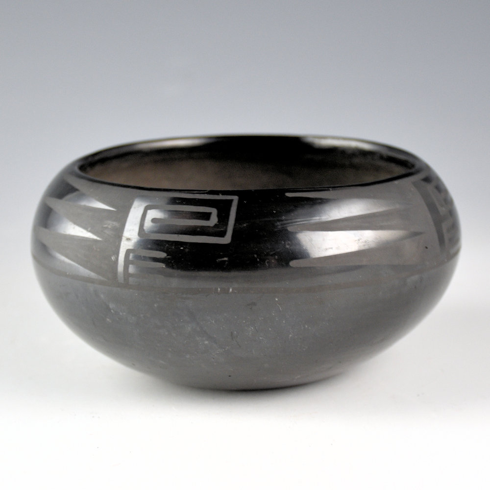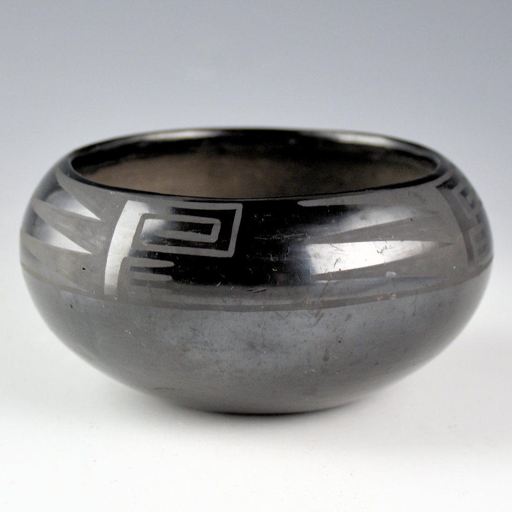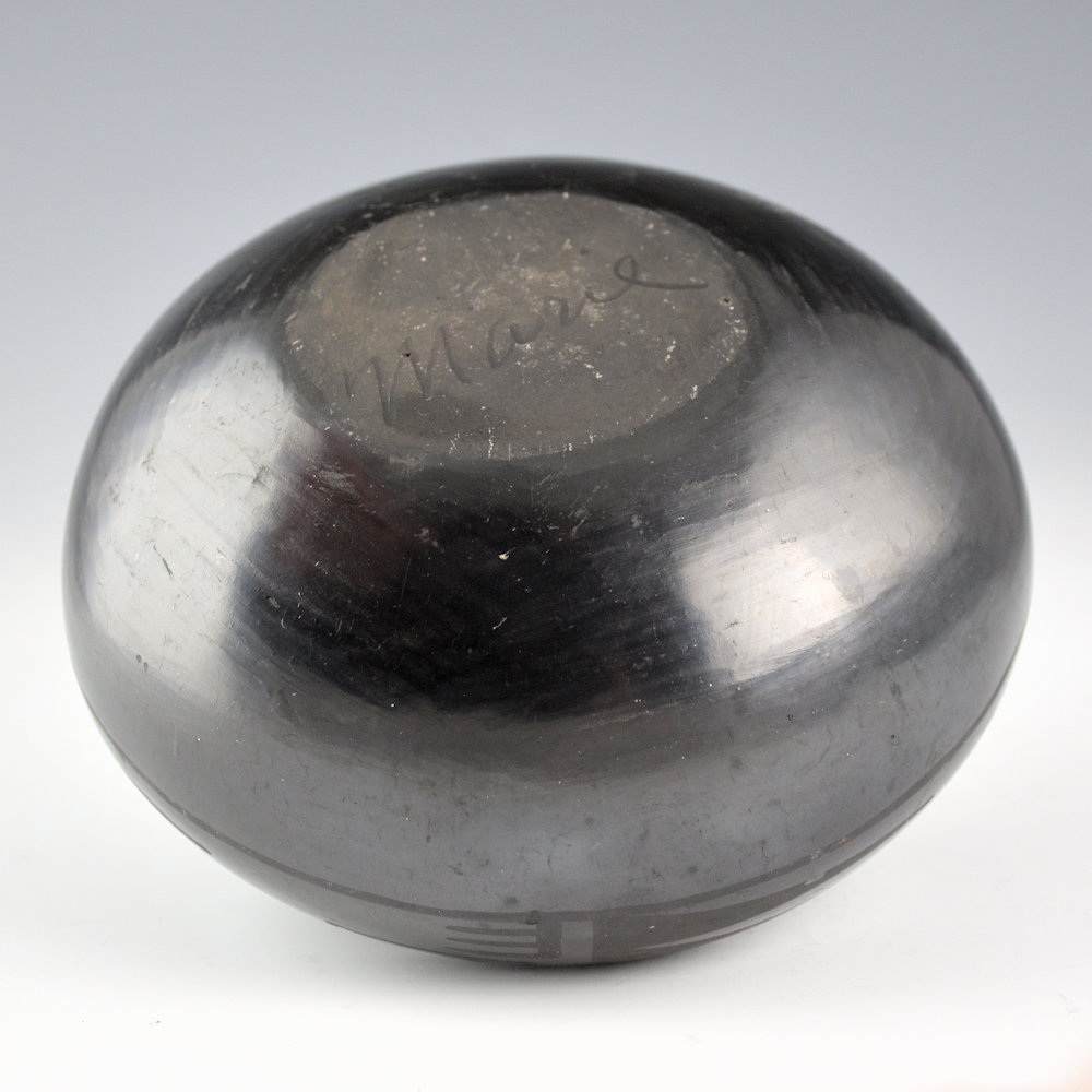 This is a tightly painted bowl by Maria Martinez from the early 1920’s. At this time, while Maria was making and polishing the pottery, her husband, Julian Martinez (1897-1943), was painting the designs. This bowl has a round shape and it is fully polished. The design has clouds and wind. However, notice the use of the thin lines. This is typical of Julian’s early pottery where he painted with very delicate lines. The bowl was fired to a glassy black coloration. It is signed on the bottom, “Marie”. It is in very good condition with no chips, cracks, restoration or repair.