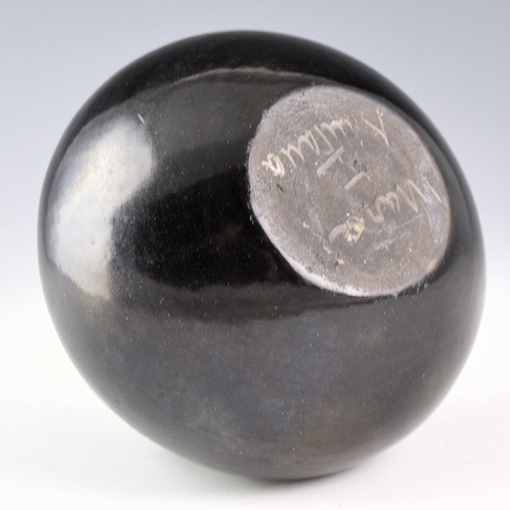This jar by Maria Martinez is small but a gem! It was made by Maria Martinez and painted by her daughter-in-law Santana.It has a nearly gunmetal appearance to the surface of the piece. The design is the classic feather pattern, but note the symmetry of the 31 feathers as they are painted on the surface. It is signed on the bottom in the clay, “Marie + Santana”. It is in excellent condition with no chips, cracks, restoration or repair. Definitely a classic!