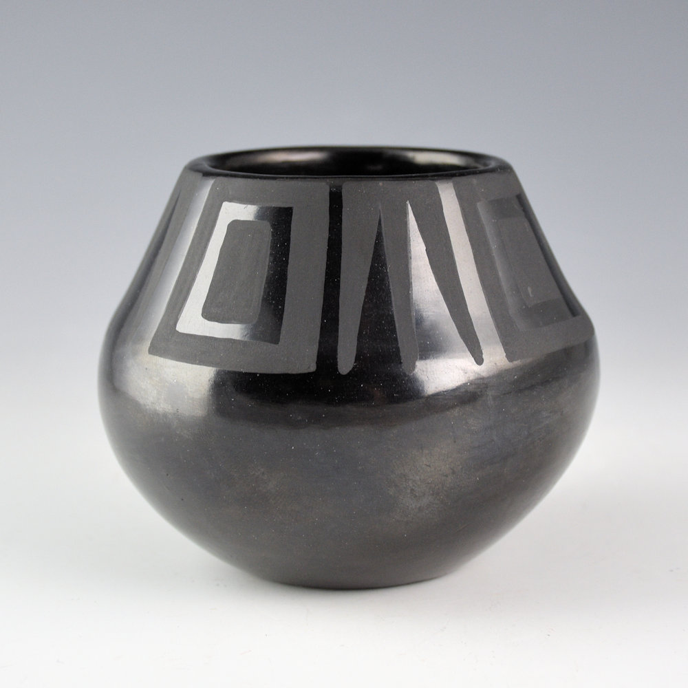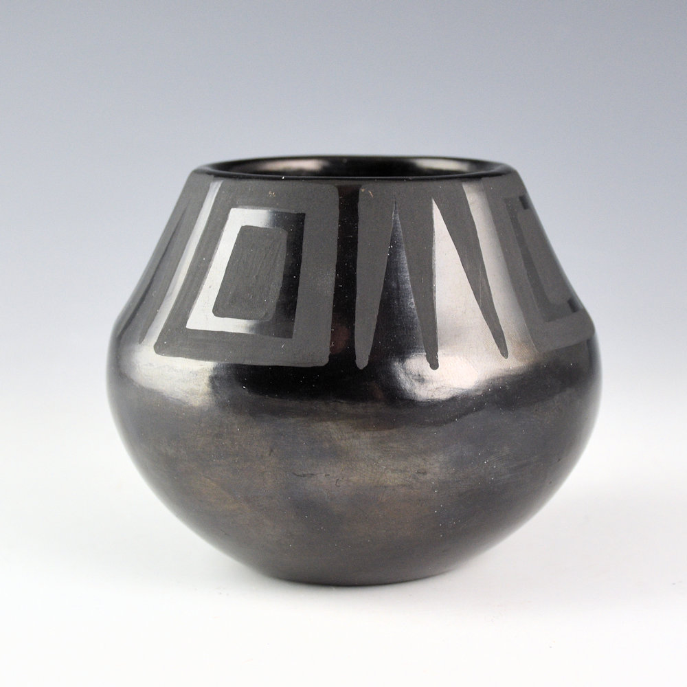 This jar by Maria Martinez is a classic shape and design. The jar was made and stone polished by Maria Martinez and painted by her daughter-in-law Santana. The design is a house (the square) and mountain pattern. It is signed on the bottom in the clay, “Marie + Santana”. It is in very good condition with no chips, cracks, restoration or repair. Definitely a classic!