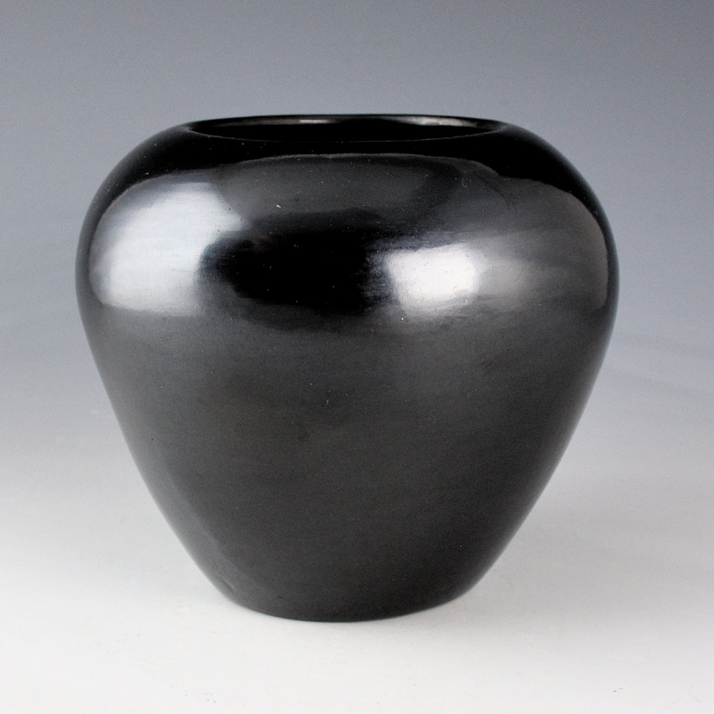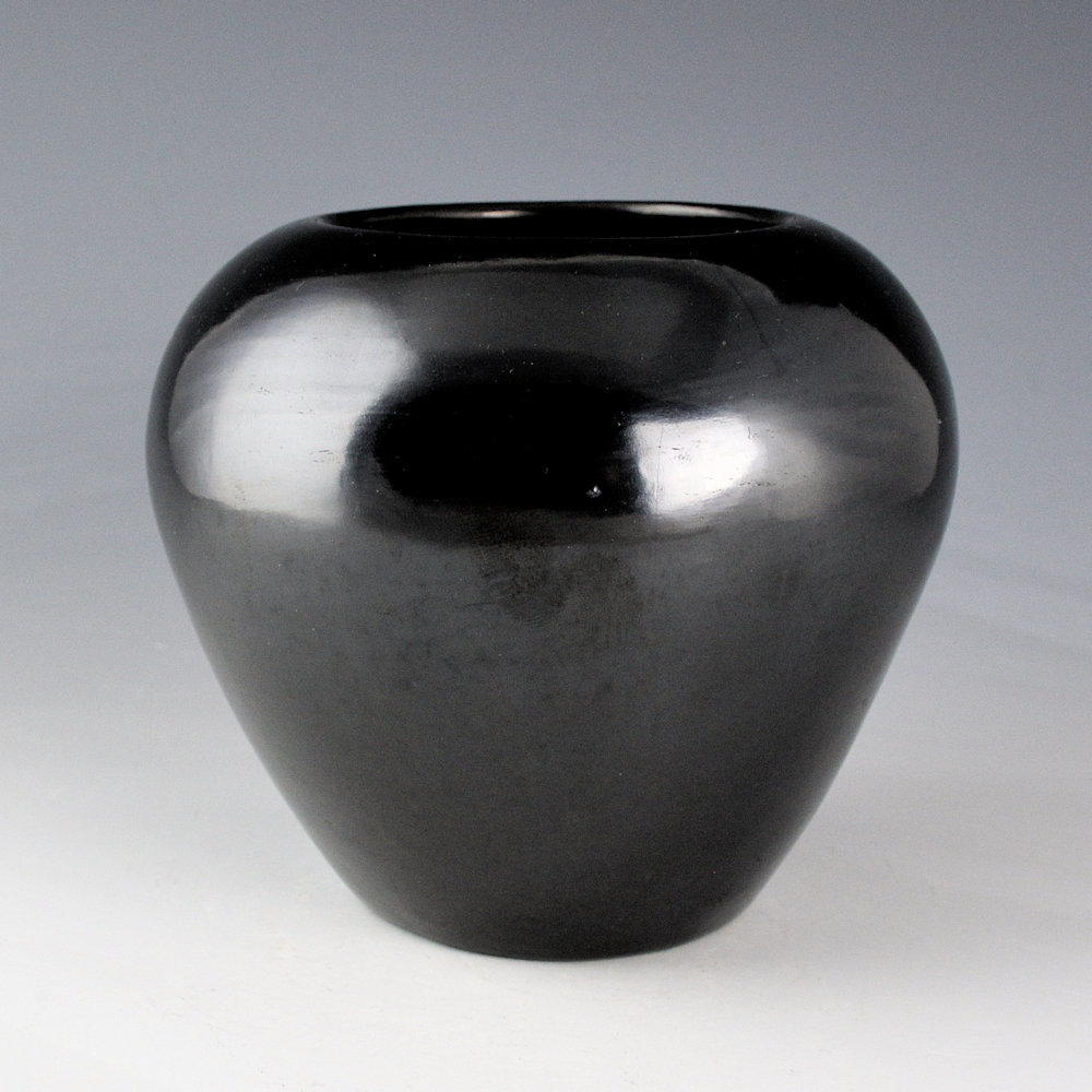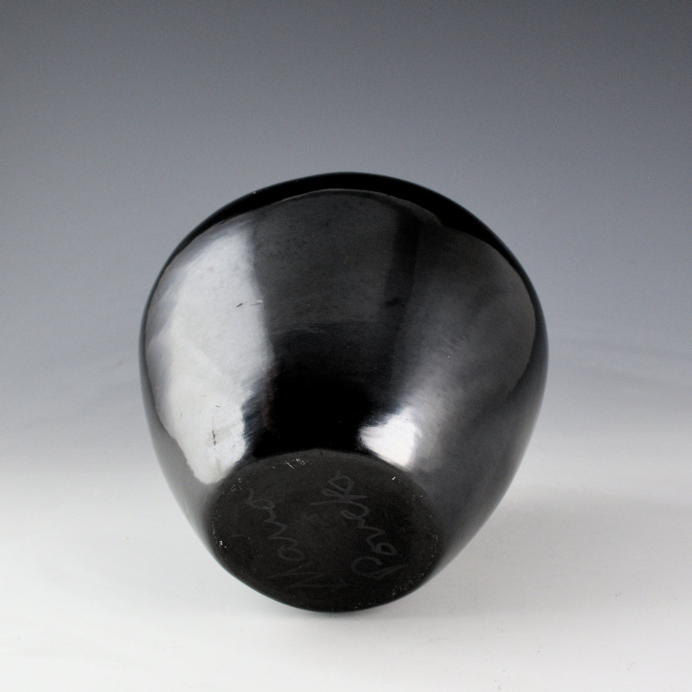 In the 1950s, Maria Martinez created a series of pieces that were simply stone polished with no design. As she primarily made the pottery and polished it this was fitting with the other pieces of her career. This bowl is highly polished and fired a deep black coloration. It has that “mirror-like” surface for which Maria was famous. The bowl is signed in the clay, “Maria Poveka”. This is a combination of her Anglo and Tewa names. Her name, “Poveka” means “Water Lilly”. It is in excellent condition with no chips, cracks, restoration or repair.