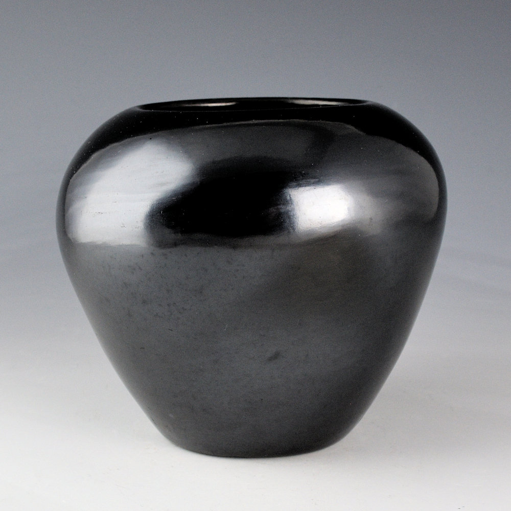 In the 1950s Maria Martinez created a series of pieces that were simply stone polished with no design. As she primarily made the pottery and polished it this was fitting with the other pieces of her career. This bowl is highly polished and fired a striking metallic gunmetal coloration from the firing. It has that “mirror-like” surface for which Maria was famous. Take a look at the photo of the top and you can see the black lines of the firing grate, as the bowl was fired upside down! It’s always fascinating to be able to “read” the surface of a piece and understand it was made and fired. The bowl is signed in the clay, “Maria Poveka”. This is a combination of her Anglo and Tewa names. Her name, “Poveka” means “Water Lilly”. It is in excellent condition with no chips, cracks, restoration or repair.