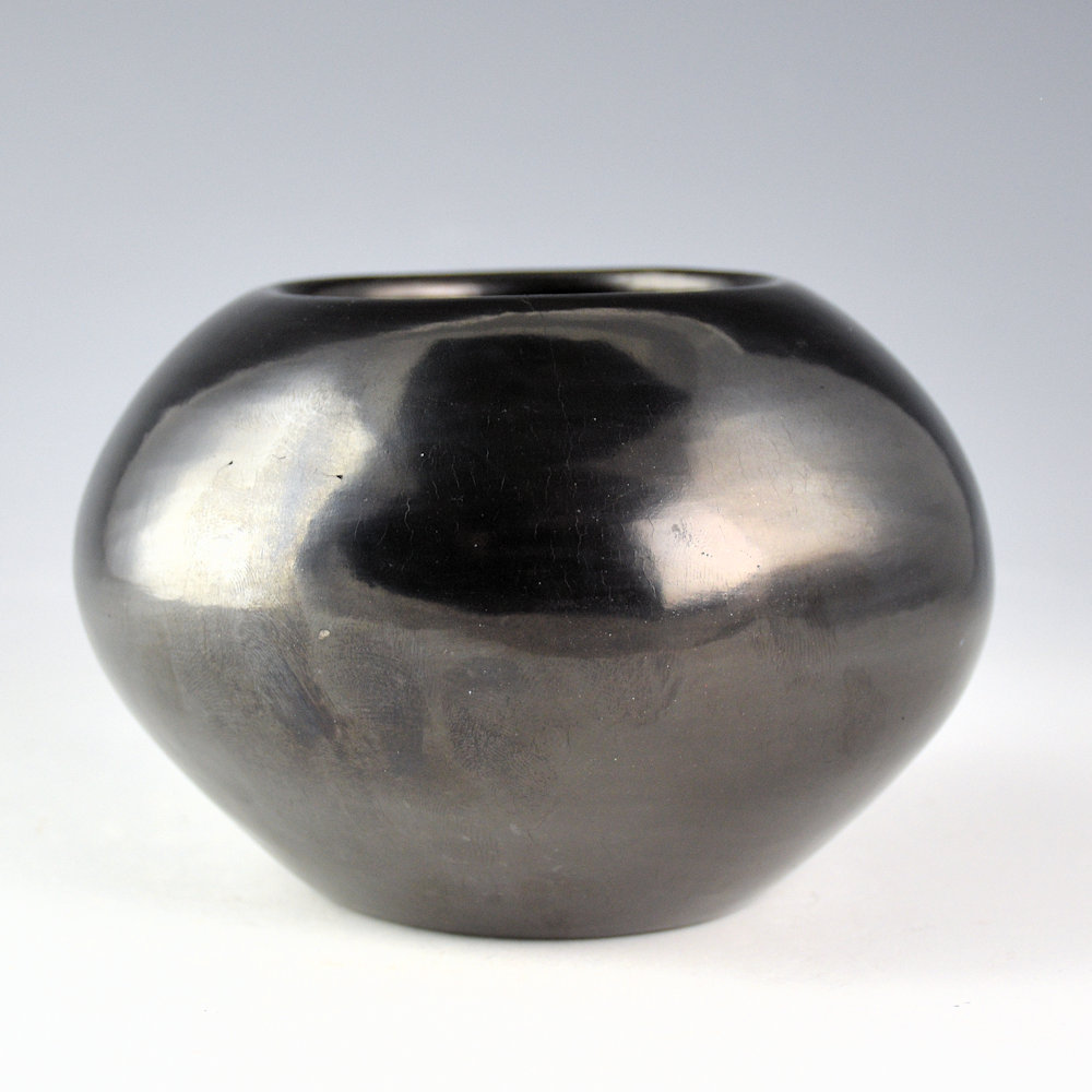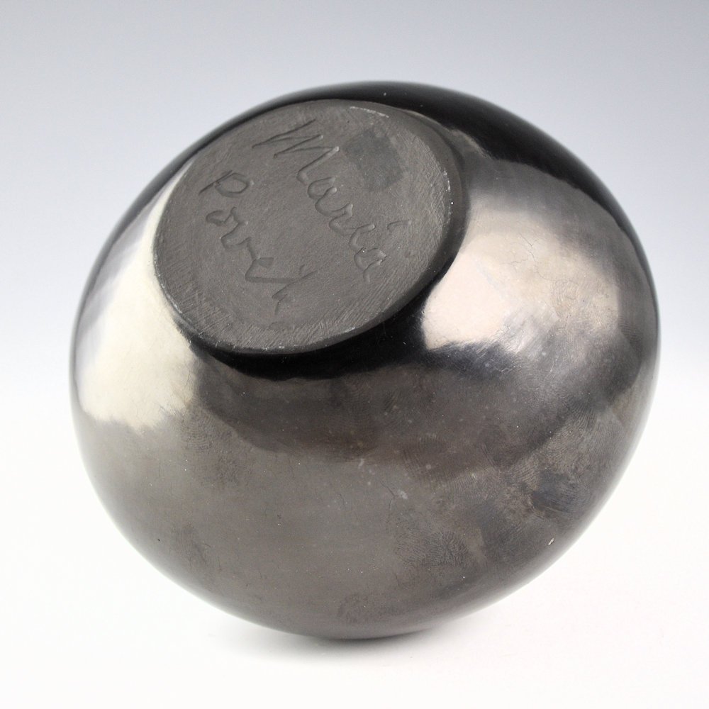 In the 1950s Maria Martinez created a series of pieces that were simply stone polished with no design.  As she primarily made the pottery and polished it this was fitting with the other pieces of her career.  This bowl is her classic round shape and is highly polished.  It was fired to a glassy black coloration.  It is that “mirror-like” surface for which Maria was famous.  The bowl is signed in the clay, “Maria Poveka”.  This is a combination of her Anglo and Tewa names.  Her name, “Poveka” means “Water Lilly”.  It is in excellent condition with no chips, cracks, restoration, or repair.