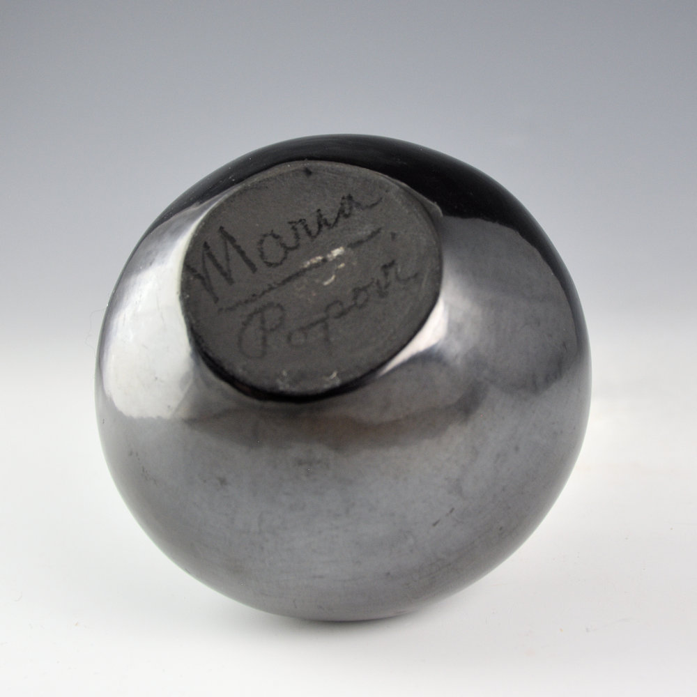 This is a classic gunmetal-fired bowl by Maria Martinez and her son, Popovi Da. Maria made and polished the bowl and it was fired by her son, Popovi Da (1923-1971). Popovi focused on both the painted surfaces of the pottery as well as the firings. This bowl has a glassy, silvery-metallic appearance across nearly the entire surface. It is signed on the bottom in the clay, “Maria / Popovi”. The signature indicates it was made between 1956-9. It is in very good condition with no chips, cracks, restoration, or repair. Classic pieces by Maria and Popovi with such highly polished surfaces and this size are not only a rarity but a great addition to any collection!