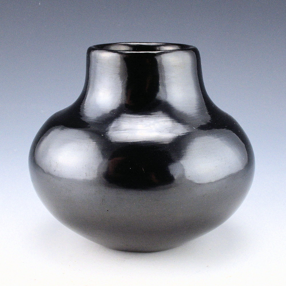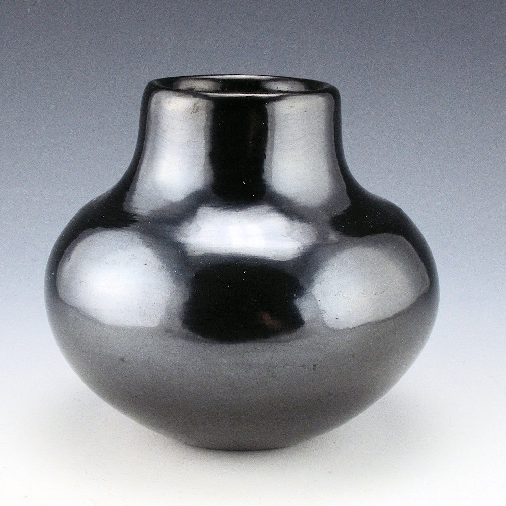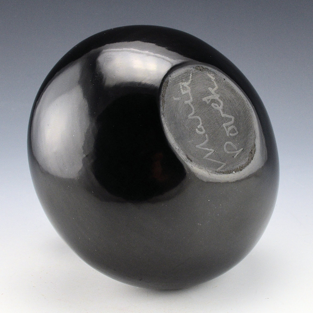 In the 1950s Maria Martinez created a series of pieces that were simply stone polished with no design.  As she primarily made the pottery and polished it this was fitting with the other pieces of her career.  This jar is one of my favorite shapes.  It has a round shoudler and a sharp edge before going up to the neck.  The sharp edge can be seen in the photos and easier to be felt.  It’s not often I see this shape but it is elegant and reflective of the light.  This jar was fired to a silvery, gunmetal coloration. It has that “mirror-like” surface for which Maria was famous.  The jar is signed in the clay, “Maria Poveka”.  This is a combination of her Anglo and Tewa names.  Her name, “Poveka” means “Water Lilly”.  It is in excellent condition with no chips, cracks, restoration or repair.