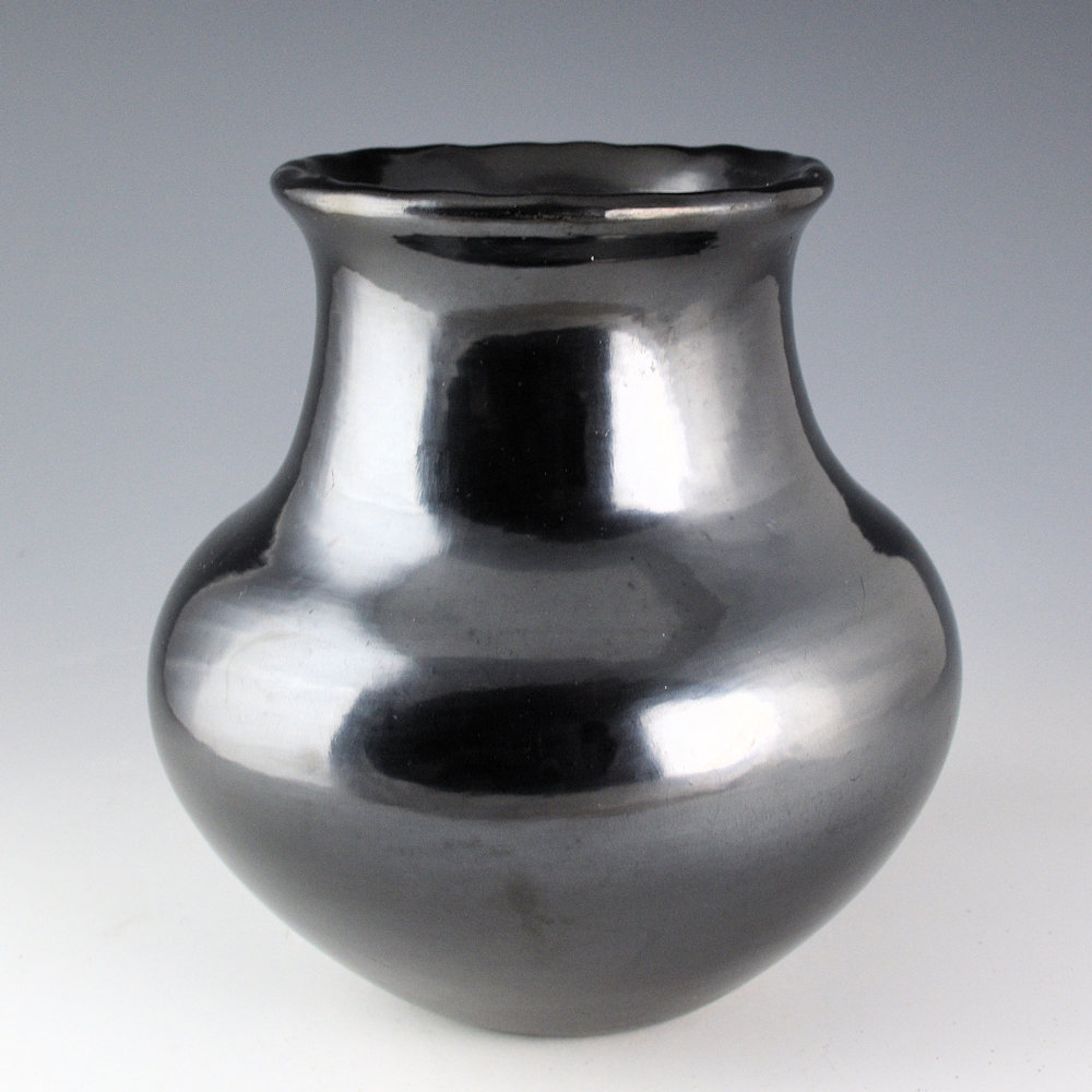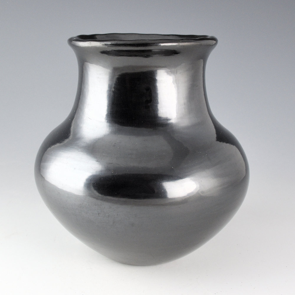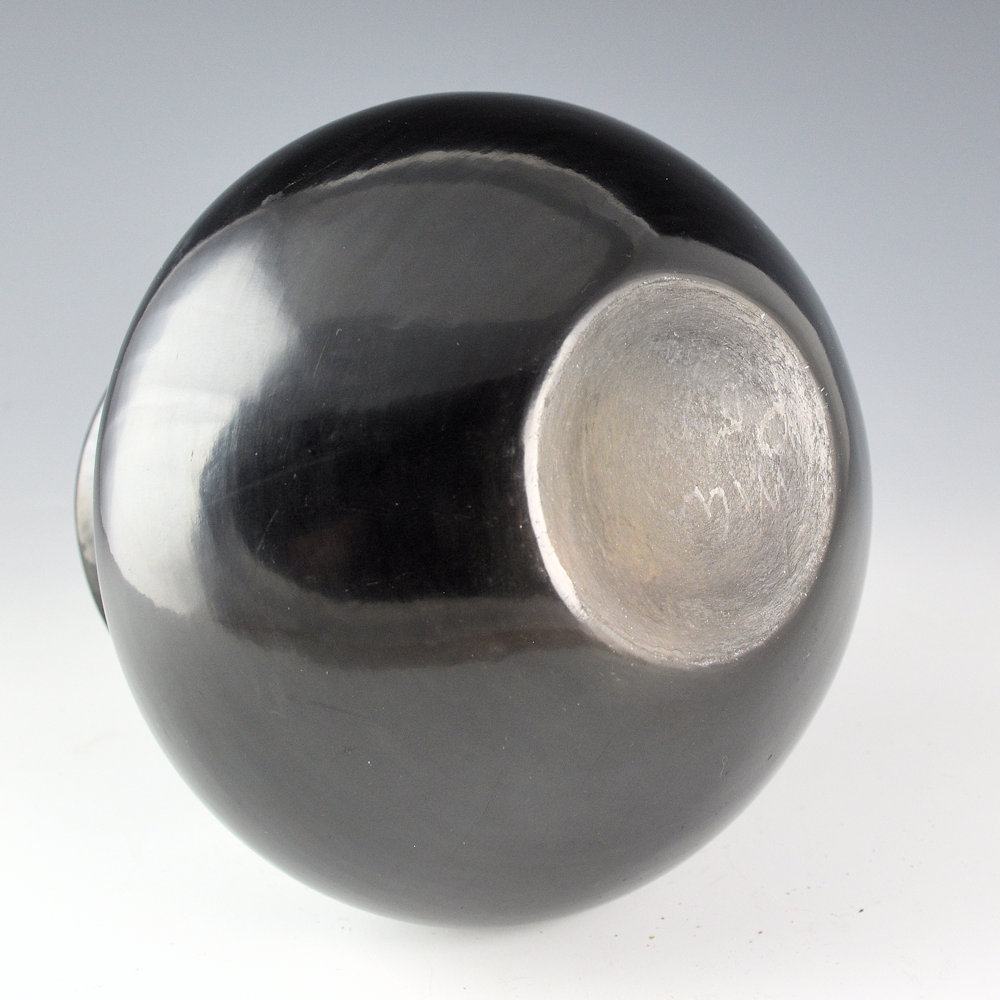 In the 1950s Maria Martinez created a series of pieces that were simply stone polished with no design. As she primarily made the pottery and polished it this was fitting with the other pieces of her career. This water jar has a round shoulder and a fluted or “raindrop” rim. It is highly polished and fired a striking metallic gunmetal coloration from the firing. It has that “mirror-like” surface for which Maria was famous. The water jar is indented on the bottom, much like historic San Ildefonso pottery, when the pieces would be worn on their heads to carry water. The jar is signed in the clay, “Maria Poveka”. This is a combination of her Anglo and Tewa names. Her name, “Poveka” means “Water Lilly”. It is in excellent condition with no chips, cracks, restoration or repair.
