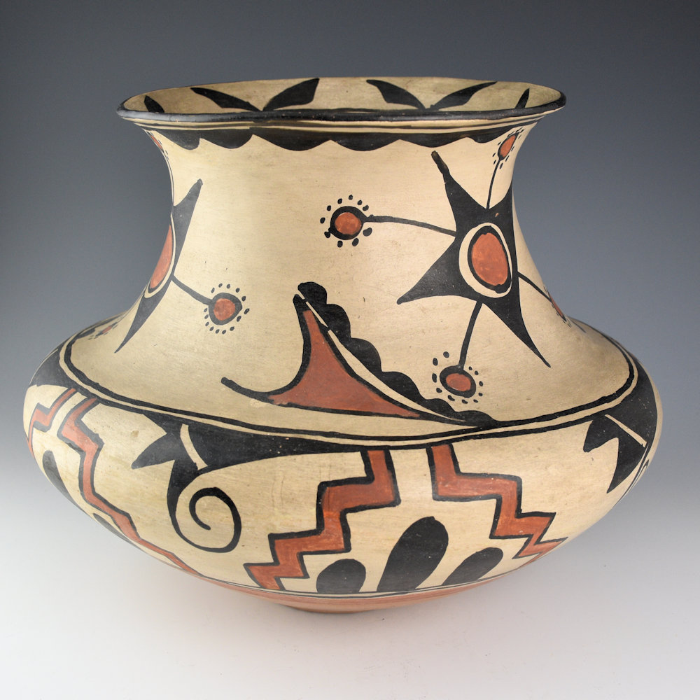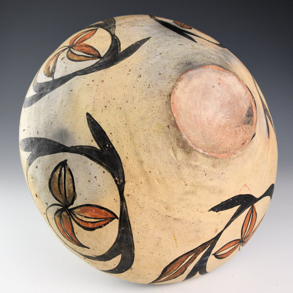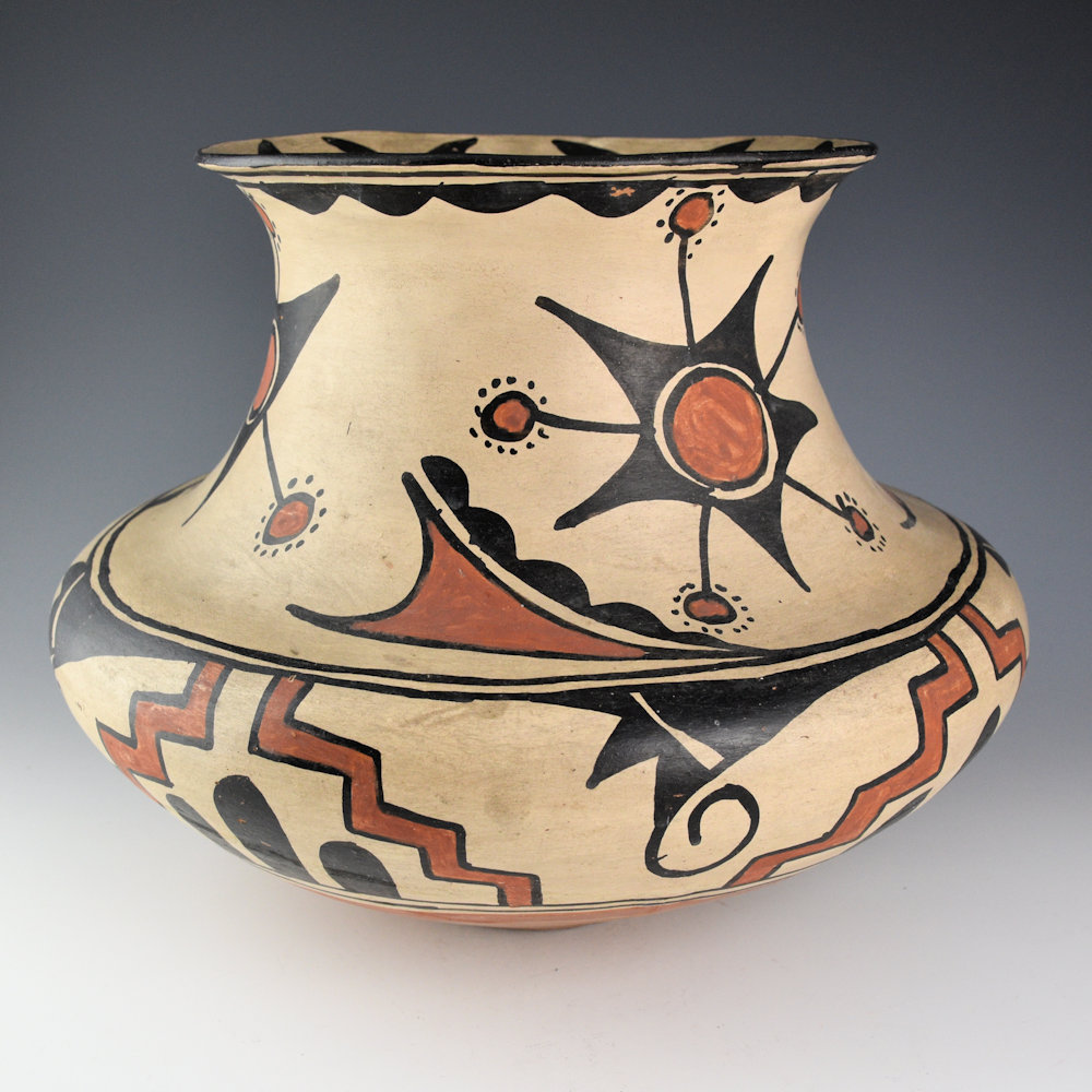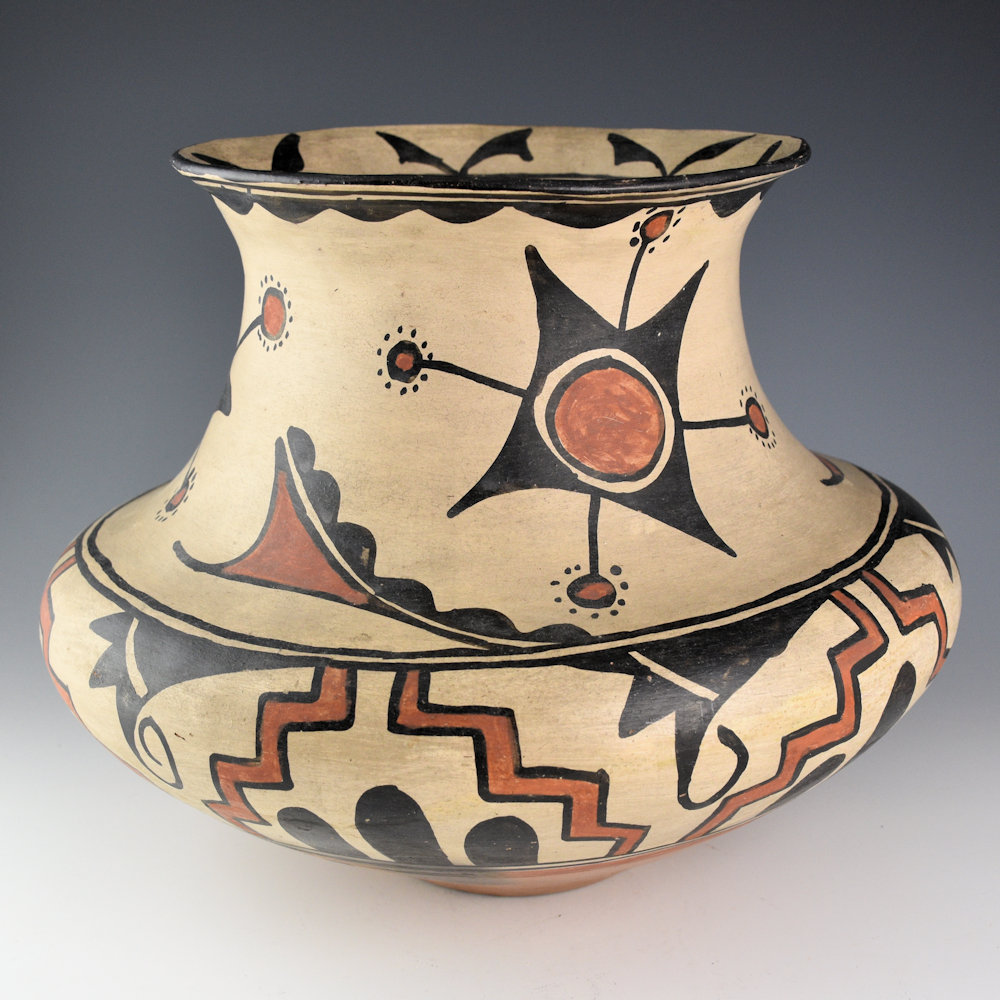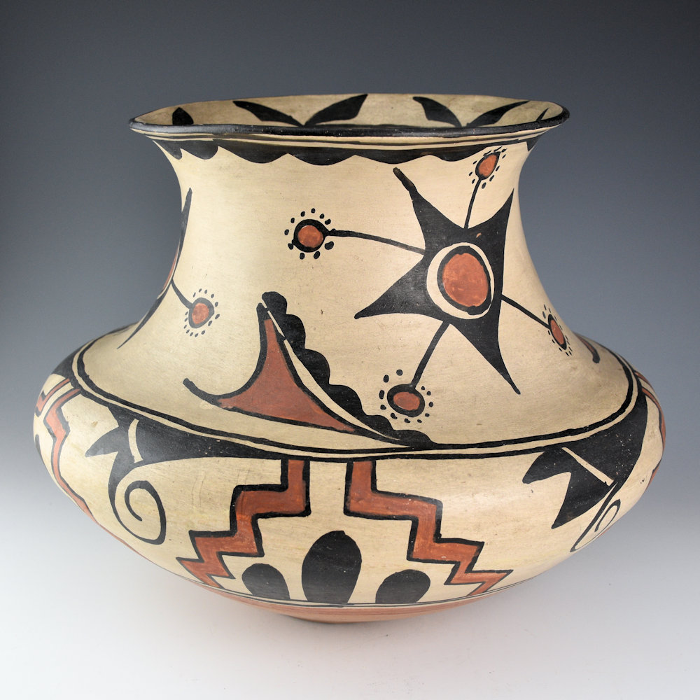 In 1904, when Maria Montoya married Julian Martinez (1885–1943), she was already making pottery. Her pieces before this time had been painted by Cresencio Martinez, Alfredo Montoya, Anna Martinez, and other relatives. Once Maria was married, it was Julian who began to paint their polychrome pottery. Julian was quickly recognized for the precision and creativity of his designs. This large water jar has a creative flower or star design. There is a similar piece that was photographed with a young Maria for a Fred Harvey Company postcard. The designs are more bold compared to the later thin, fine-line patterns used by Julian in the 1920’s. The jar is in excellent condition with no chips, cracks, restoration, or repair. It was published in the book, “Maria and Modernism” and featured in the exhibition at the Heard Museum.