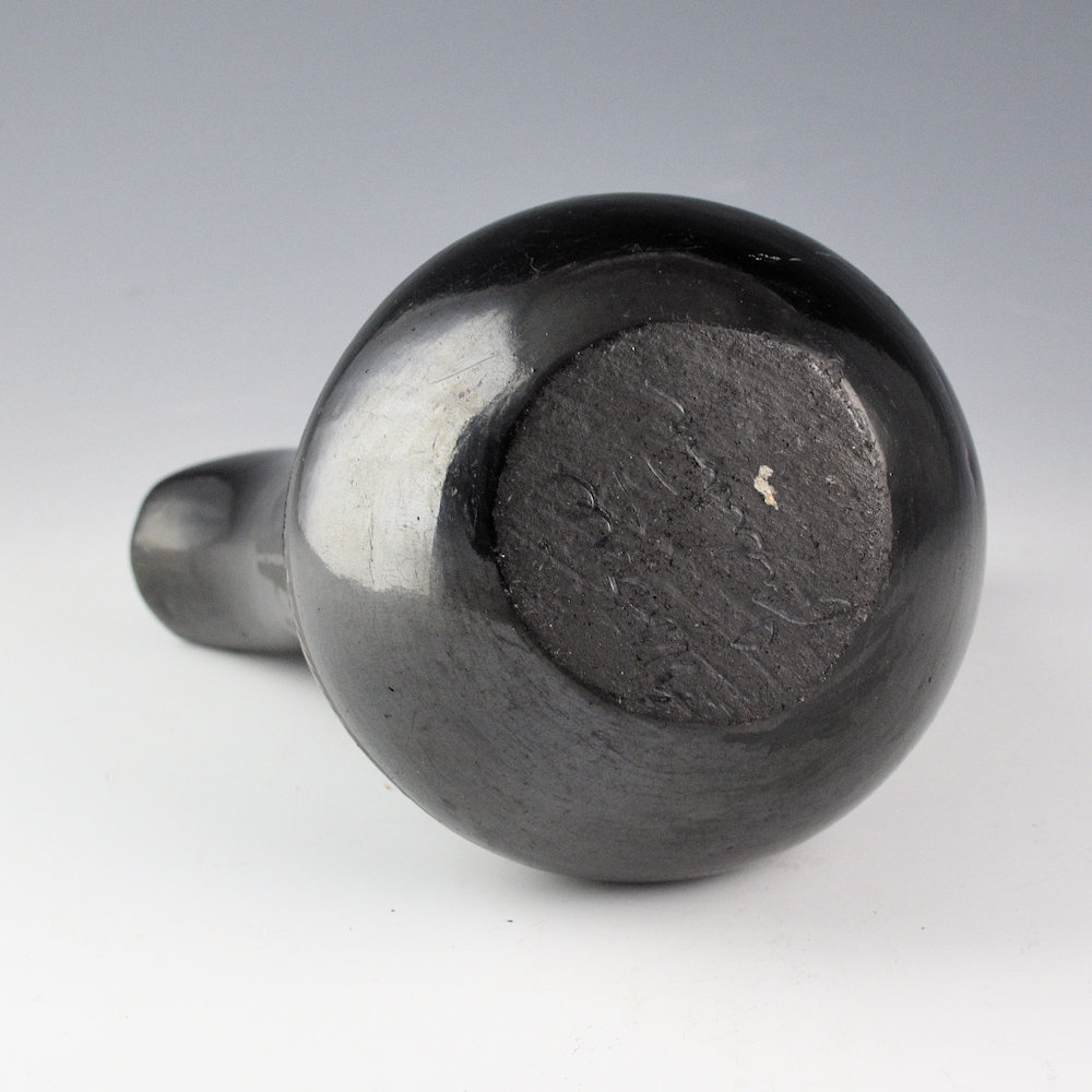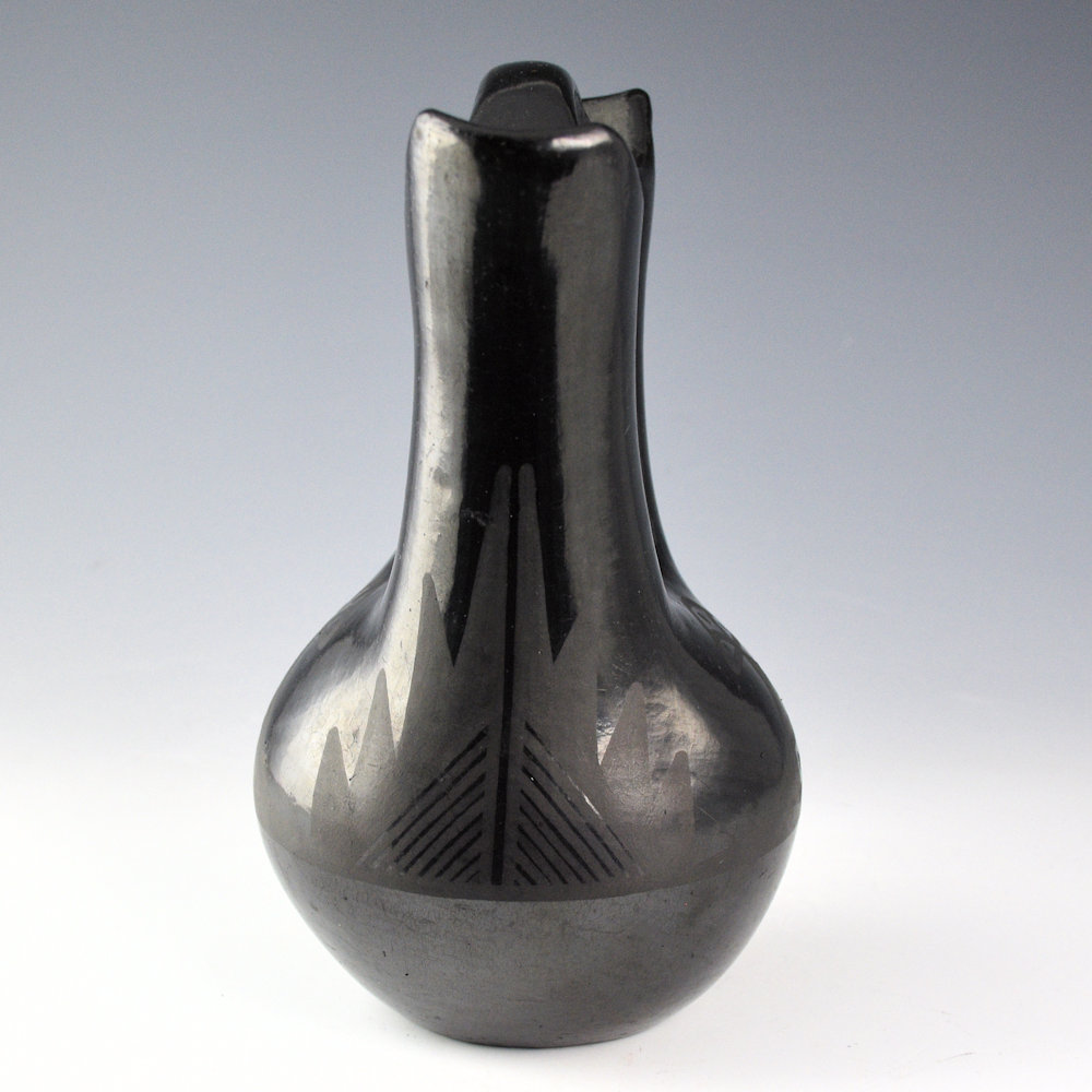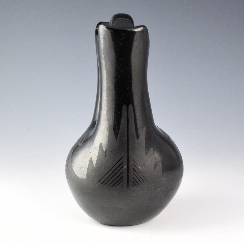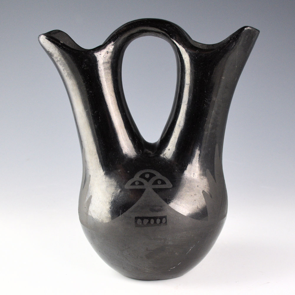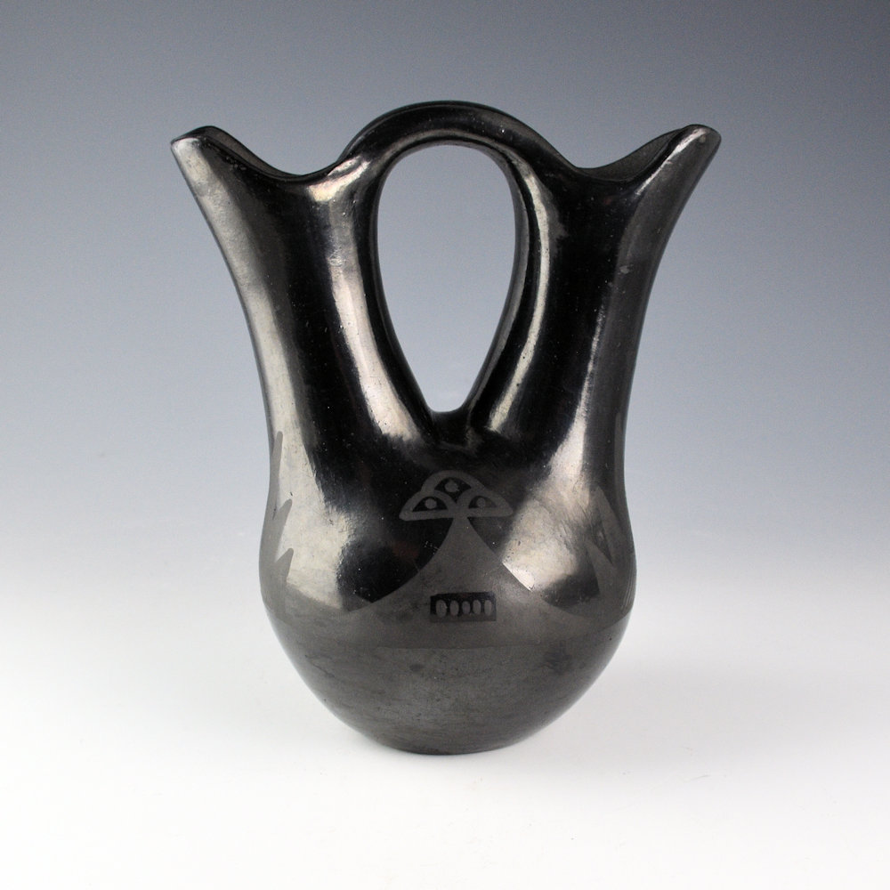 This is an unusual early wedding vase by Maria Martinez and her husband, Julian. The wedding vase was made and polished by Maria and then painted by Julian. It was in the 1920s-30s that the “wedding vase” became a novelty and a new shape in Pueblo pottery. This wedding vase has a round body with elongated spouts. The entire surface, even the handle, is fully polished. The vase has a tiny cloud design on each side. There are additional fine-line mountain patterns on the opposite side. The use of the lines makes one think it is a late 1920s piece rather than 1930s. They are traditional designs in a “modern” style of vessel. The piece was traditionally fired a deep black coloration. The piece is signed in the clay, “Marie + Julian”. It is in very good condition with no chips, cracks, restoration, or repair. There are some minor rubs on the surface.