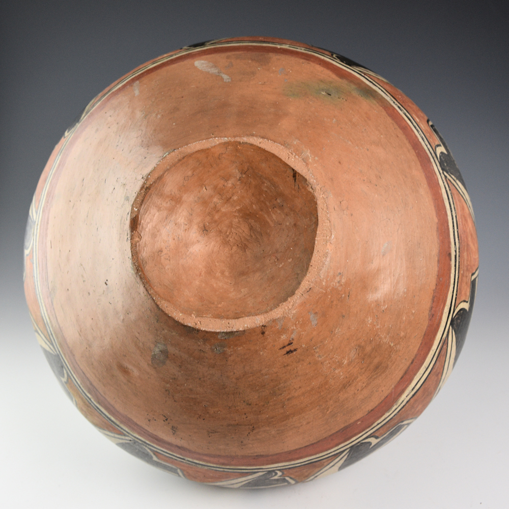 Maximilliana “Anna” Montoya Martinez (1885–1955) was a sister of Maria Martinez. She was married to Cresencio Martinez (a brother of Tonita Roybal). Anna was considered among the best painters of designs on pottery. She not only painted her own pottery but was noted for painting pottery for Marianita Roybal as well as for her own sister, Maria Martinez. The jar has her stylistic checkerboard pattern and a red polished rim, for which she was well known. The surface of the jar reflects the traditional firing. It is in very good condition with no cracks, restoration, or repair. It was published in the book, “Maria and Modernism,” and featured in the exhibition at the Heard Museum.