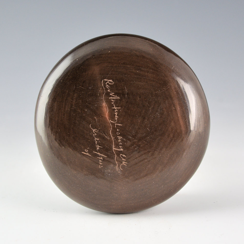 Ron “Looking Elk” Martinez has both Taos and Isleta ancestry.  He began making pottery in the 1990s.  He studied pottery at IAIA.  He received an SAR Internship in 1997 and the Challenge Award at Santa Fe Indian Market in 2000.  Each piece is coil-built, stone polished, and traditionally fired, then etched with designs.  This seedpot was fired brown and then etched with intricate designs.  There are clouds, corn, and plant designs.  Note the tiny checkerboard field patterns!  It is a complex etched design.  It is signed, “Ron Looking Elk”.  It is in excellent condition with no chips, cracks, restoration, or repair.