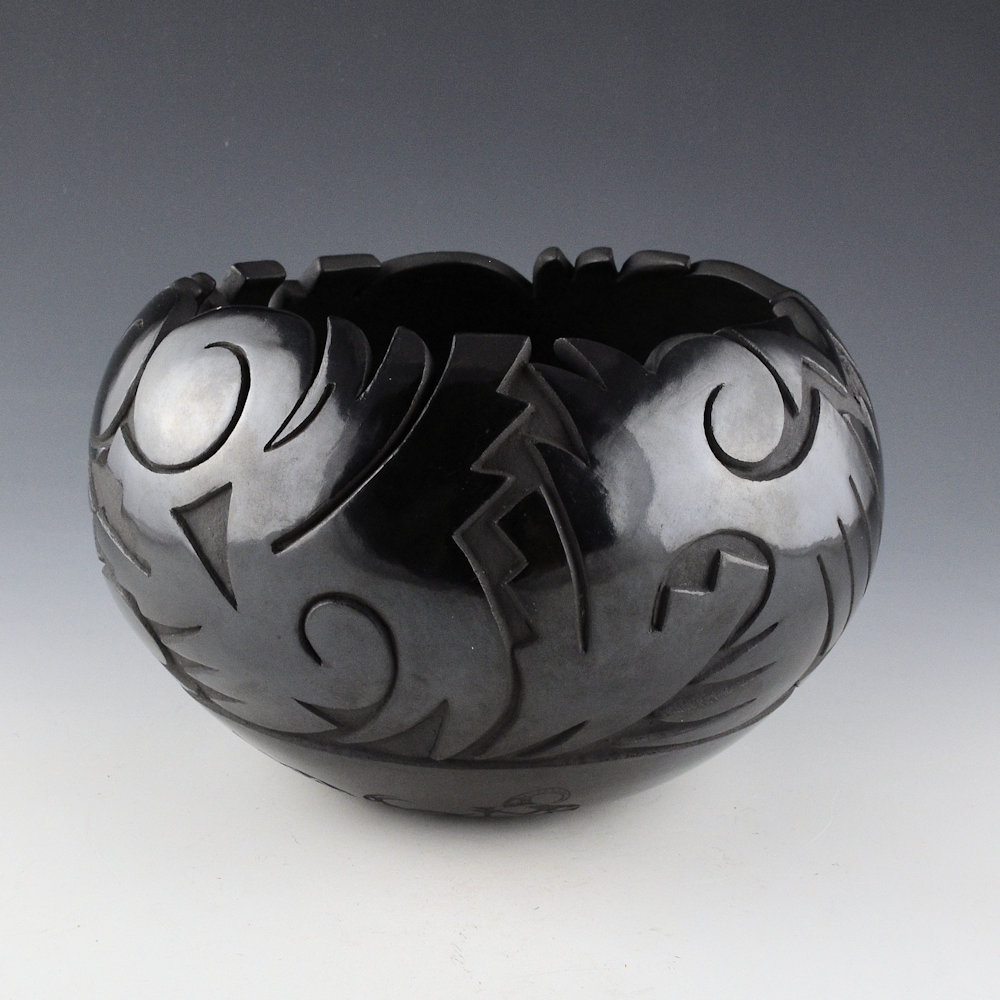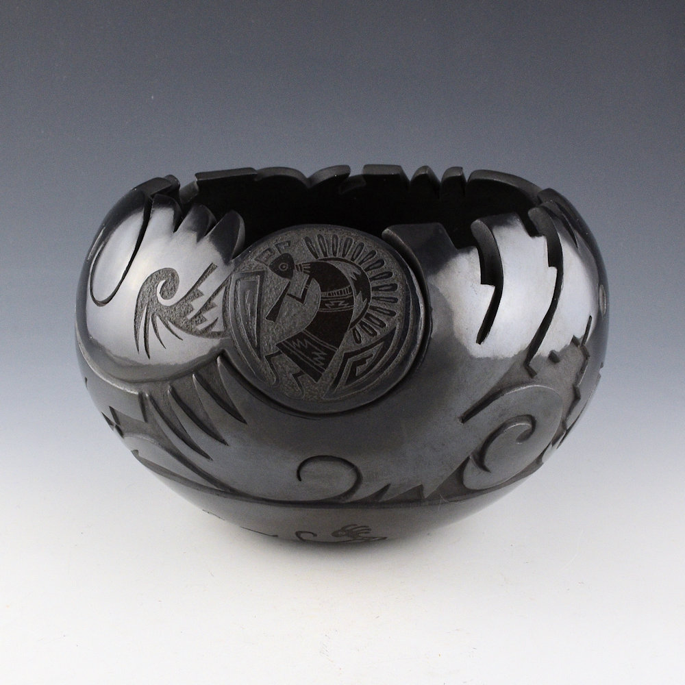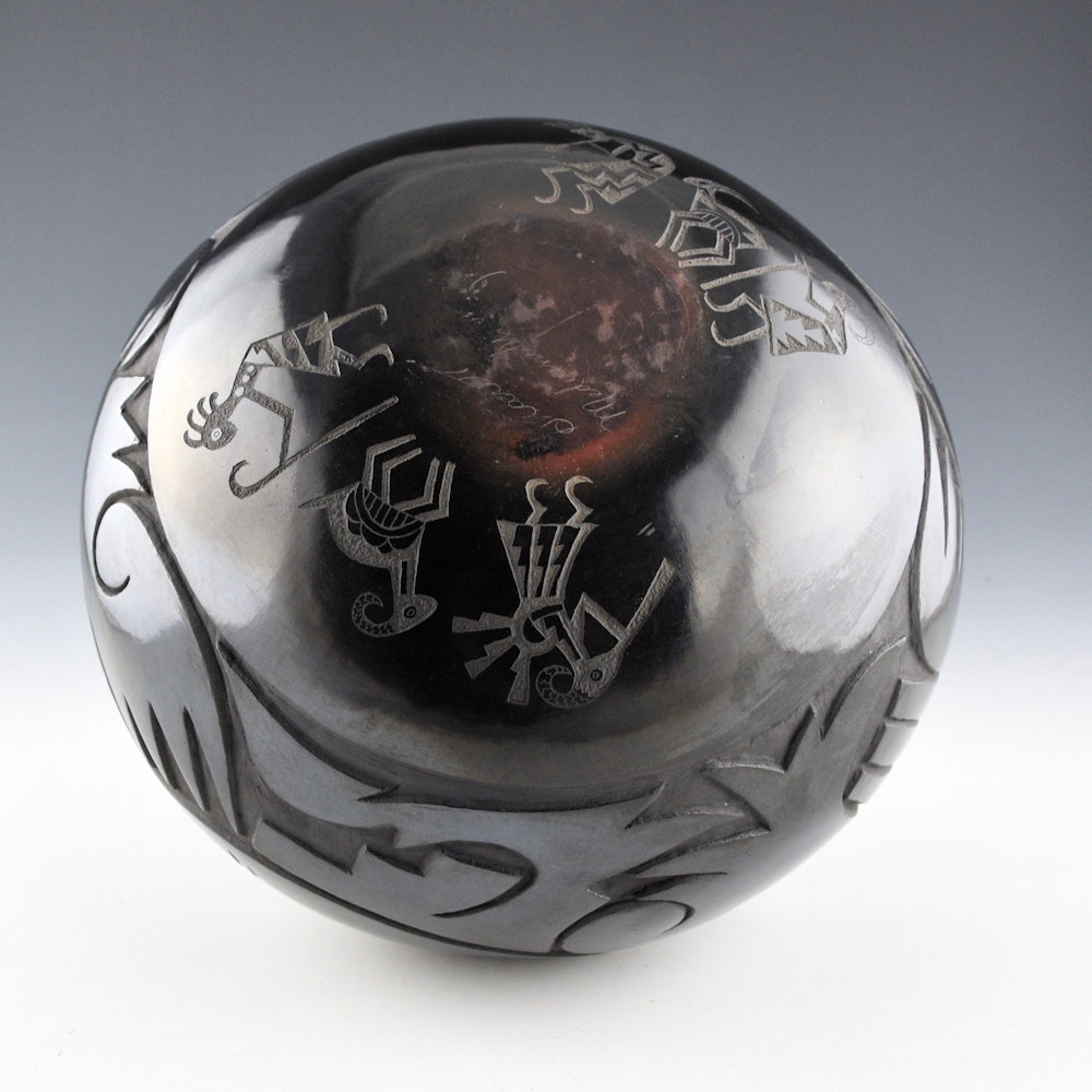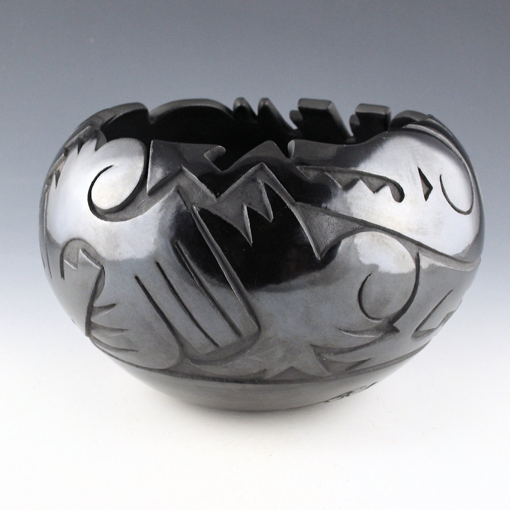 Grace Medicine Flower began her career making miniature pottery with incised designs. This is one of her few larger black carved and etched pieces. The bowl is from 1993 and is deeply carved with an avanyu encircling the bowl. The rim of the bowl is carved away to match the shape of her designs. Grace always said this one was one of the most difficult moments in the process, as the carved rim could easily crack in carving, polishing, or firing! The bowl has numerous carved areas and one large sgraffito flute player medallion. The design was etched into the clay before the firing. The bottom of the bowl has a Mimbres ram, a Mimbres Ram Dancer, and a Mimbres Flute Player. The bowl is very highly and fired to a glassy black. It is spectacular in person! Grace always had an eye on the complete composition of a piece and made sure it was aesthetically pleasing and technically precise. The bowl is in excellent condition with no chips, cracks, restoration or repair. It is signed on the bottom in the clay, “Grace Medicine Flower”. It is a classic piece of her pottery history!