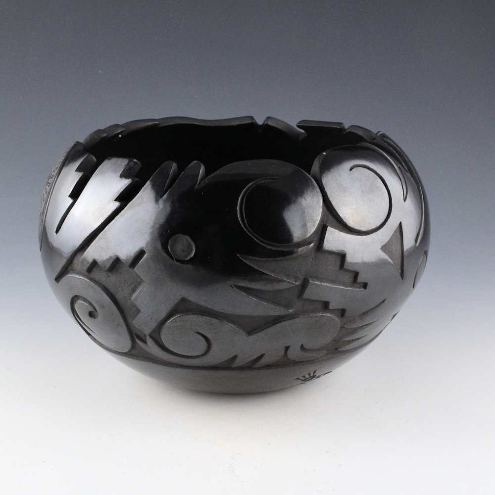 Medicine Flower, Grace – Large Black Carved Bowl with Avanyu and Flute Player (1993)