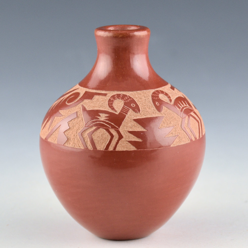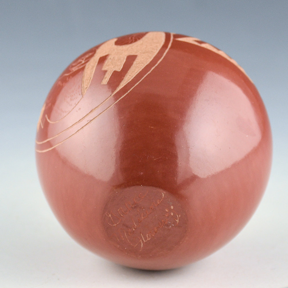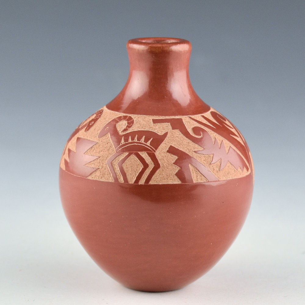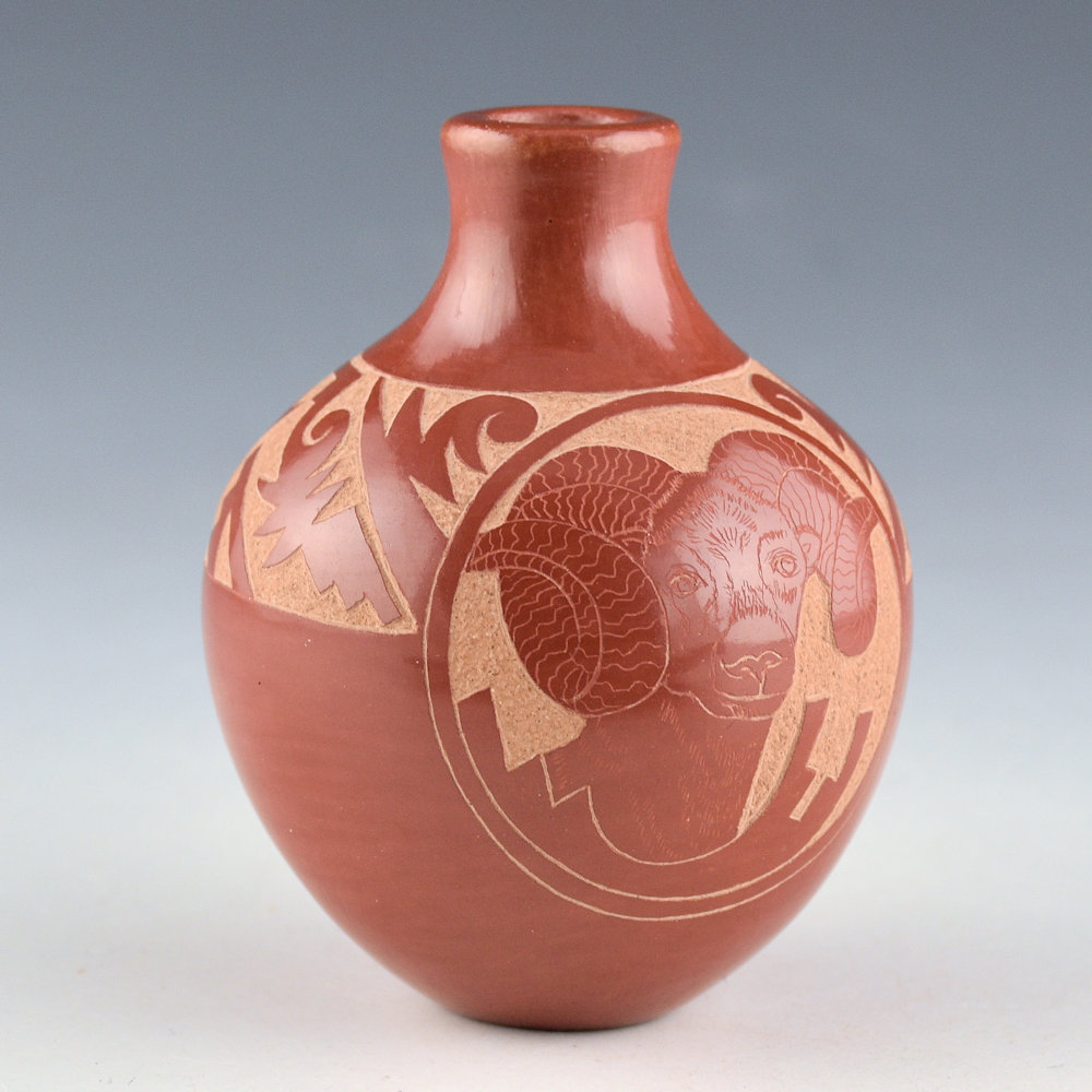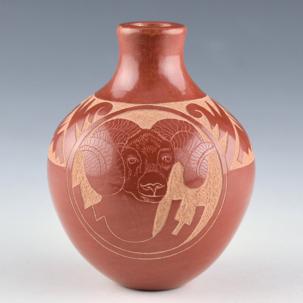 This is a detailed jar by Grace Medicine Flower.  It is from 1993.  It is fully polished has a round body and an elongated neck. The jar is fully etched with design.  There is a medallion with a Big Horn Sheep.  As the piece is turned, there are two Mimbres Big Horn Sheep on the back of the jar. They are surrounded by geometric mountain and cloud designs.  The designs are complicated and fluid across the surface.  Interestingly, Grace would always etch her pottery before it was fired.  The piece is signed on the bottom in the clay, “Grace Medicine Flower”. It is in excellent condition with no chips, cracks restoration or repair.