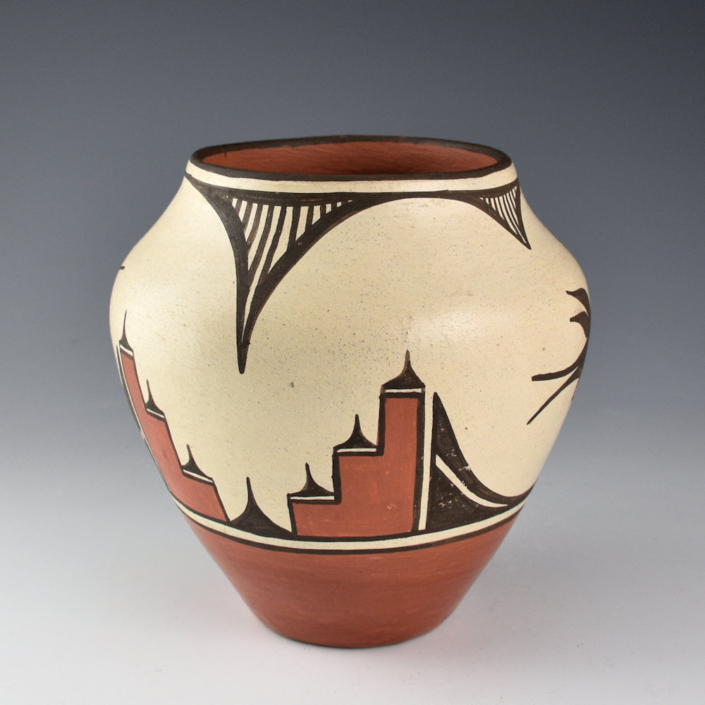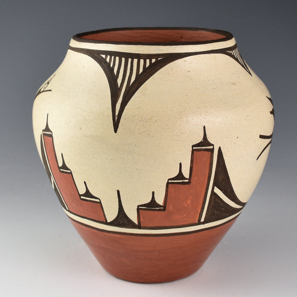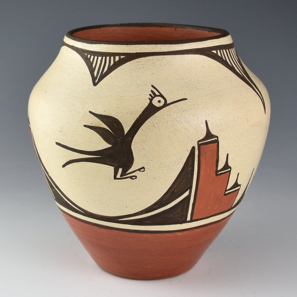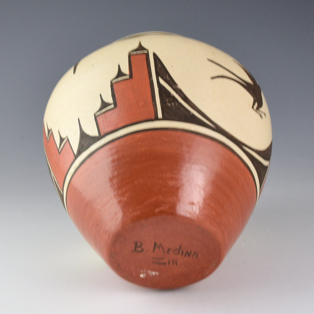 Benina Medina (b. 1930) was known for her traditional style of Zia pottery. This jar is coil-built and made from traditional Zia clay. The jar has rain designs on the rim and two Zia hummingbirds as the design. They are separated by traditional Zia cloud patterns. The jar is signed, “B. Medina”. It is in excellent condition with no chips, cracks, restoration, or repair.