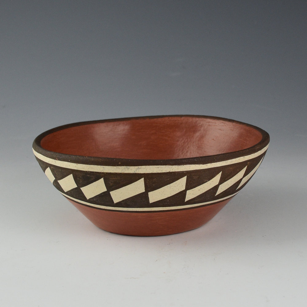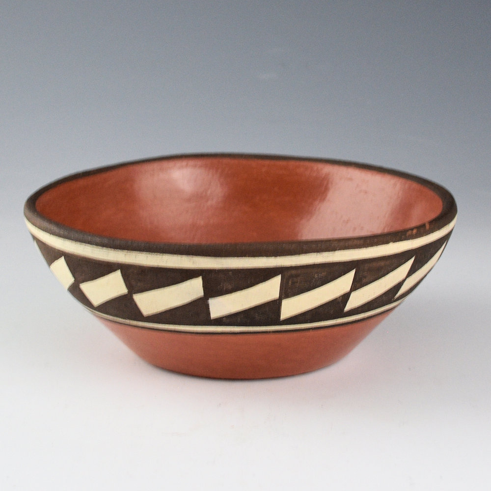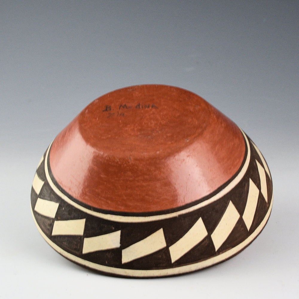 Benina Medina (b. 1930) was known for her traditional style of Zia pottery. This open bowl is coil-built and made from traditional Zia clay. The interior is fully polished. The exterior has a rain design. The bowl is signed, “B. Medina”. It is in excellent condition with no chips, cracks, restoration, or repair.