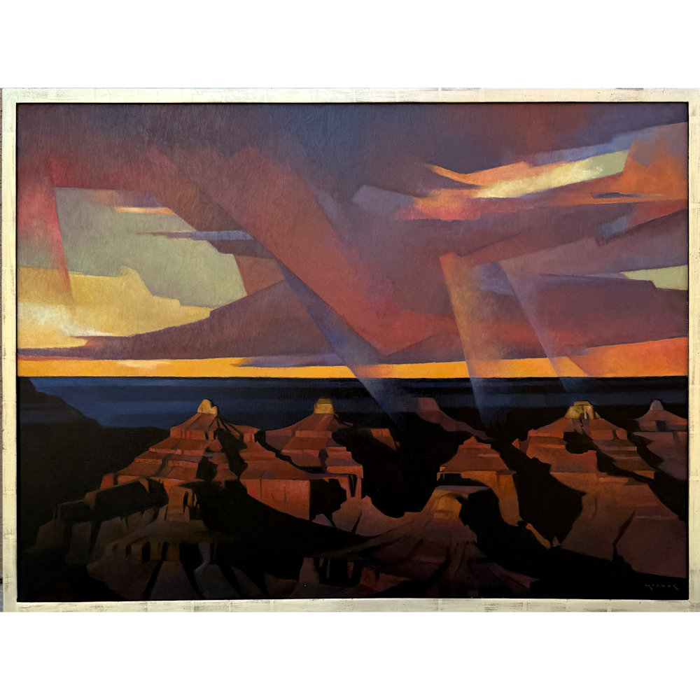 Marcia Molnar is known for paintings representing her life in Arizona. This is the largest painting we have had by Marica! It is entitled “Legends in the Light”. It is oil on linen, and is framed. This painting is a beautiful depiction of the Grand Canyon, where she visits each year to create some plein air paintings. The depth and colorations are stunning, as is the size.