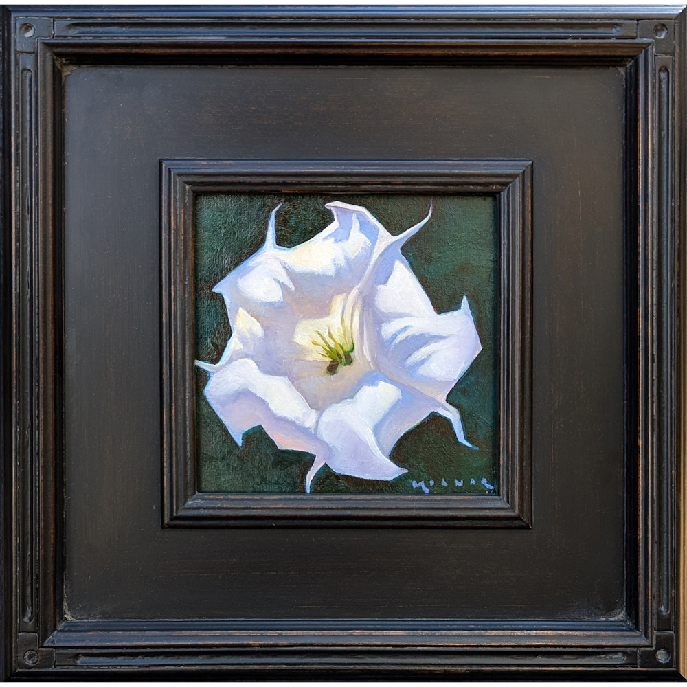 Marcia Molnar is known for paintings representing her life in Arizona. This is one of series of smaller studies she has sent to the gallery. It is a great opportunity to have a smaller piece of her work. This one is entitled, “Morning Datura“. It is oil on board and framed. The colors are exceptional in person!
