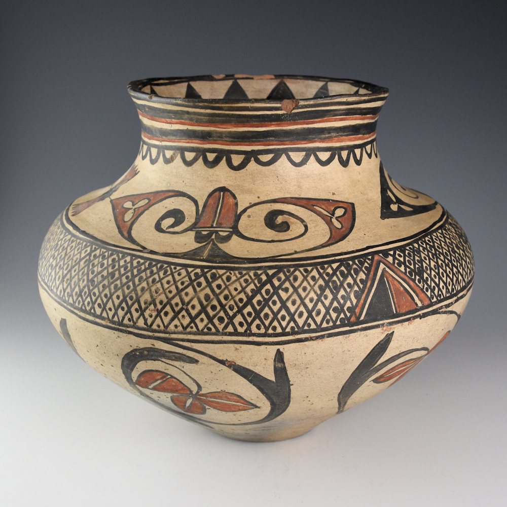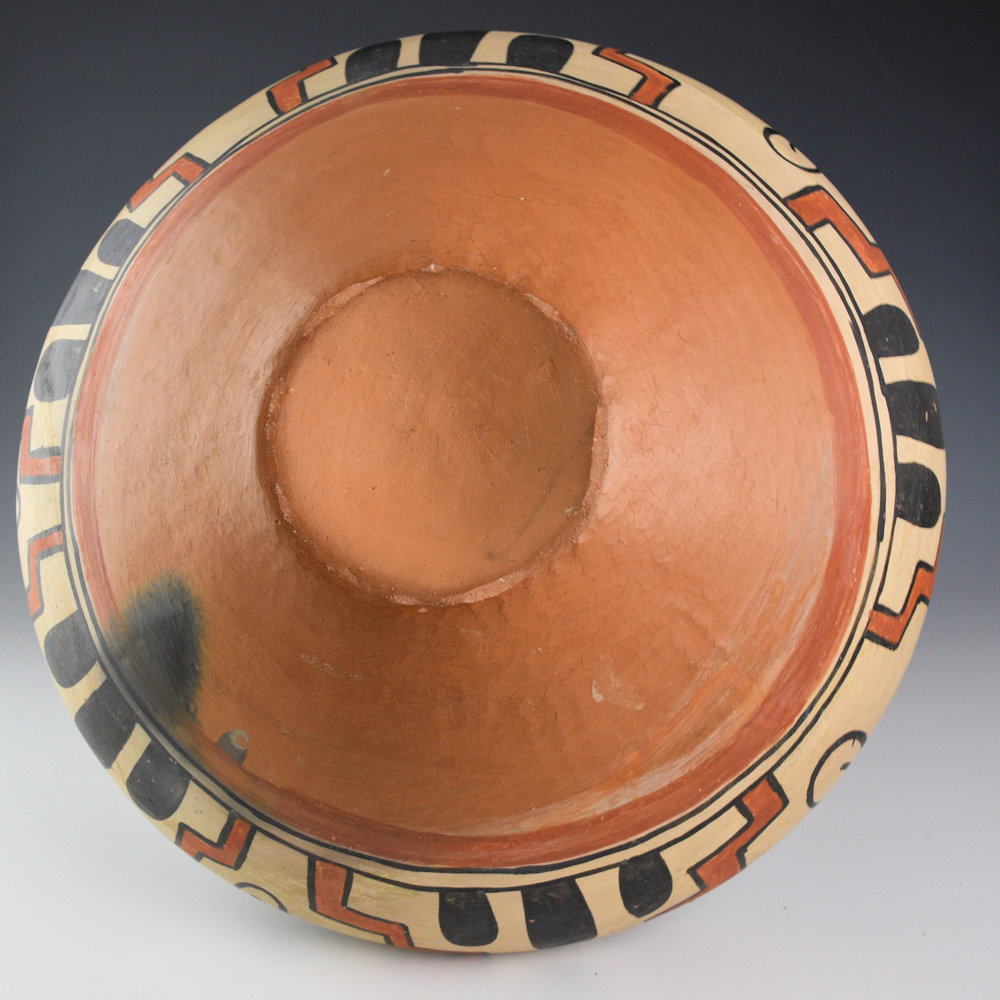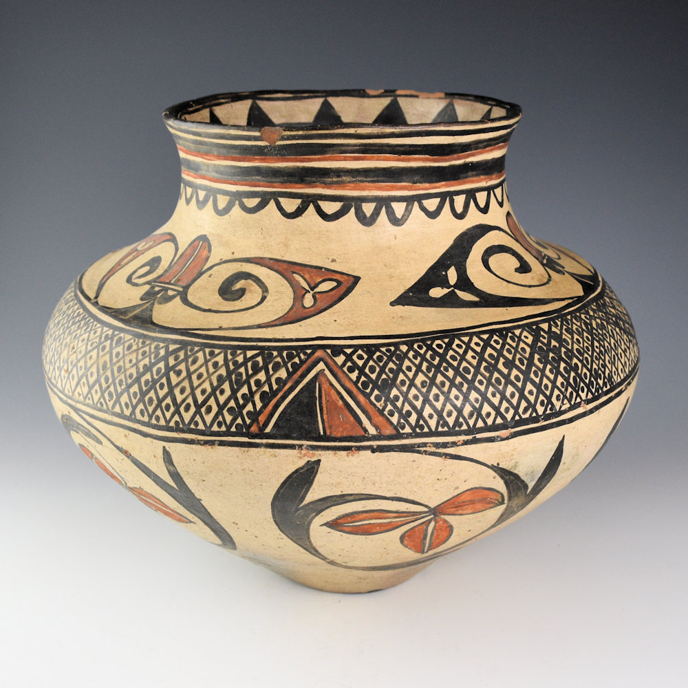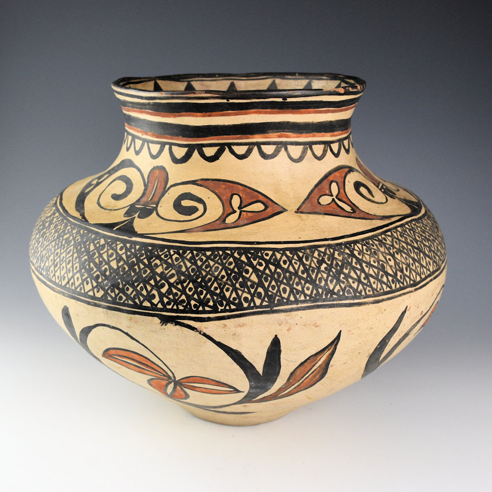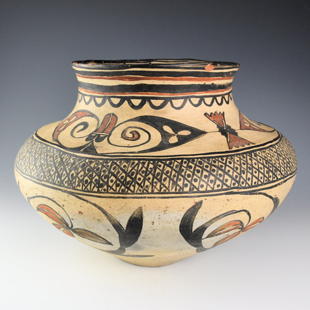 Florentino Montoya (1858–1918) and Martina Peña (1856–1916), became among the best-recognized makers of polychrome pottery. Martina’s shapes had an individually artistic form that is easy to recognize. Her pieces with a rounded neck extending up from an indented shoulder, and her wide-shoulder water jars, are among her classics. They were the first to extend the white slip to the base, creating more space for Florentino’s effusive painted designs. In the early 1900s, they moved for a short while to Cochiti Pueblo and introduced the Cochiti white clay to San Ildefonso as a base color for polychrome pottery. Florentino would often intentionally mismatch the color or designs on his pieces instead of maintaining a consistent repetition of color or imagery on the jar. This water jar has the Cochiti white slip and is painted to the base. The shoulder has a corn design with plant designs above and below. The jar reflects both Martina’s forms and Florentino’s painting. It is in very good conditoin with no cracks, restoration, or repair. There are a few small chips on the rim.