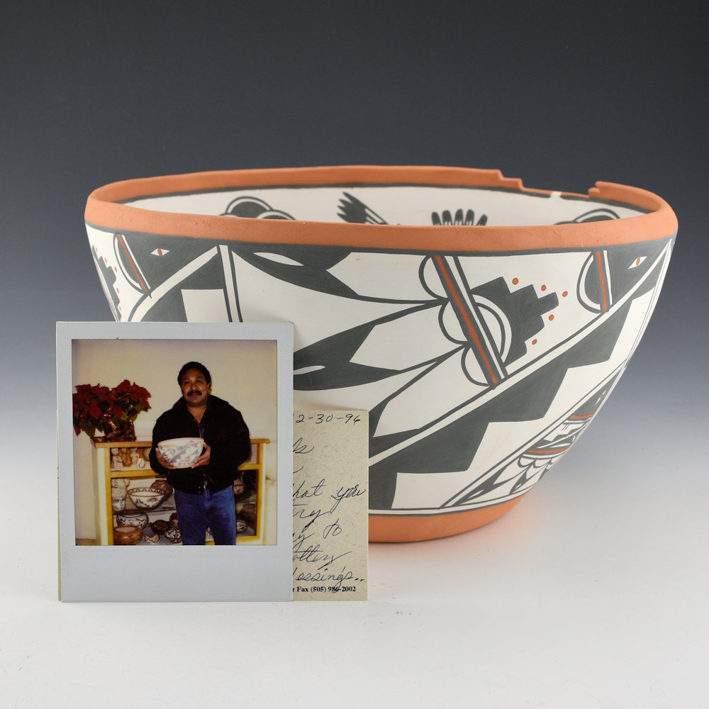 John Montoya was one of the few potters from Sandia Pueblo. It is one of the smaller pueblos in New Mexico. This is a spectacular large bowl that is fully painted on the inside and outside. The bowl itself is round in shape, with a kiva step, or terrace edge. The outside of the bowl has swirling eagles. The inside has three Katsinas, a kiva ladder in the center, and stalks of corn. The bowl is painted with clay slips. It is signed on the bottom, “John Montoya”. It is in excellent condition with no chips, cracks, restoration, or repair. The bowl has a polaroid of him holding the bowl, along with a card signed by him from1996. It is definintely an important piece of his pottery, along with great ephemera and provenance!