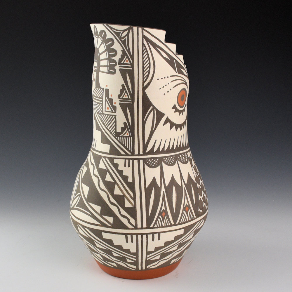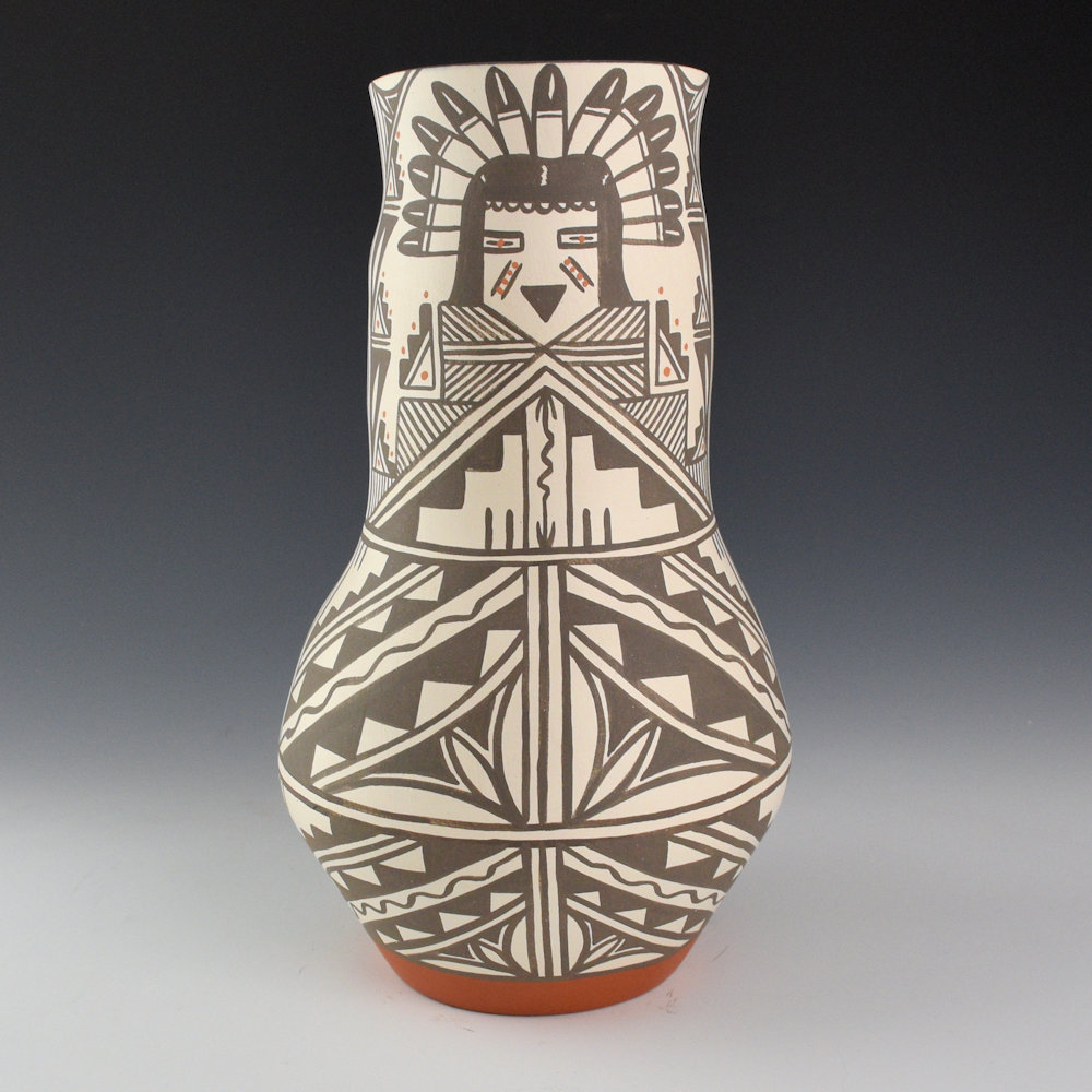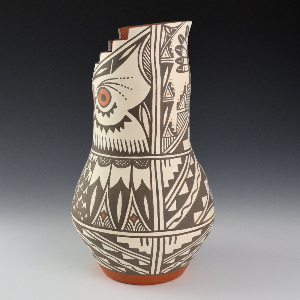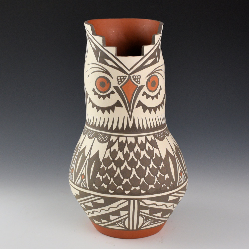 John Montoya was one of the few potters from Sandia Pueblo. It is one of the smaller pueblos in New Mexico.  This is a spectacular tall jar that is fully painted.  One side has an owl as the design.  The rim on that side is carved in a terrace or “kiva step” manner.  The opposite side has a large katsina figure.  The entire piece is exceptional in design and flow of imagery.  The jar is painted with clay slips.  It is signed on the bottom, “John Montoya”.  It is in excellent condition with no chips, cracks, restoration, or repair.   provenance!