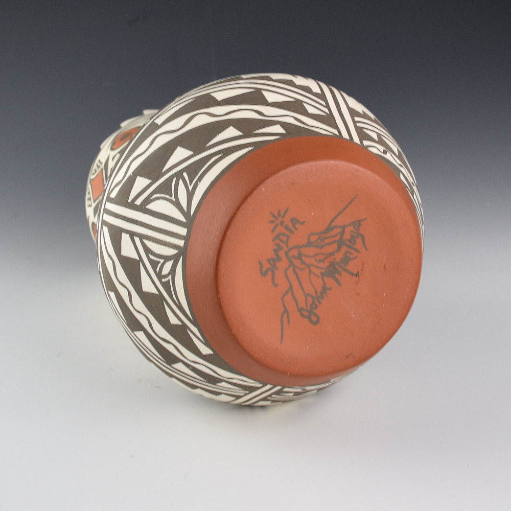 Montoya, John – 9″ Tall Sandia Pueblo Jar with Owl and Katsina Figure (1998)