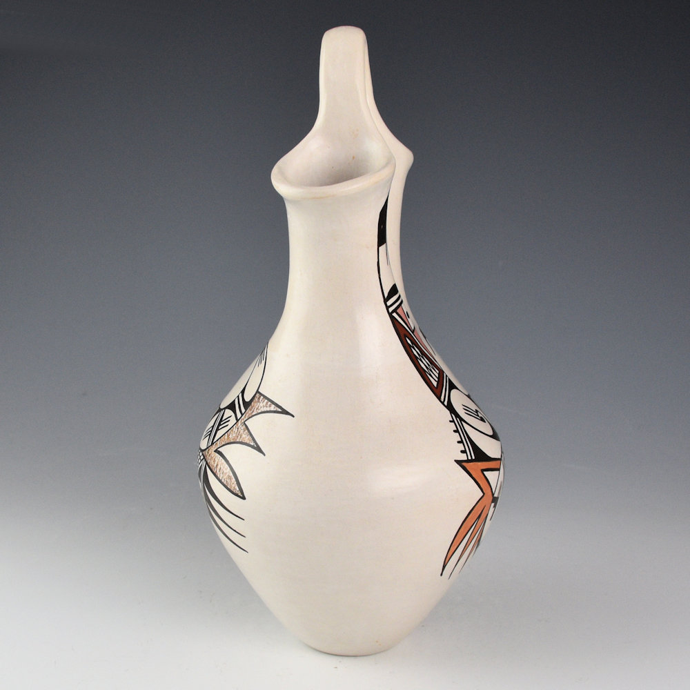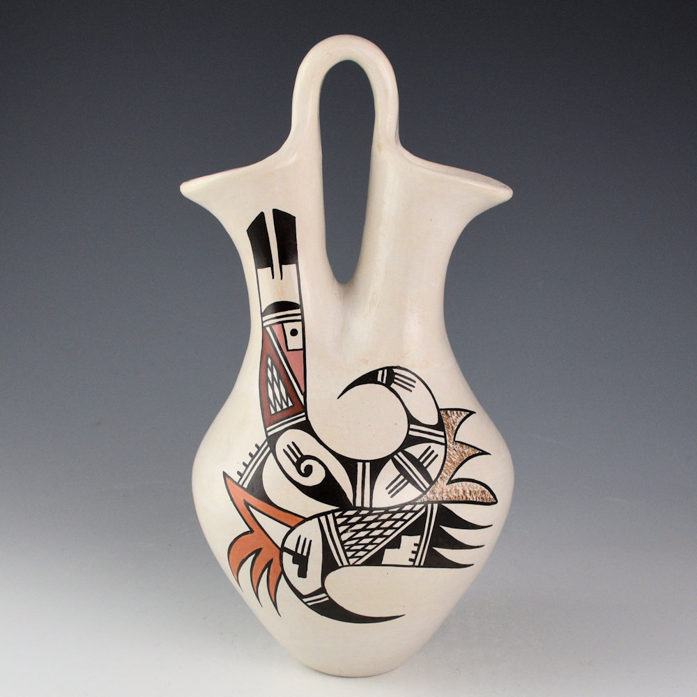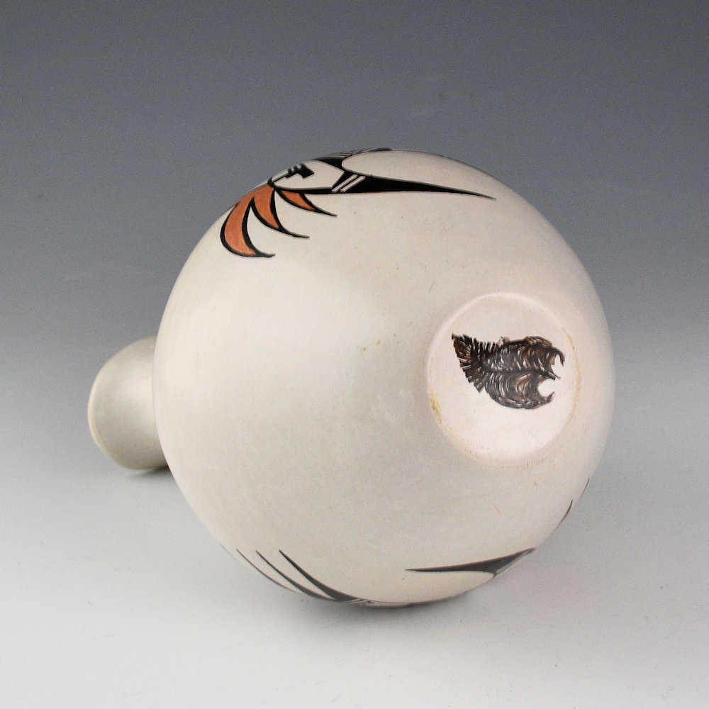 This is a classic wedding vase is by Helen “Featherwoman” Naha. It is her classic shape with the wide, round shoulder and elongated spouts. The design has two birds on each side. The tails of one of the birds go up the spout. The designs are painted with bee-weed (black) and three colors of clay slips. It was only in the late 1980s that she began to use additional colors of clay on her pottery. The white is a kaolin clay which is first applied to the jar and then stone polished. The wedding vase is signed on the bottom with a feather, which was Helen’s hallmark. The vase is in excellent condition with no chips, cracks, restoration or repair.