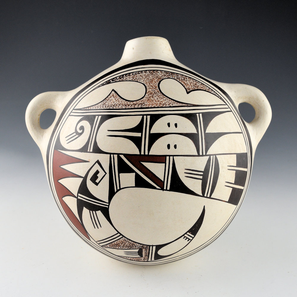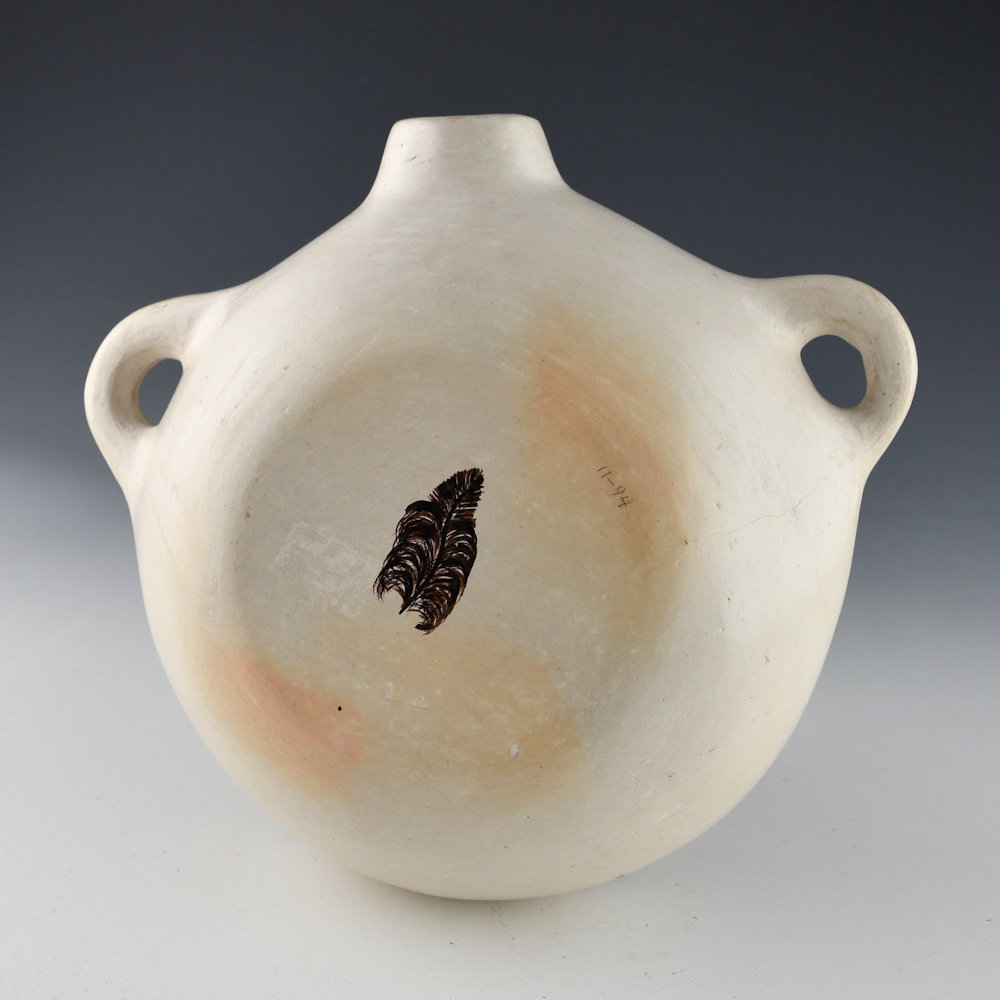 This is a highly decorated canteen by Helen “Feather Woman” Naha. She was known for her traditional white-ware pottery. This canteen is from the 1980s. It is flat on the back and round on the front. The canteen has a swirling bird as its design. Above the bird are cloud and wind designs. We know it is from the 1980s because of the coloration of the clay. It is painted with bee-weed (black) and clay slips. It was traditionally fired, and there are slight color variations from the firing. It is in excellent condition with no chips, cracks, restoration or repair. It is signed on the bottom with her hallmark feather.