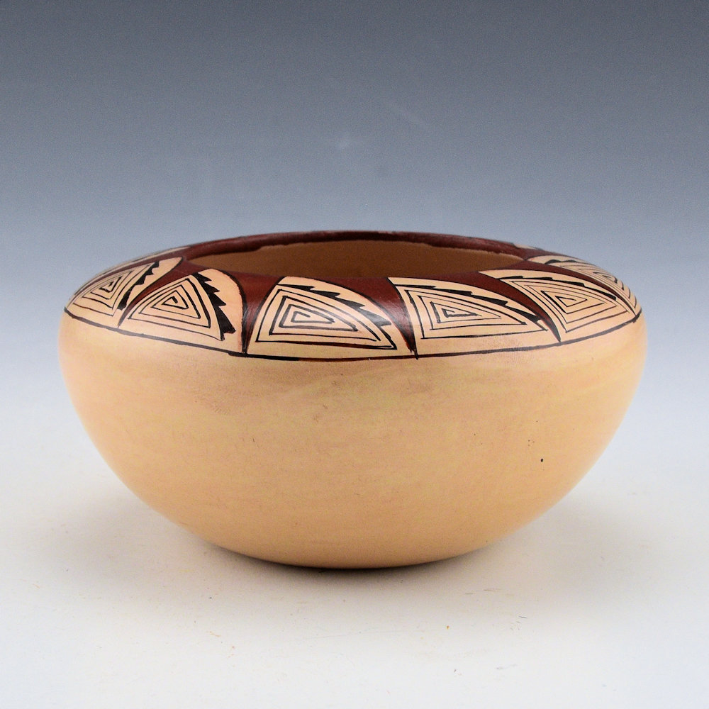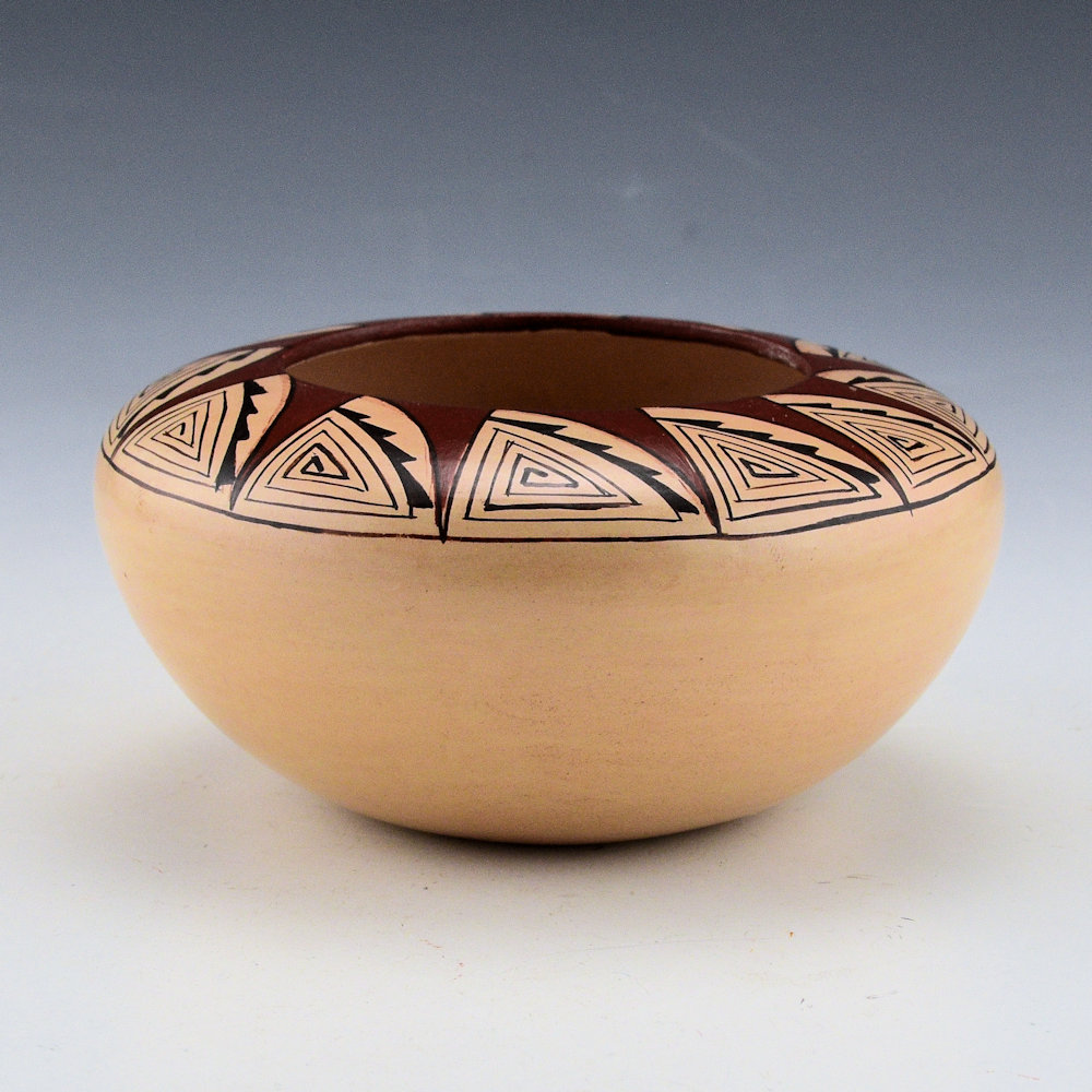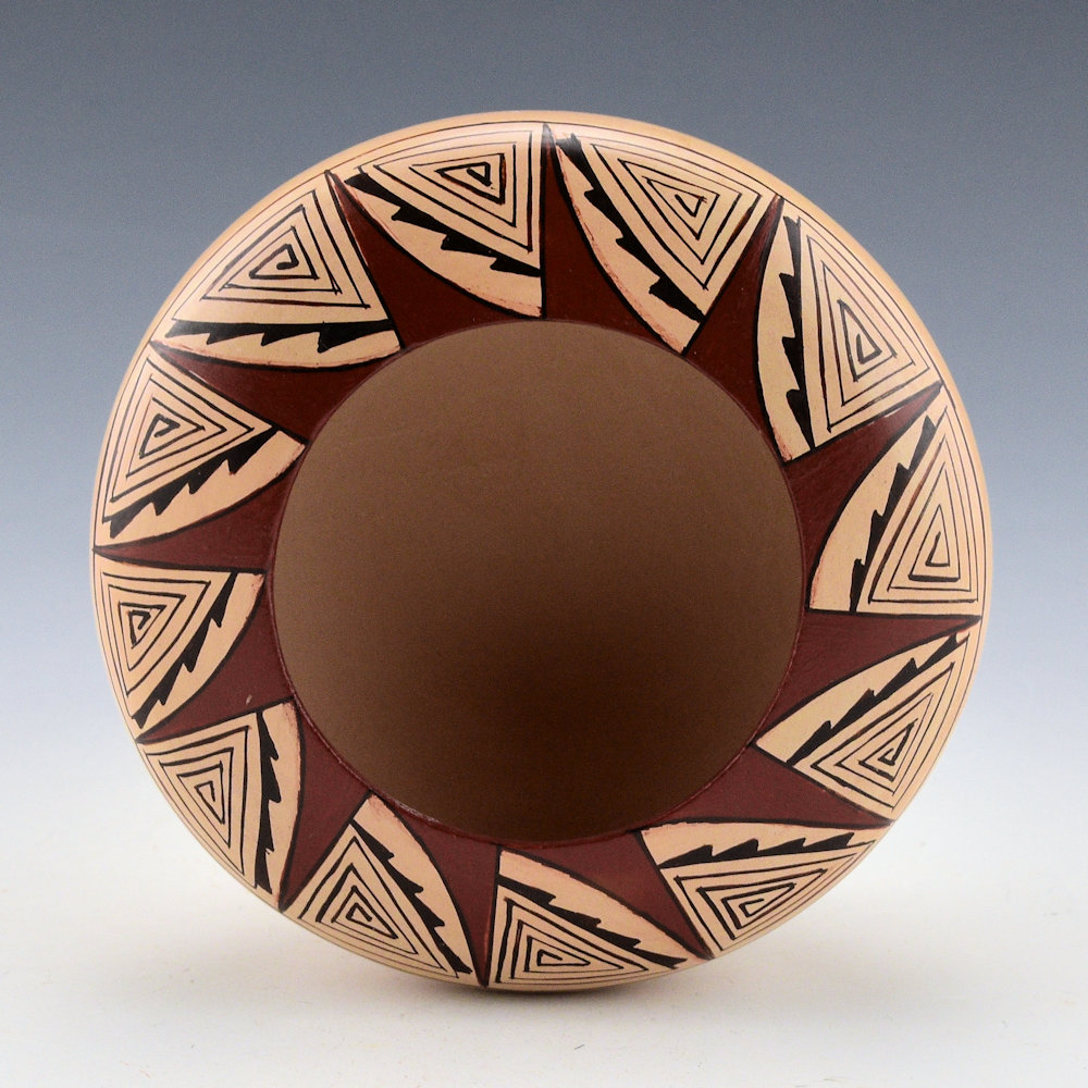 Nona Naha was a Tewa-Hopi of the Corn Clan who began making pottery in 1988. She was the daughter of Sylvan and Edith Nash and the wife of Terry Naha. She learned to make pottery from Helen Naha and her daughters, Sylvia and Rainy Naha. This bowl is thin-walled in her signature style It almost feels as if it is made of paper! The piece is fully polished, and the top is painted with a spiraling sun design. There is red clay used to create the rays of the sun. The remainder is tightly painted with thin lines! The bowl was traditionally fired. It is signed on the bottom, “Nona Naha”. It is in excellent condition with no chips, cracks, restoration, or repair.