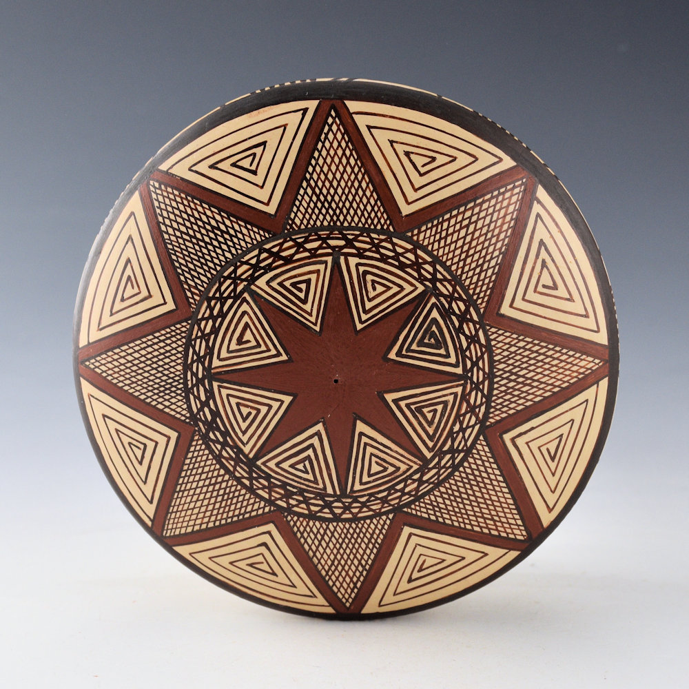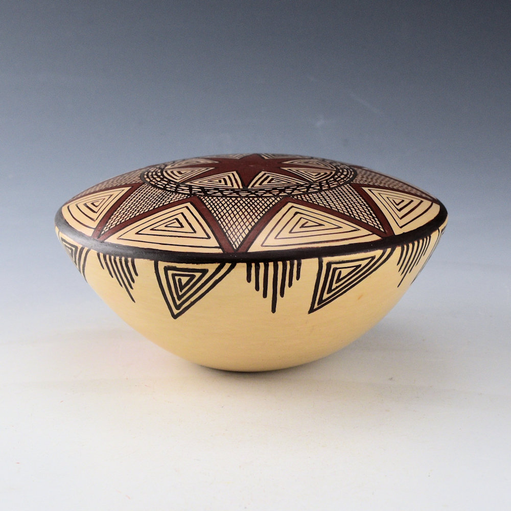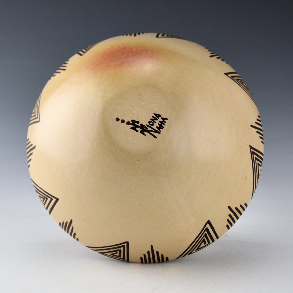 Nona Naha was a Tewa-Hopi of the Corn Clan who began making pottery in 1988. She was the daughter of Sylvan and Edith Nash and the wife of Terry Naha. She learned to make pottery from Helen Naha and her daughters, Sylvia and Rainy Naha. This seedpot is thin-walled in her signature style It almost feels as if it is made of paper! The piece is fully polished, and the top is painted with a double star. The central star is red and the edges of the outer star are also slipped with red clay. The remainder is tightly painted with thin lines! Below the shoulder are bands of rain design. The seedpot was traditionally fired. It is signed on the bottom, “Nona Naha”. It is in excellent condition with no chips, cracks, restoration, or repair.