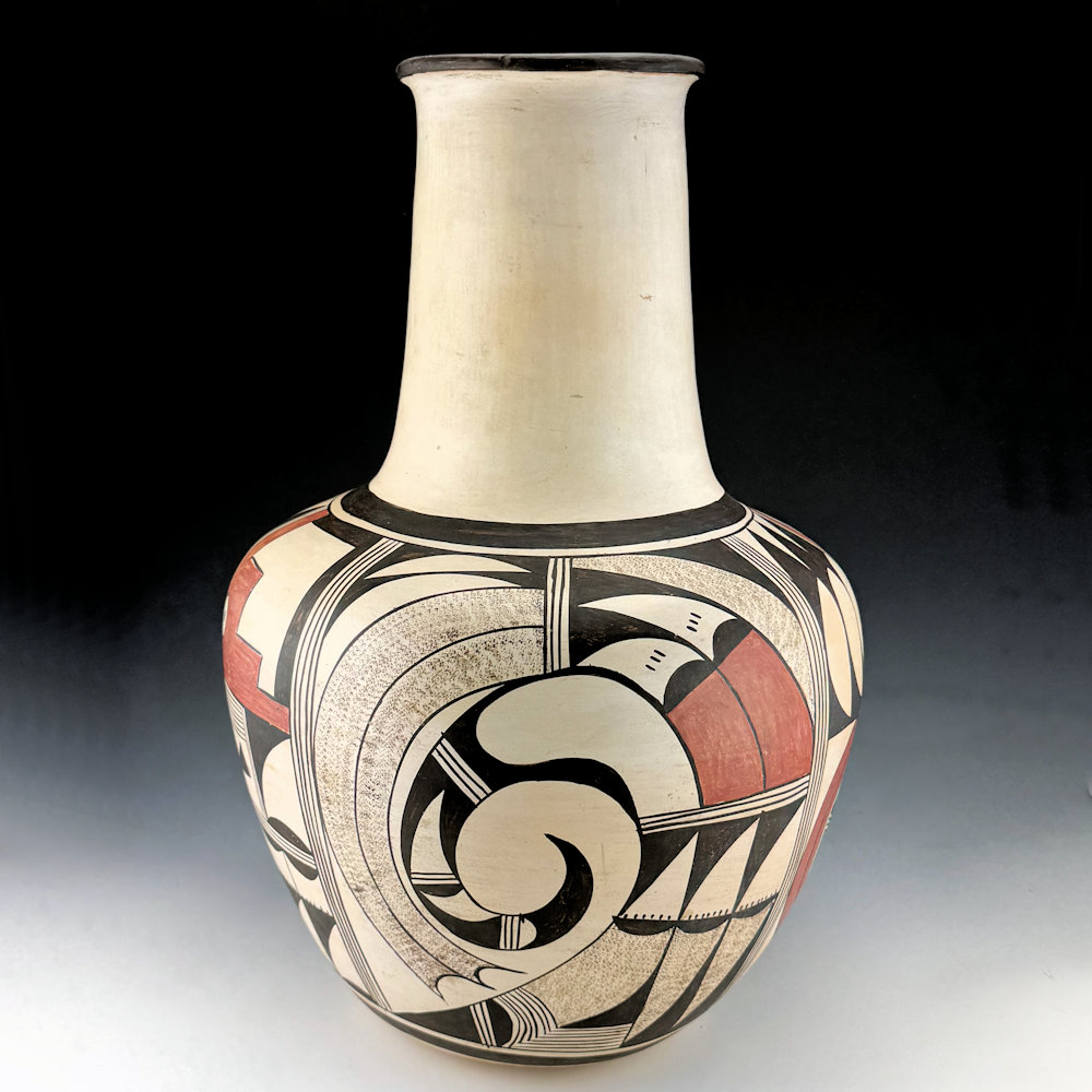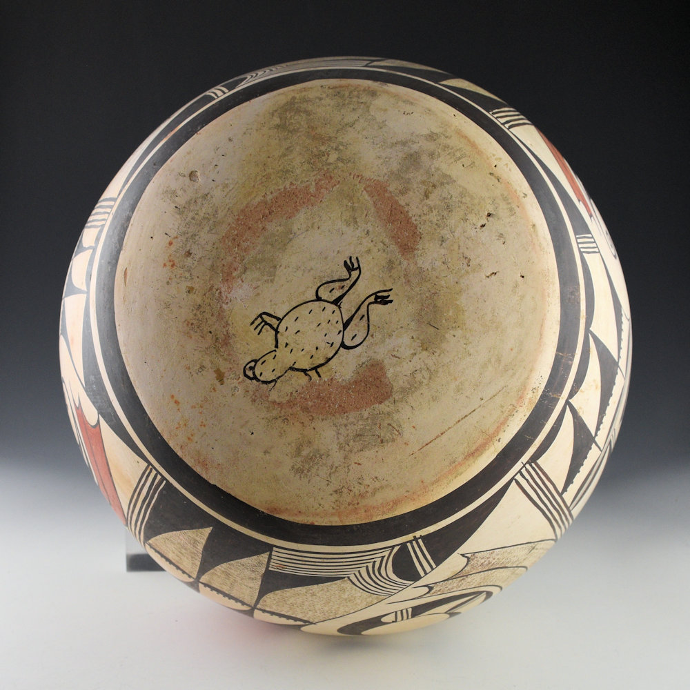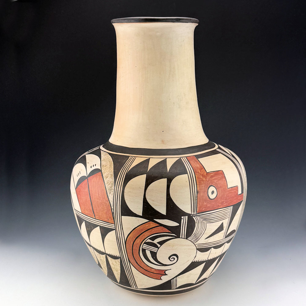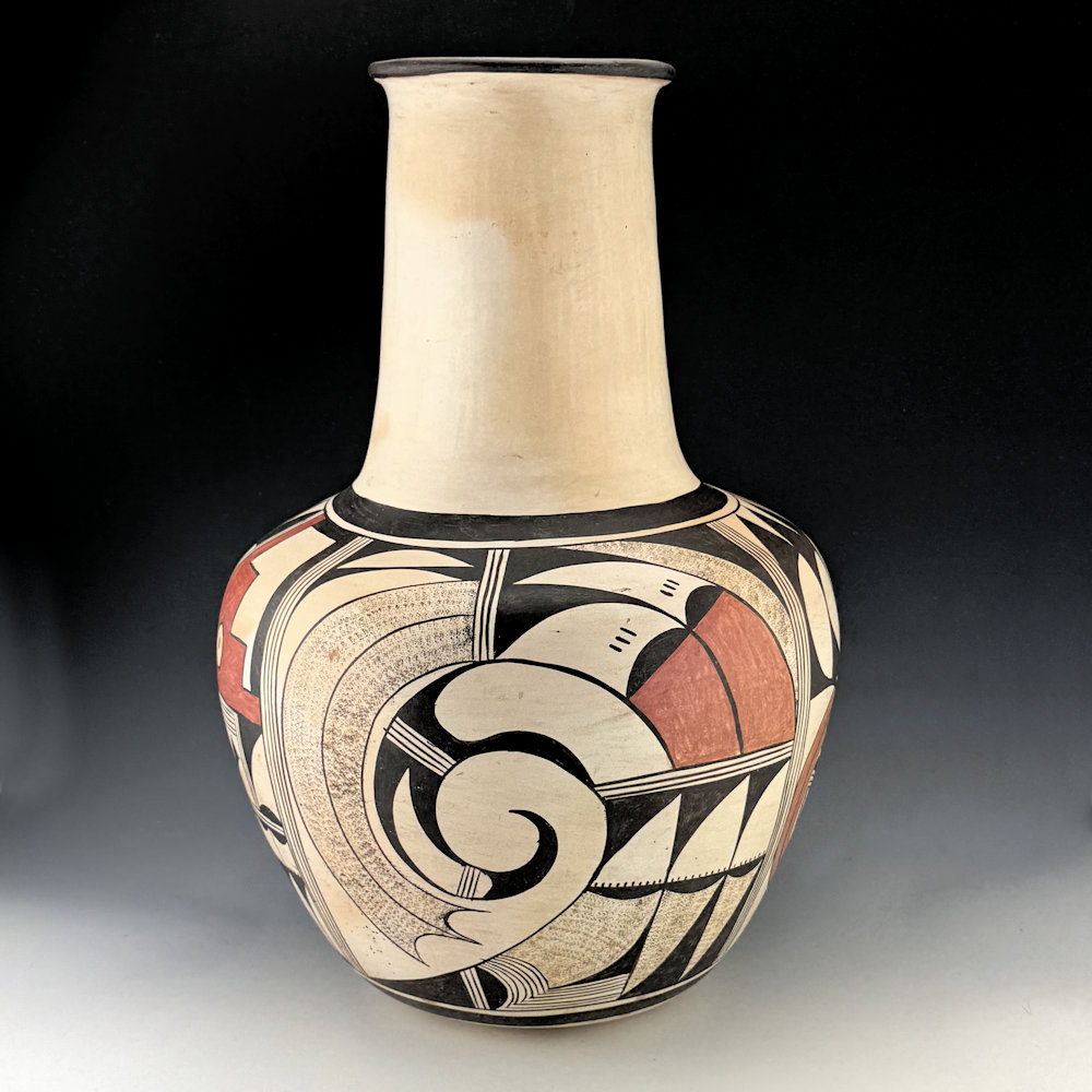 WOW! This is an amazing, large, long-neck jar by Paqua Naha. She was the mother of noted potter Joy “Frogwoman” Navasie and the mother-in-law of Helen “Featherwoman” Naha. She is known for her traditional designs and use of the various colors of clay at Hopi. She developed the Hopi whiteware around 1951-2. She was the first to sign her pottery with her Frog Hallmark, as “Paqua” means Frog in Hopi. This jar has a round body and an elongated neck. It is amazing to me how she was able to fire a piece this size, as well as having it survive over time. It is in amazing condition! The body of the jar has large panels with swirling birds and cloud geometrics. The piece is painted with bee-weed (black) and highlighted with red clay. The base of the jar is slipped with white clay, indicating a date from 1951-55. The designs are bold and match the shape of the jar. The rim of the jar is painted with bee-weed (black) and the inside of the neck is also polished. The jar was traditionally fired so there are color variations across the surface of the piece. This white clay is the same white for which Joy Navasie and Helen Naha became famous in their pottery. The jar was traditionally fired and signed with her hallmark frog. It is in excellent condition with no chips, cracks, restoration or repair.